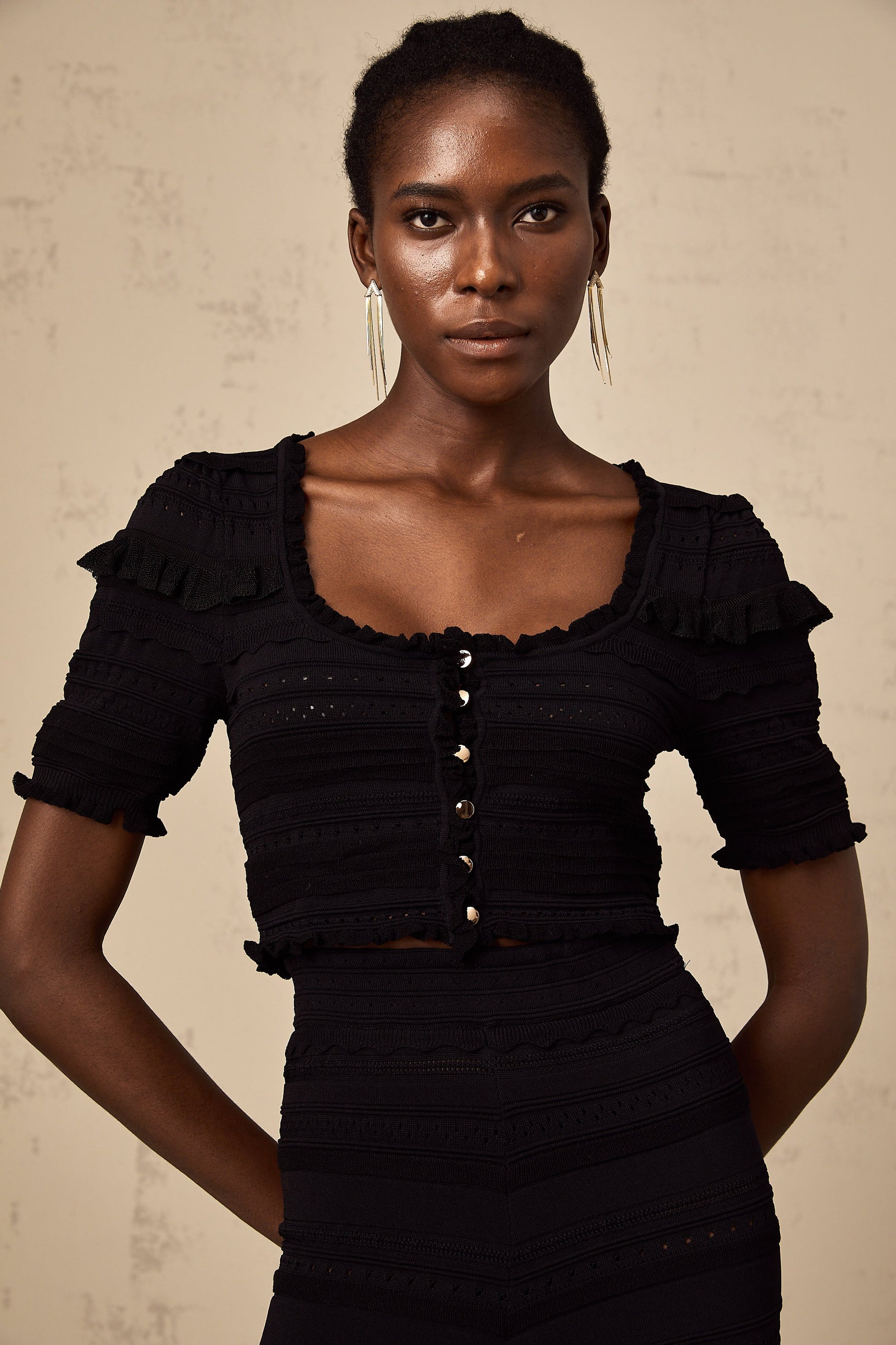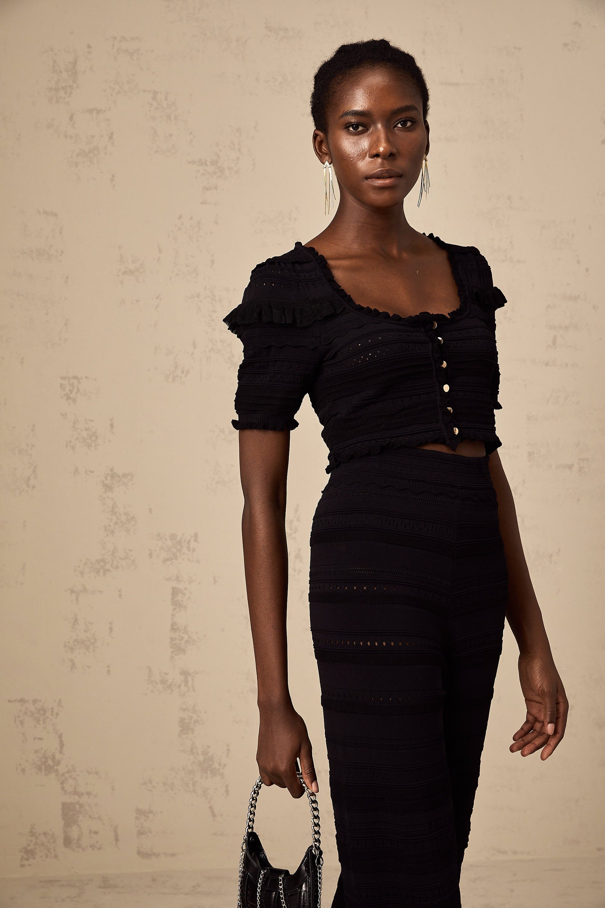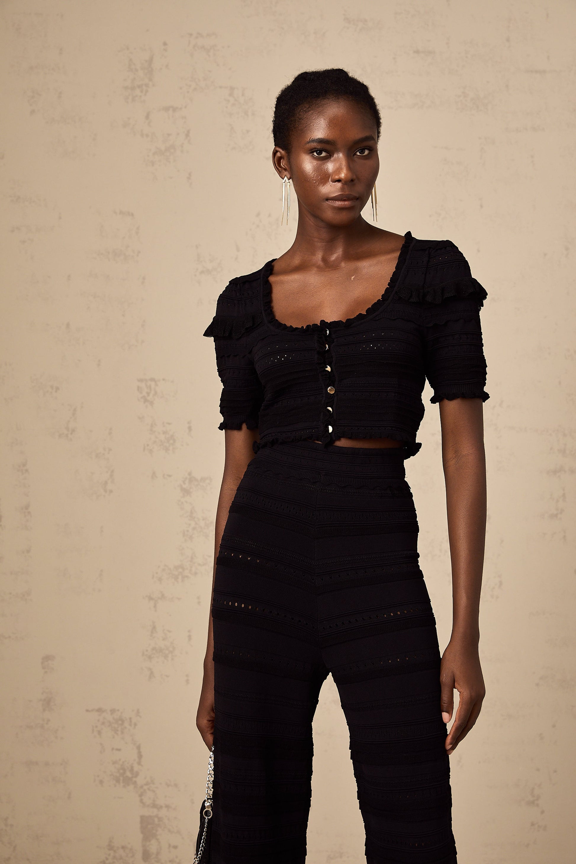 Charlotte black knitted ruffled top & trousers matching set