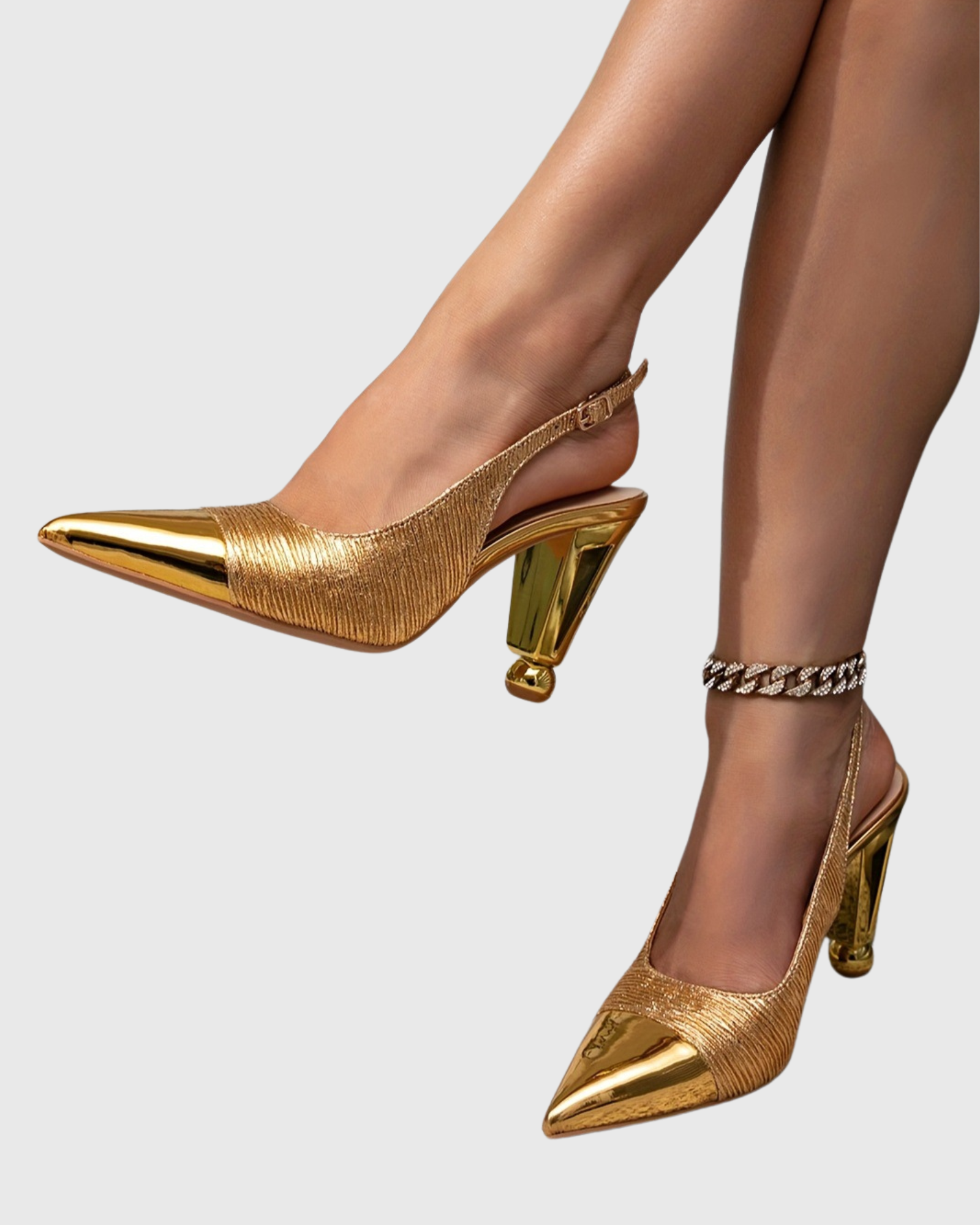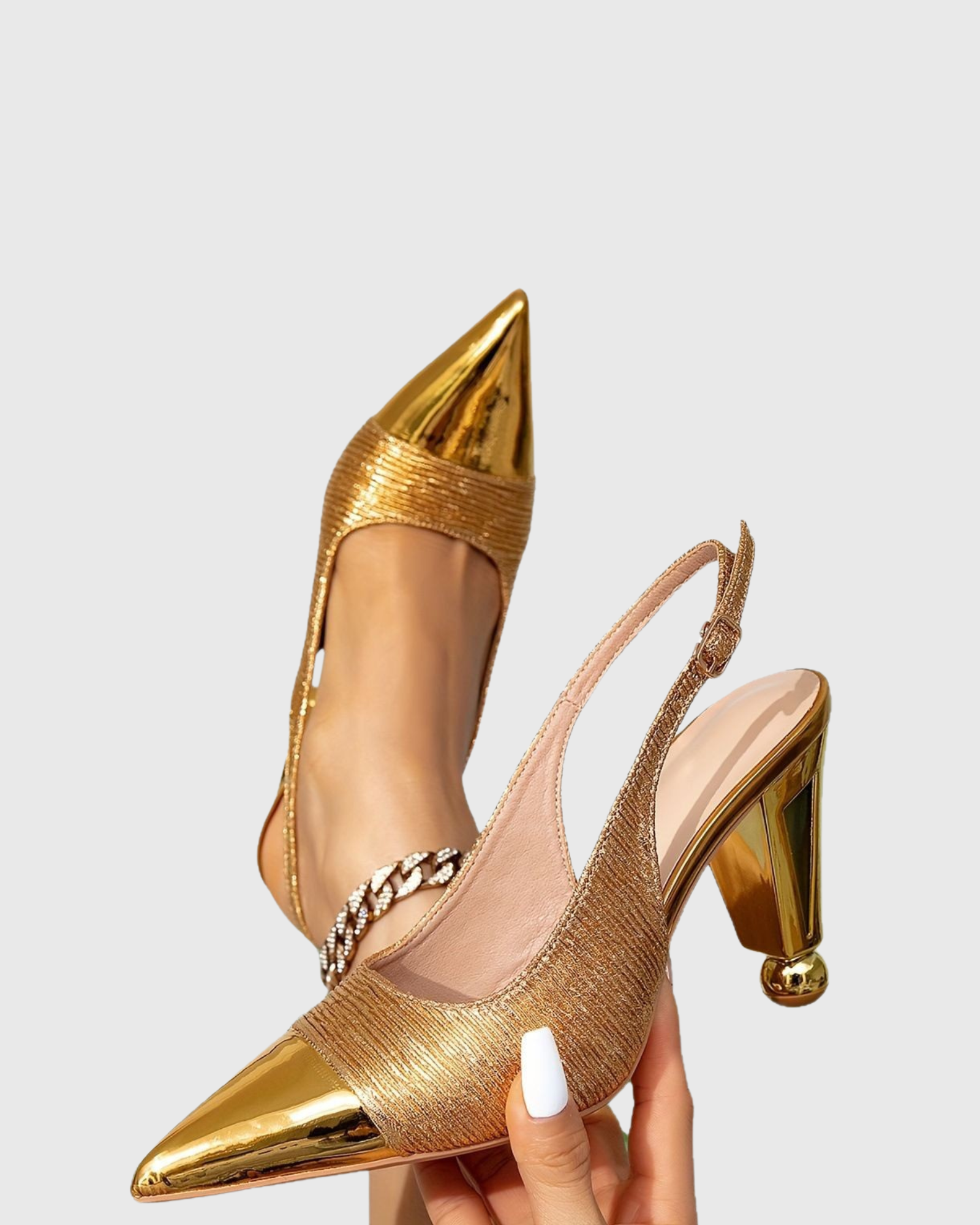 Elevate your evening attire with our Chloe Sparkle Ruch Slingback Pumps in dazzling gold. These eye-catching heels feature elegant ruching detail and a comfortable slingback design that ensures both stability and style. Perfect for special occasions, these statement pumps will transform any outfit from ordinary to extraordinary while keeping you comfortable all night long.