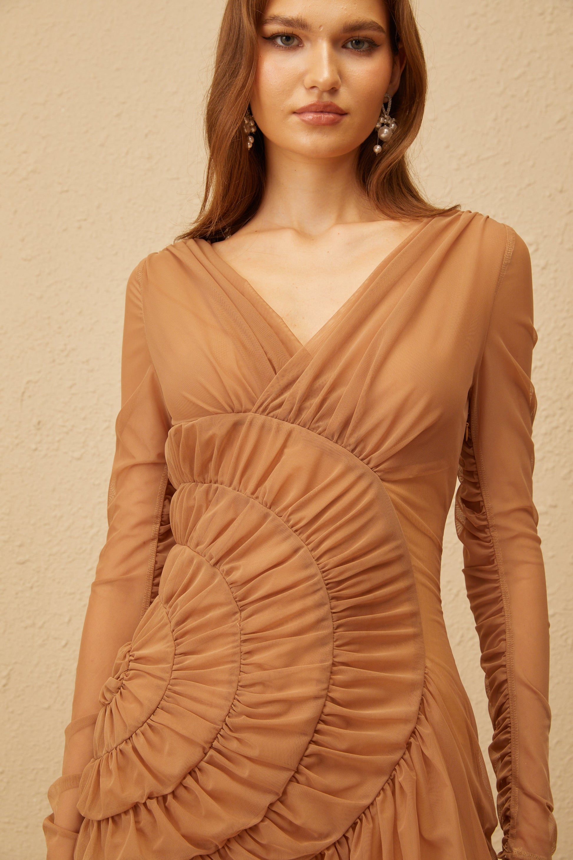 Claudia Brown Ruched Tulle Mini Dress