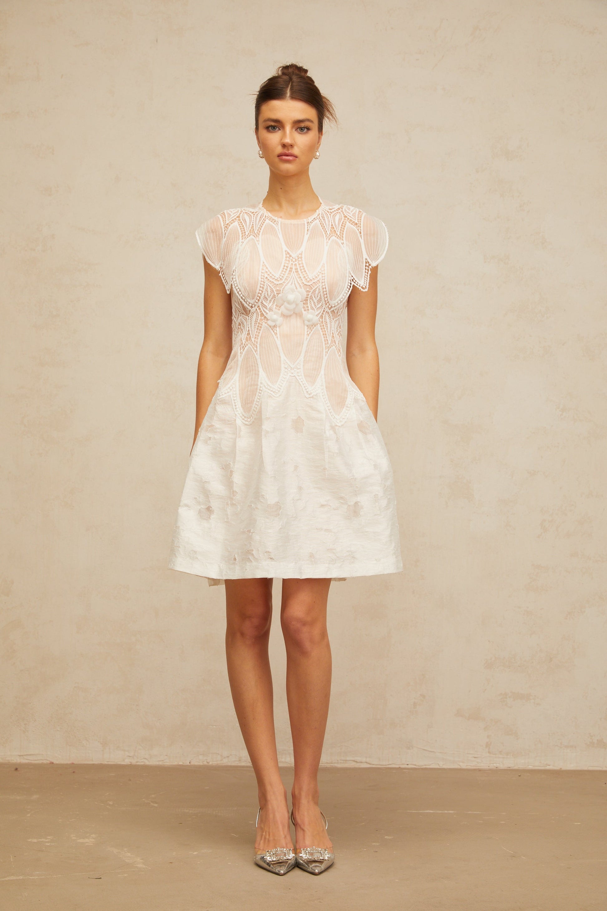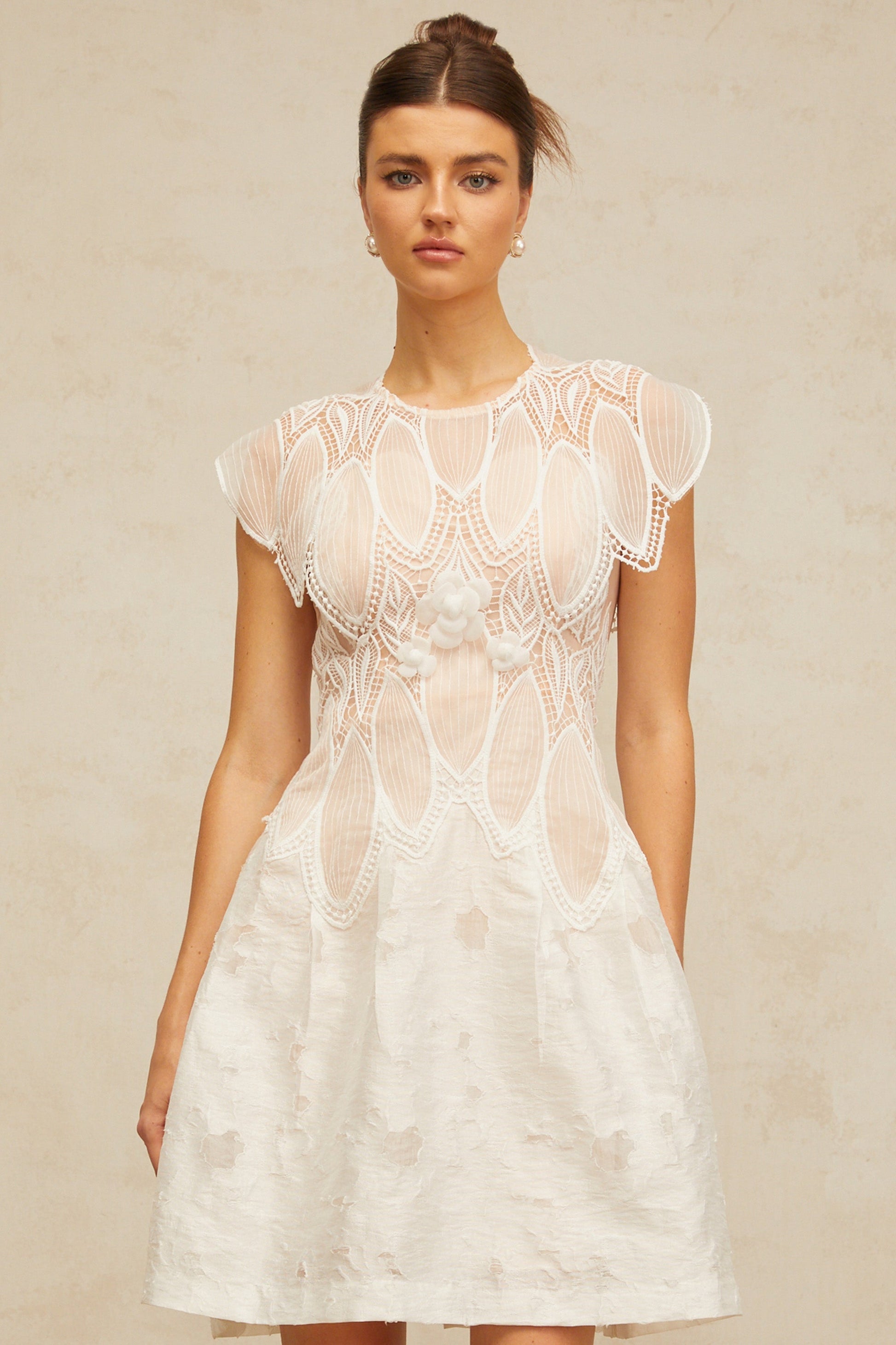 Clémence white 3D-petal corded-lace mini dress