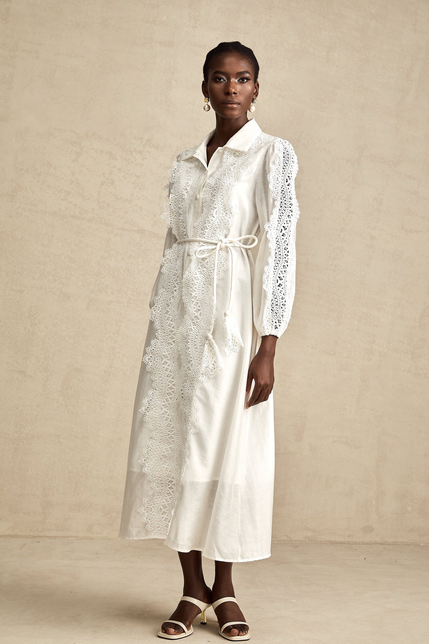 Colette white lace-detail tied-waist midi dress