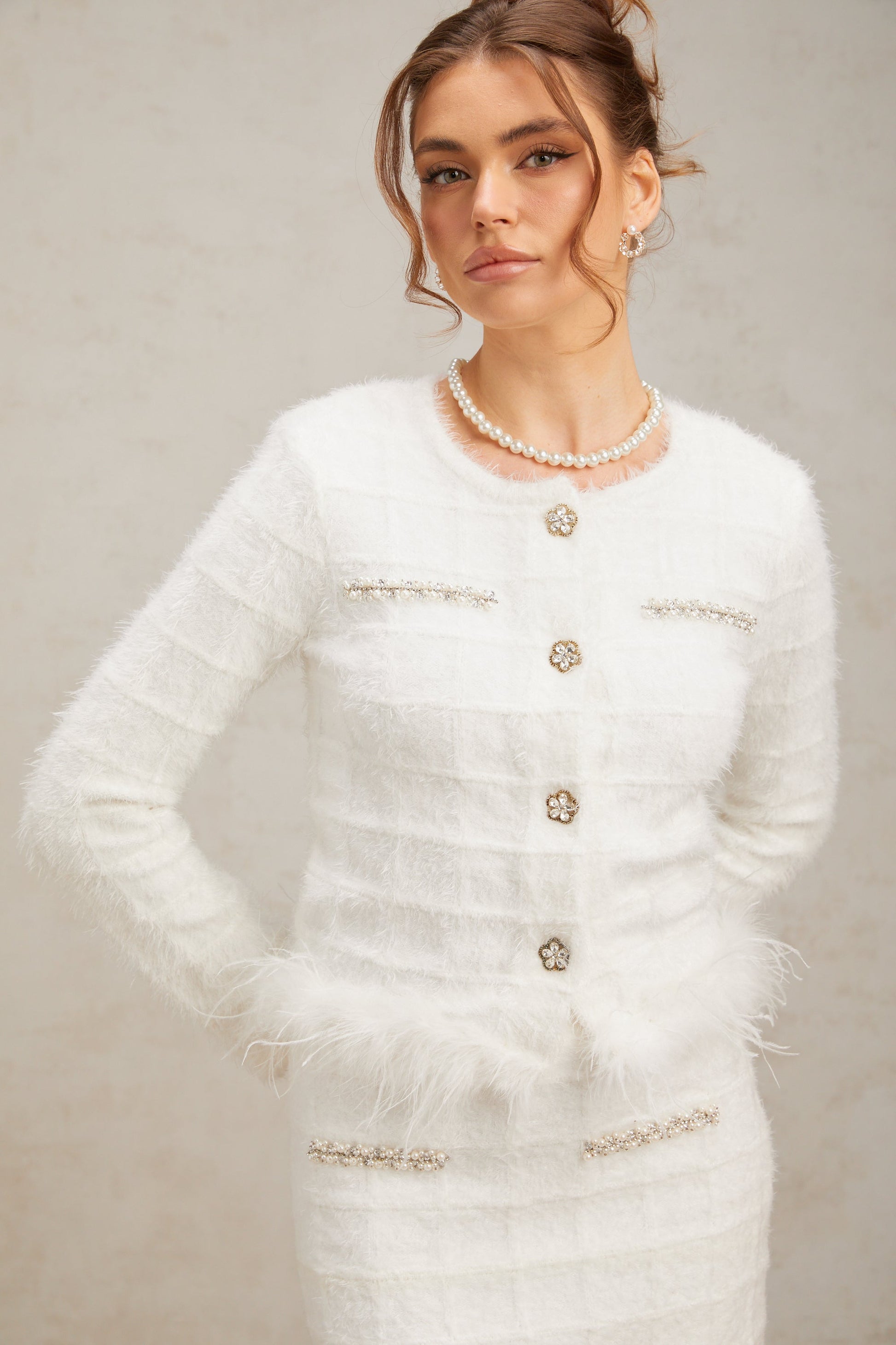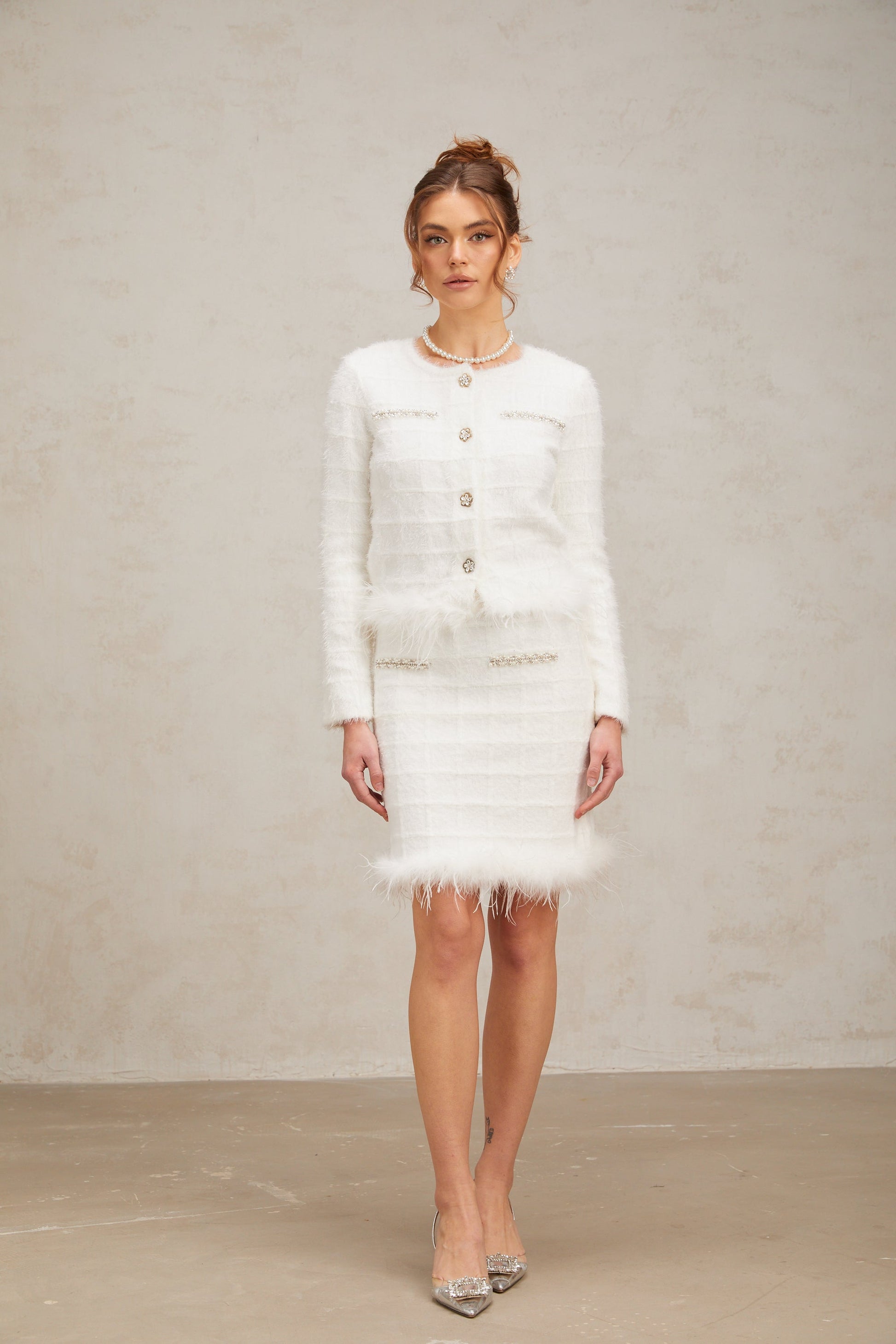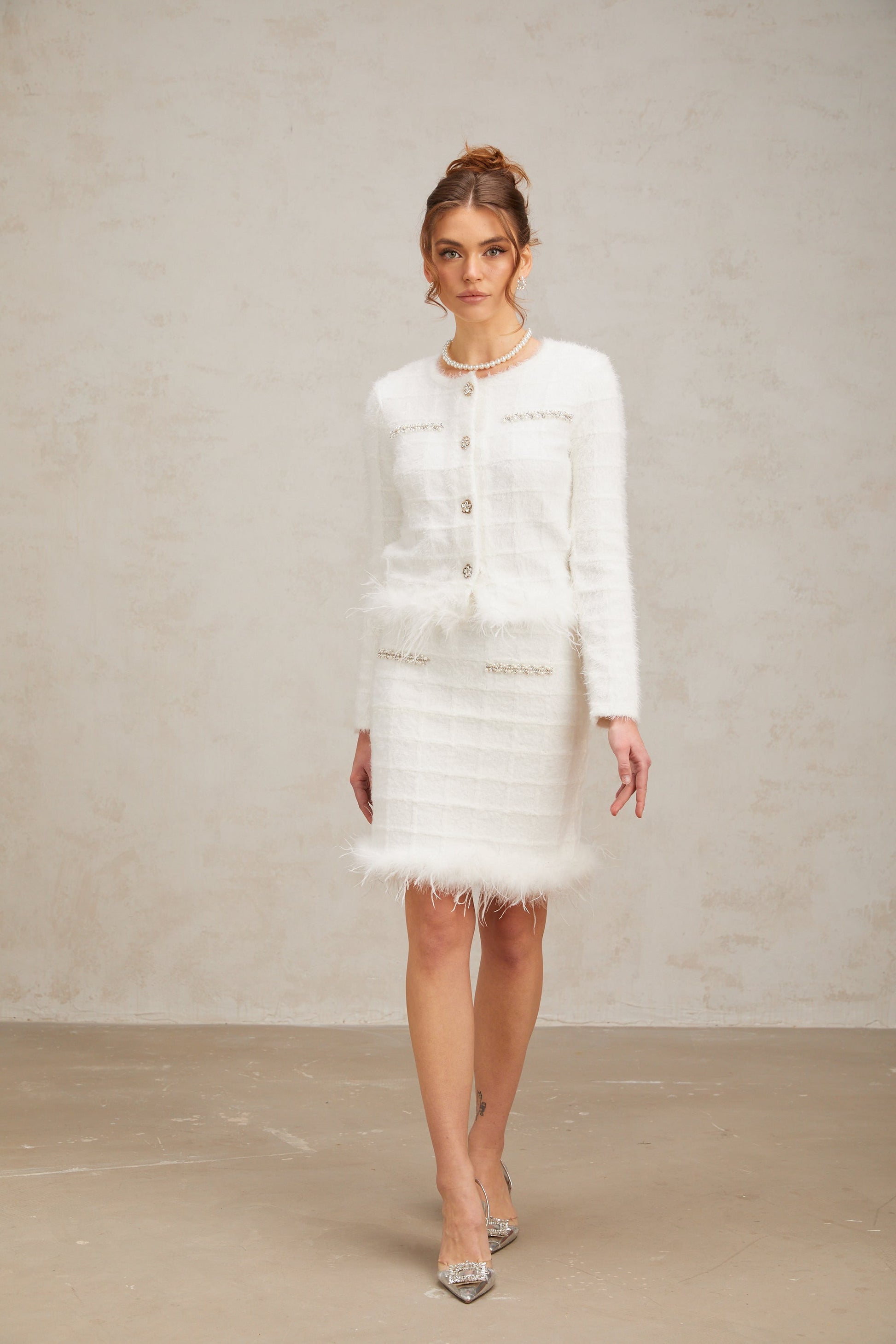 Cora white feather waffle knit cardigan & skirt matching set