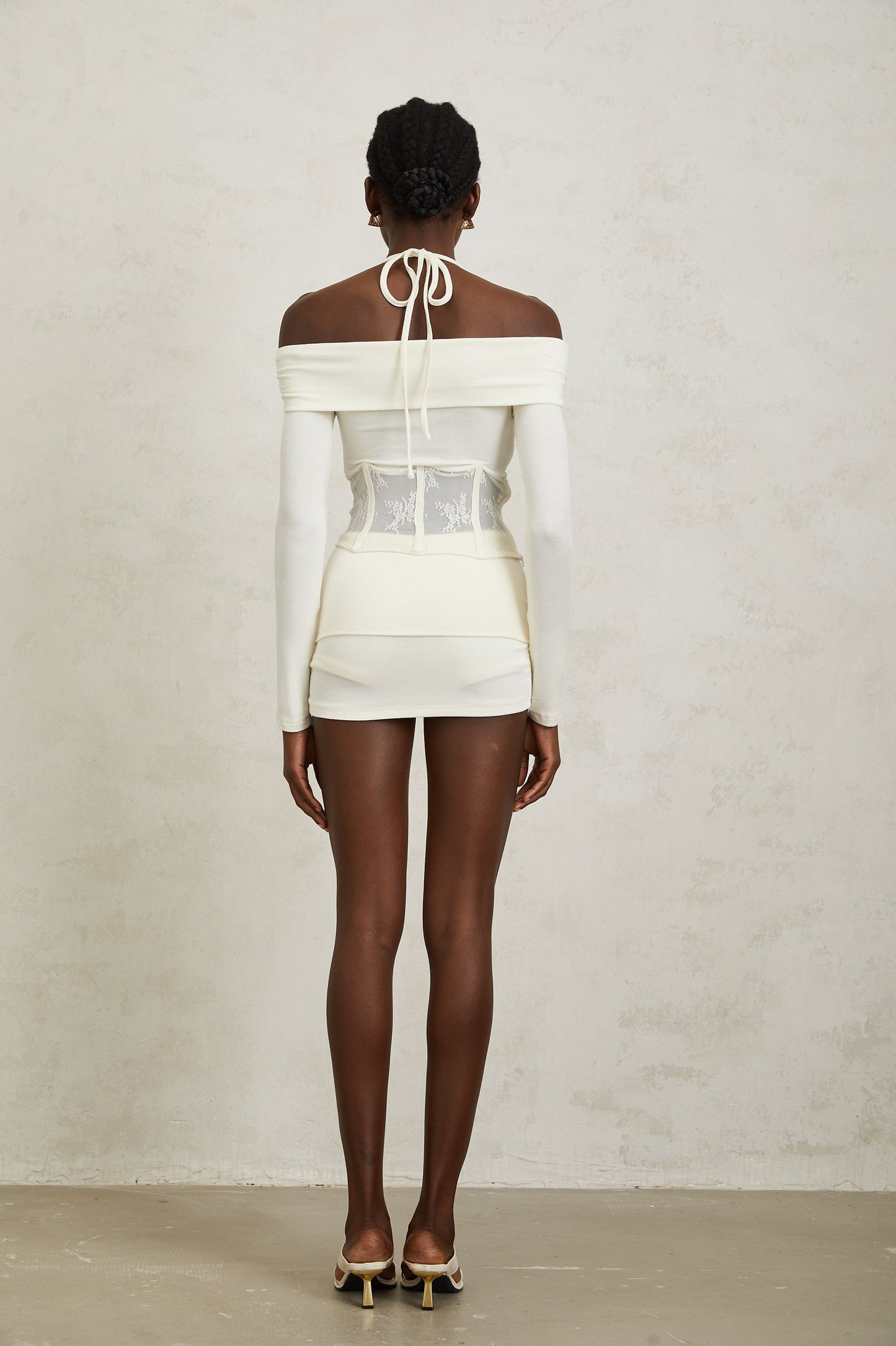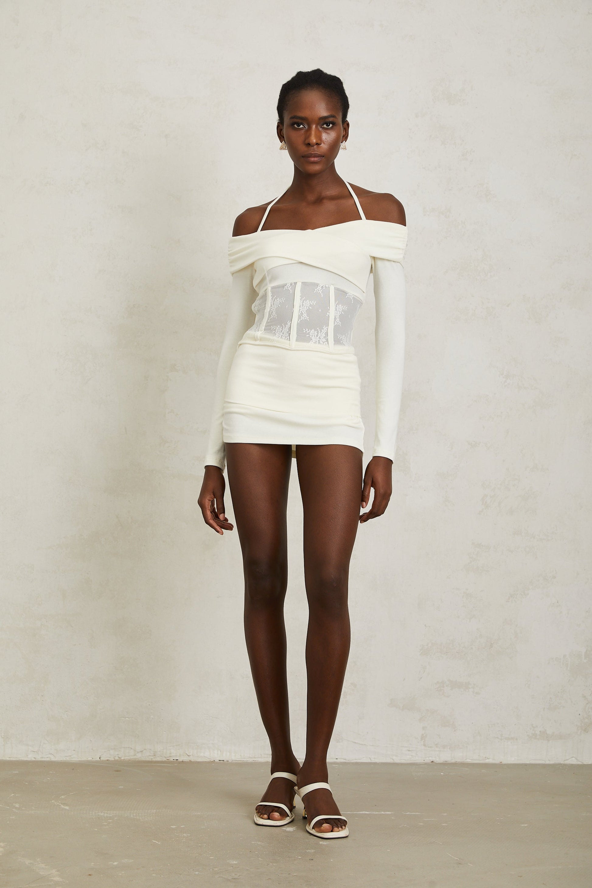Coralie White Lace Panel Knit Blouse & Skirt Set