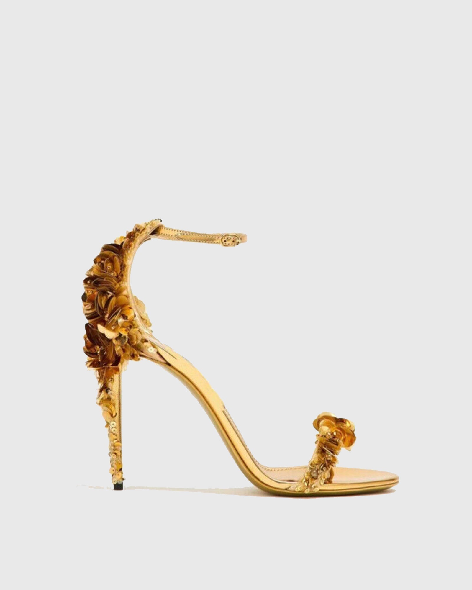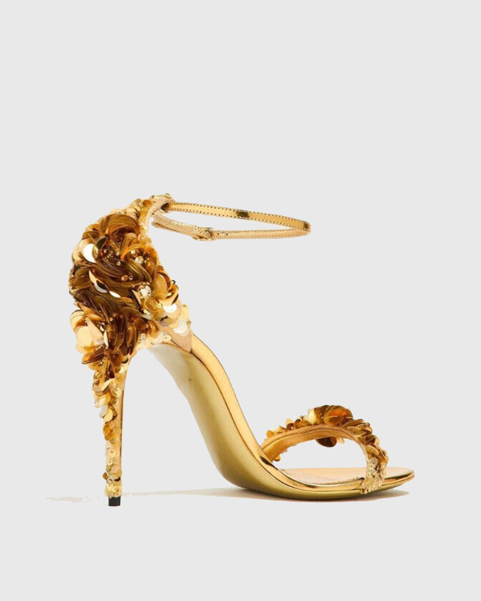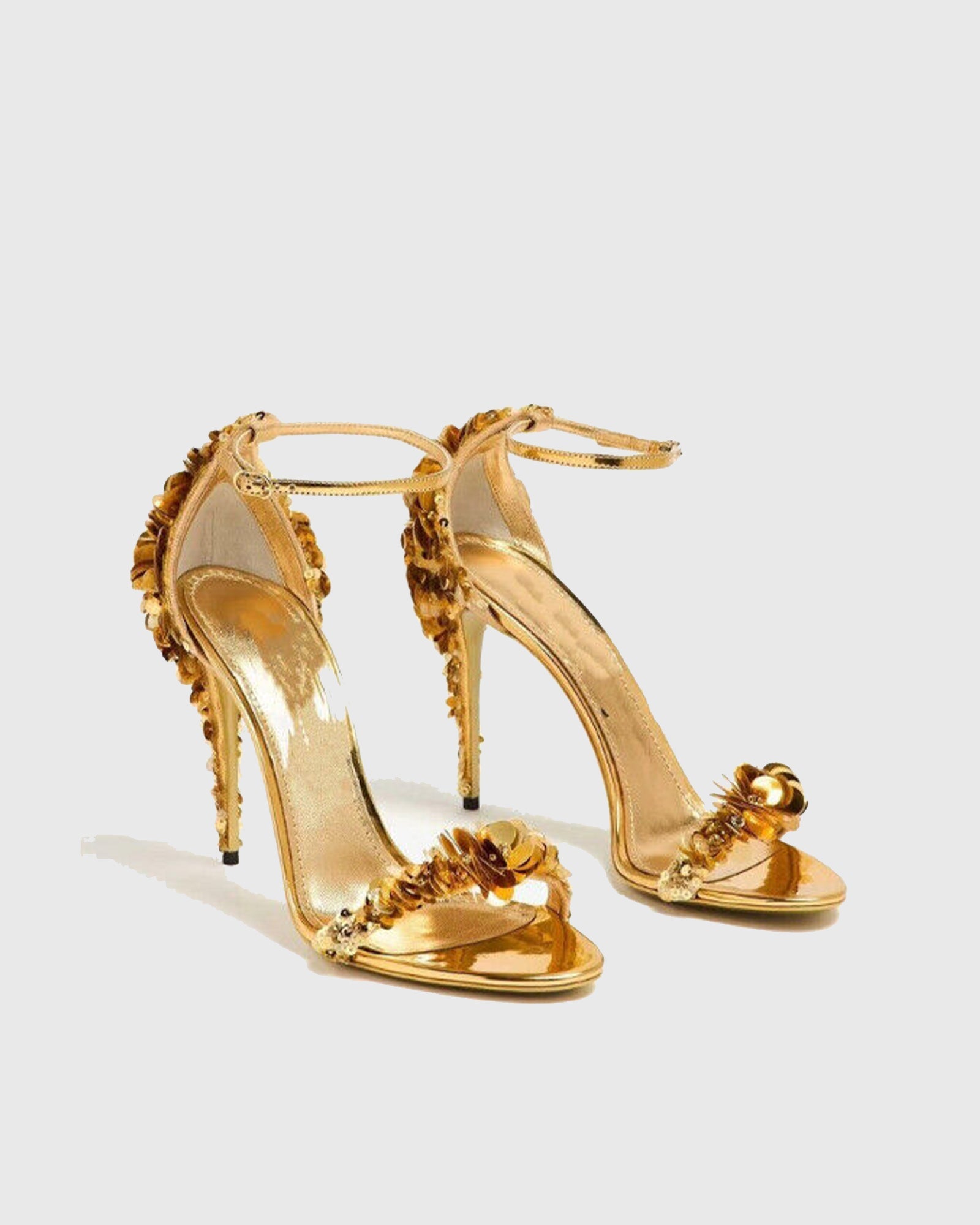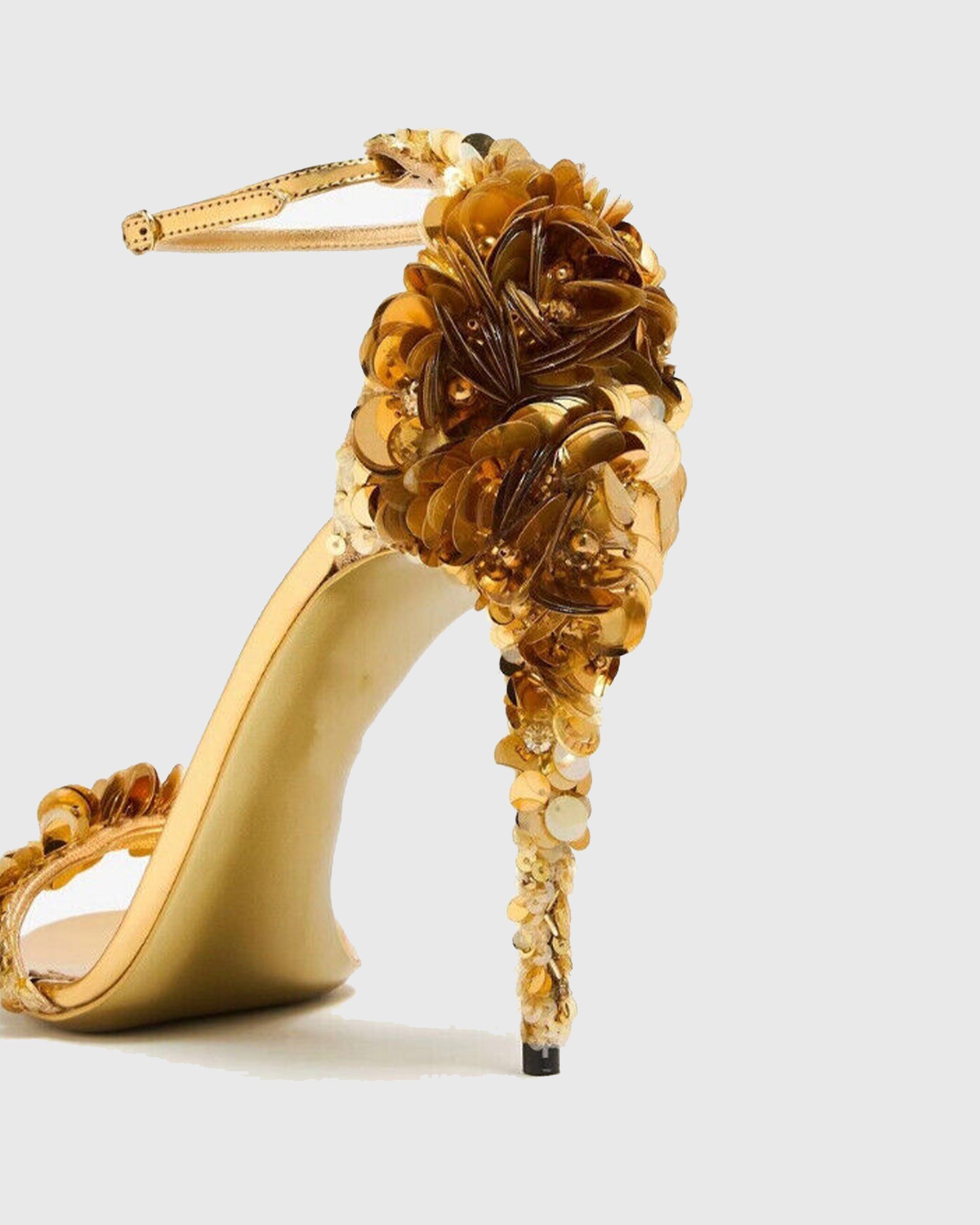 Elevate your style with our Cornelia Flower Sequin Strap Sandals in Gold. Adorned with stunning sequin straps shaped like delicate flowers, these sandals add a touch of glamour to any outfit. Comfortable and stylish, they are perfect for any occasion. Step into effortless elegance with these sandals today!