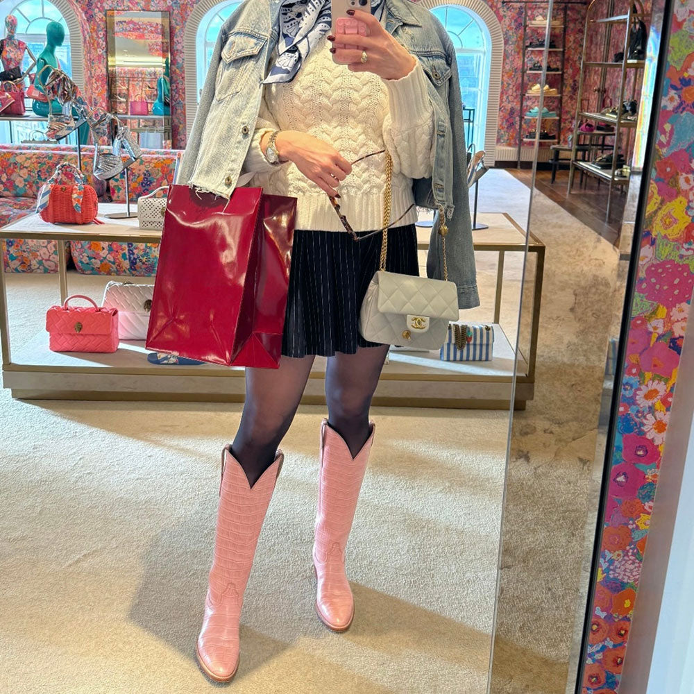 Embossed Low Block Heel Knee High Pink Cowboy Boots for Women