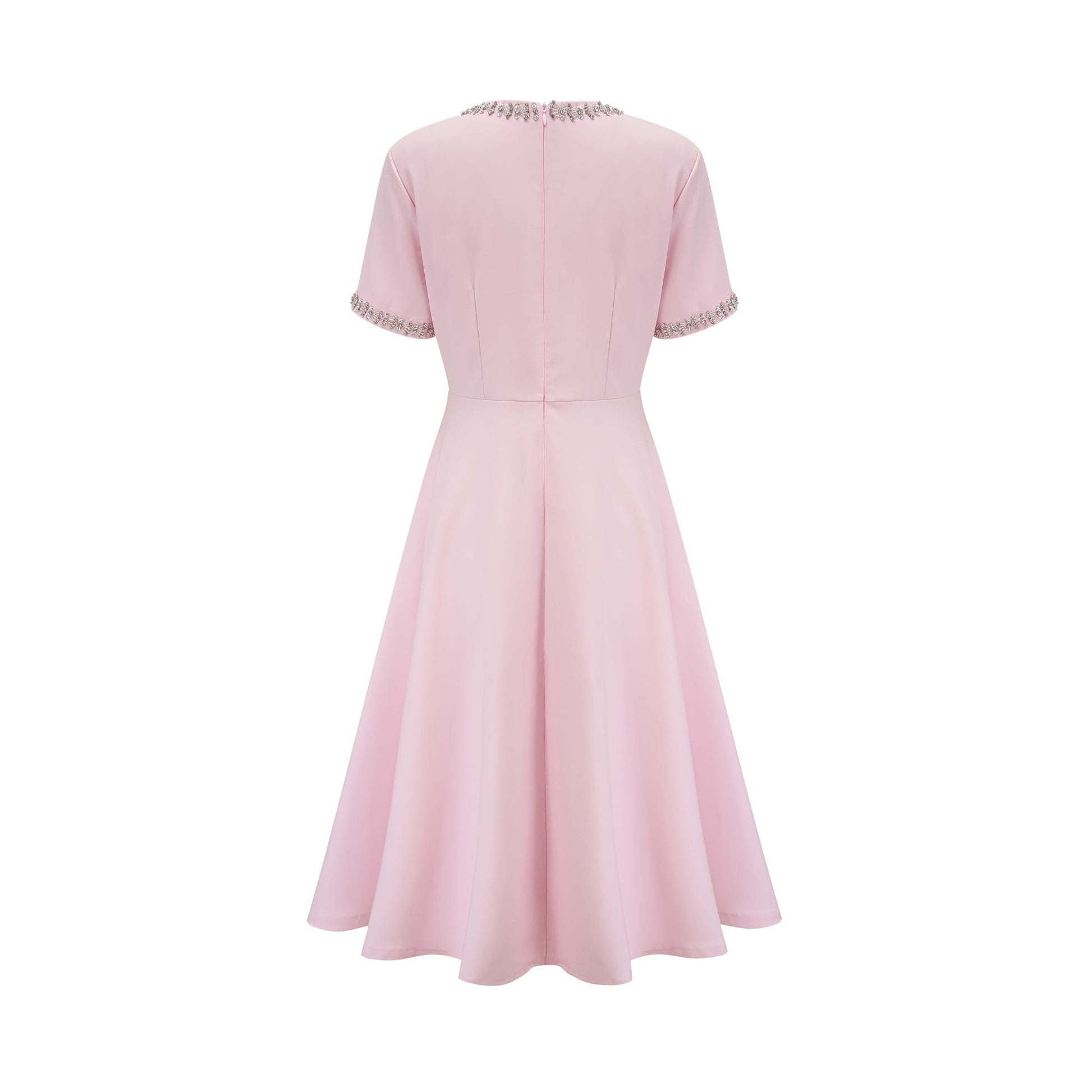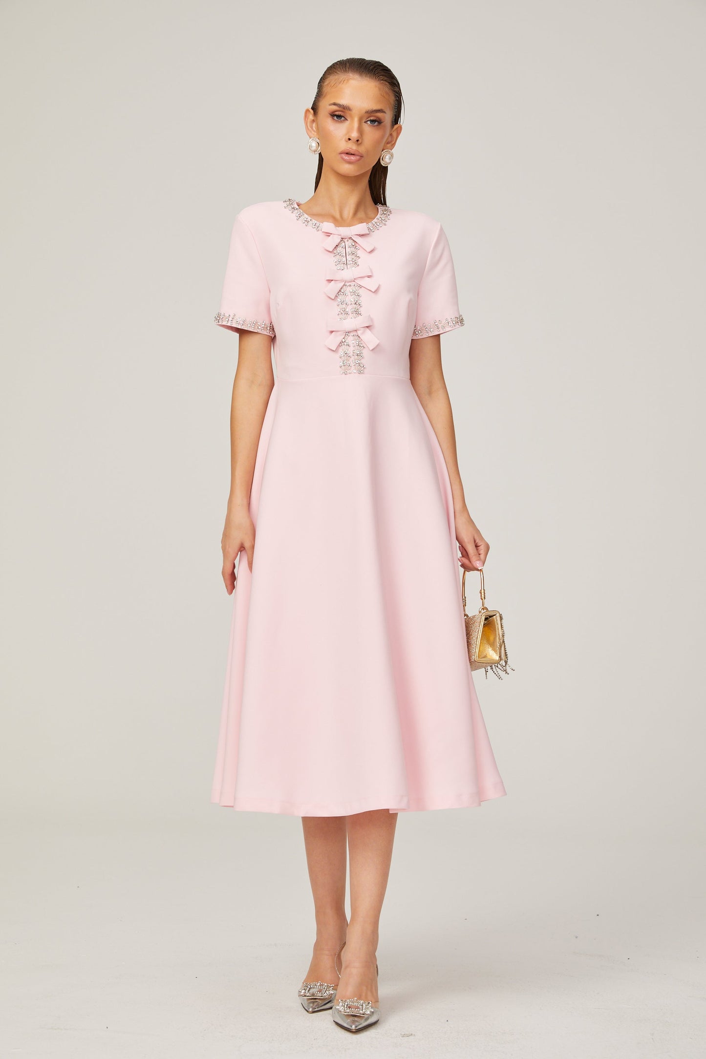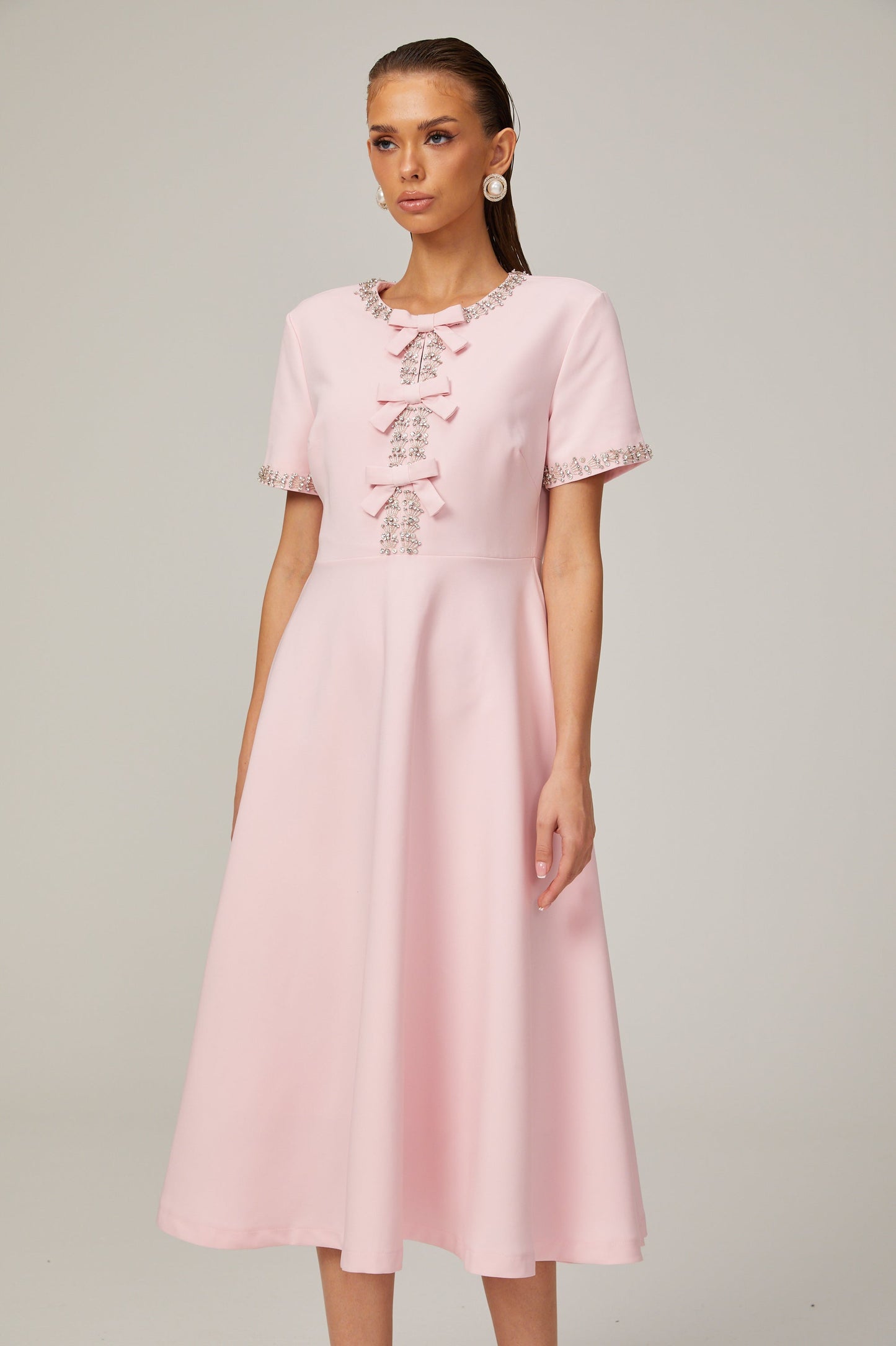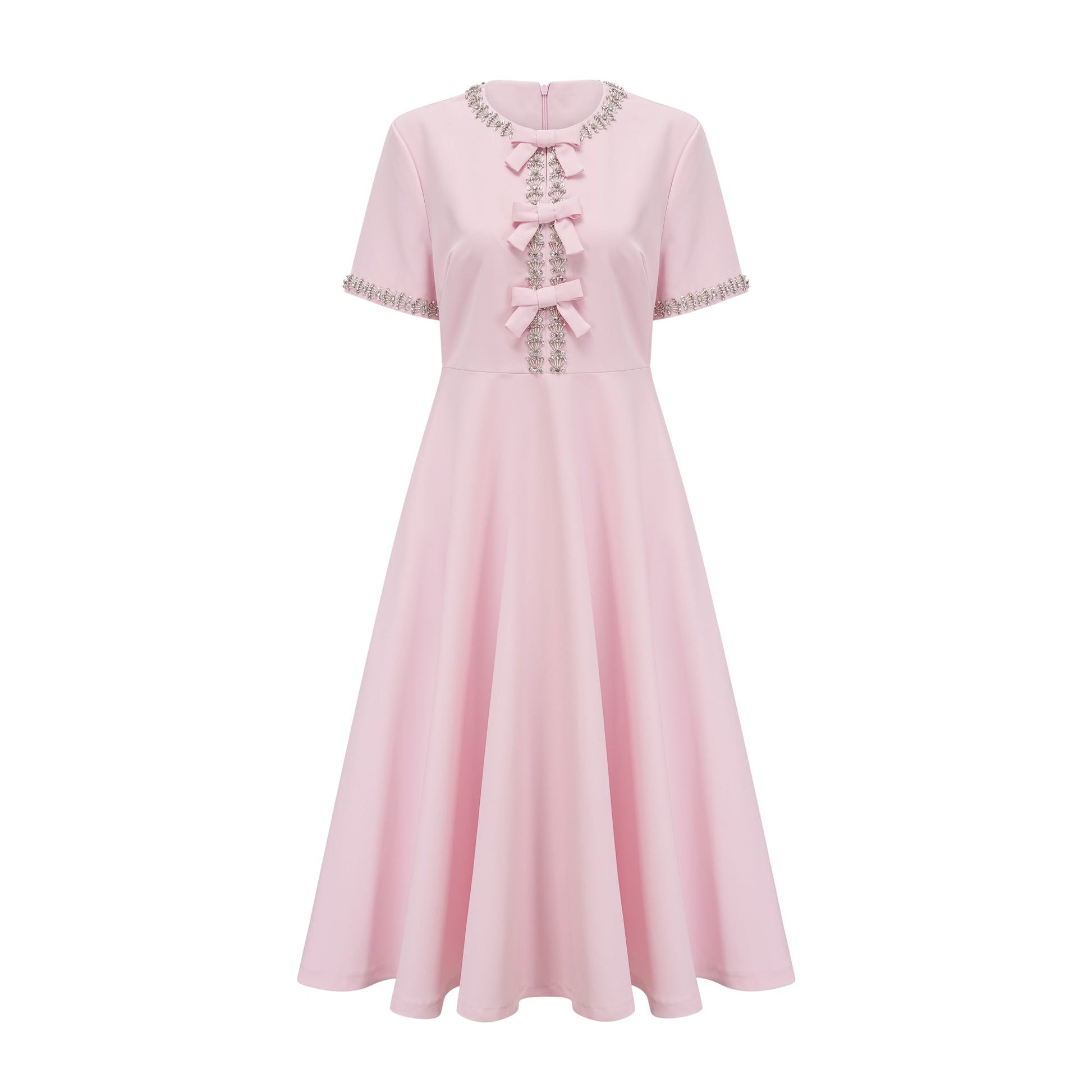 Cassi crystal-accented pink bow midi dress