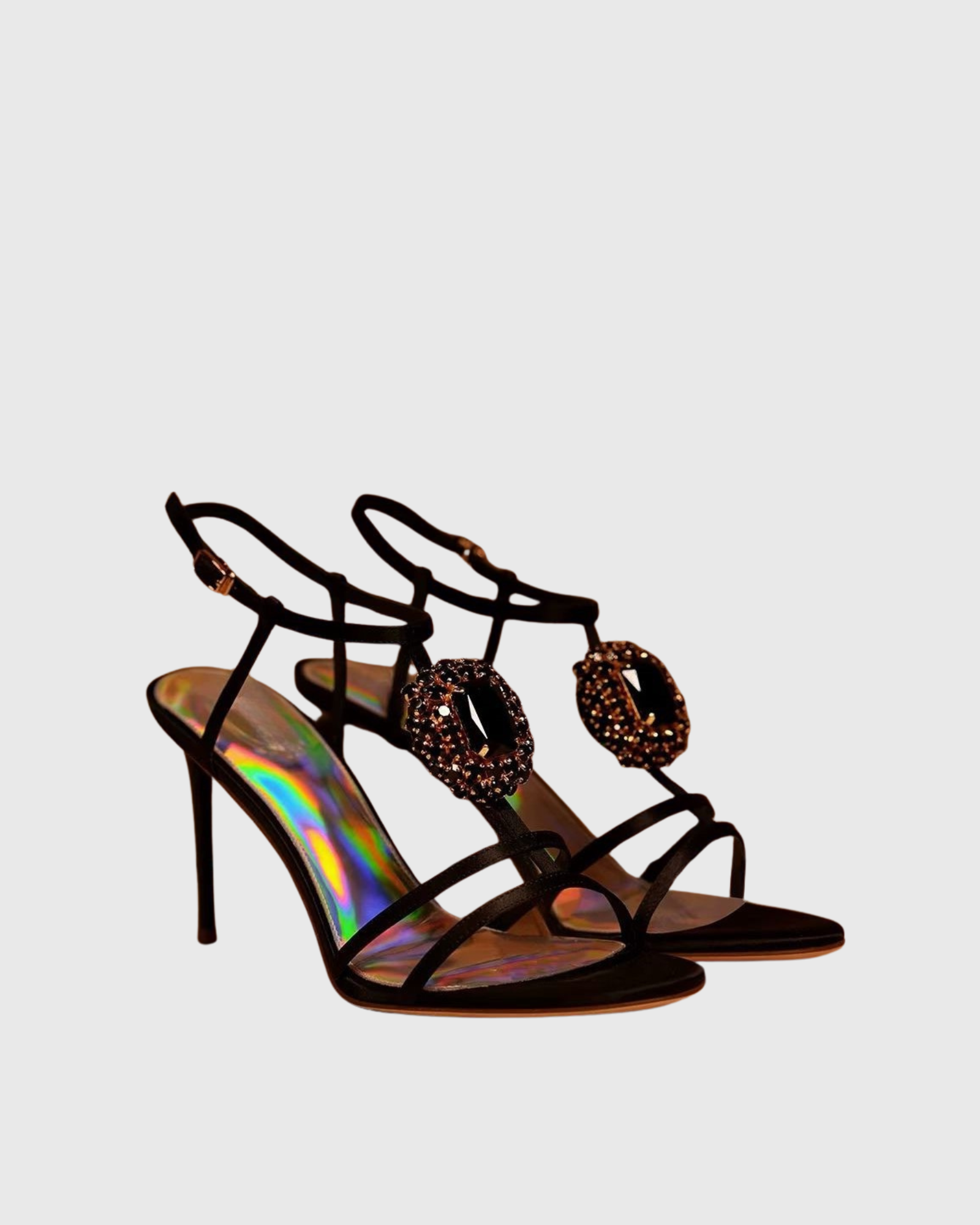 Step into elegance with the Dafni Gem Embellished Strap Sandals in Black. Featuring dazzling gem accents on sleek black straps, these sandals add a touch of glamour to any outfit. Their comfortable design ensures all-day wearability, making them perfect for both special occasions and everyday sophistication. Elevate your style effortlessly with these striking sandals.