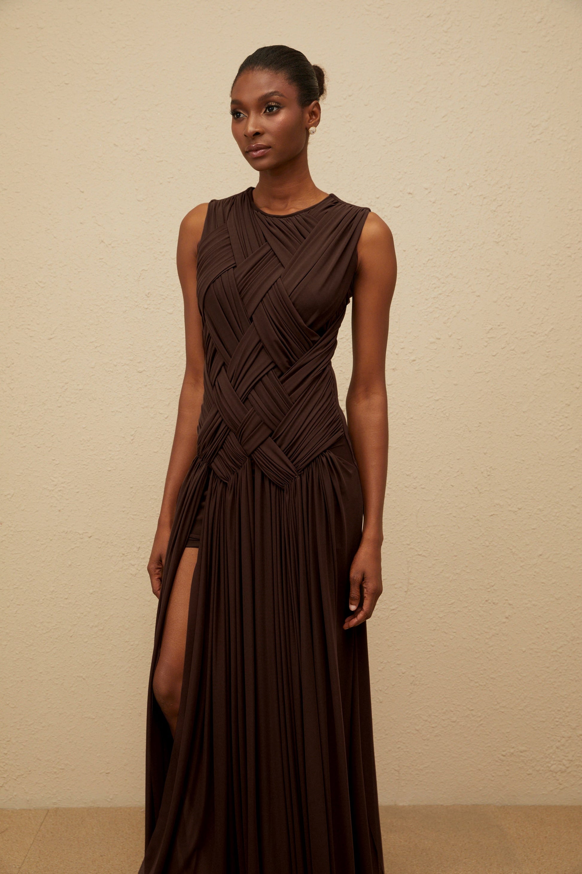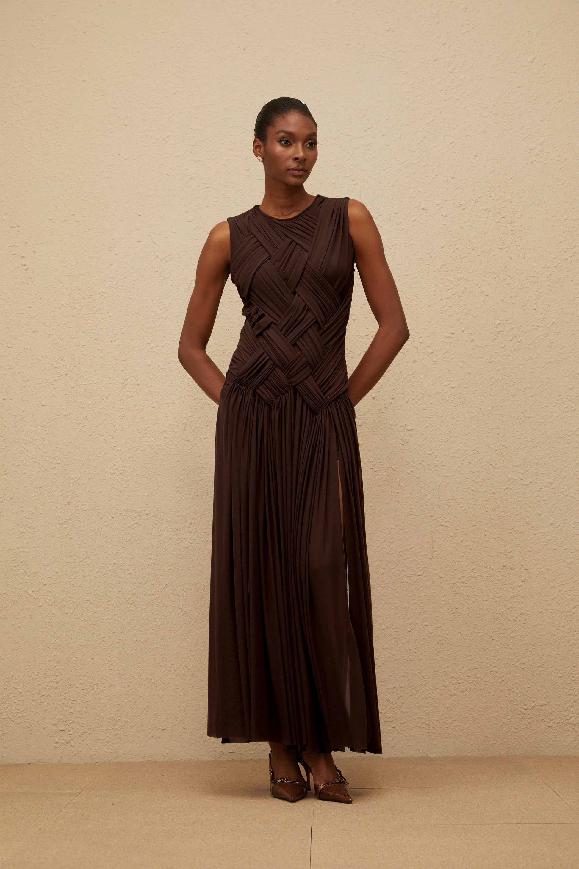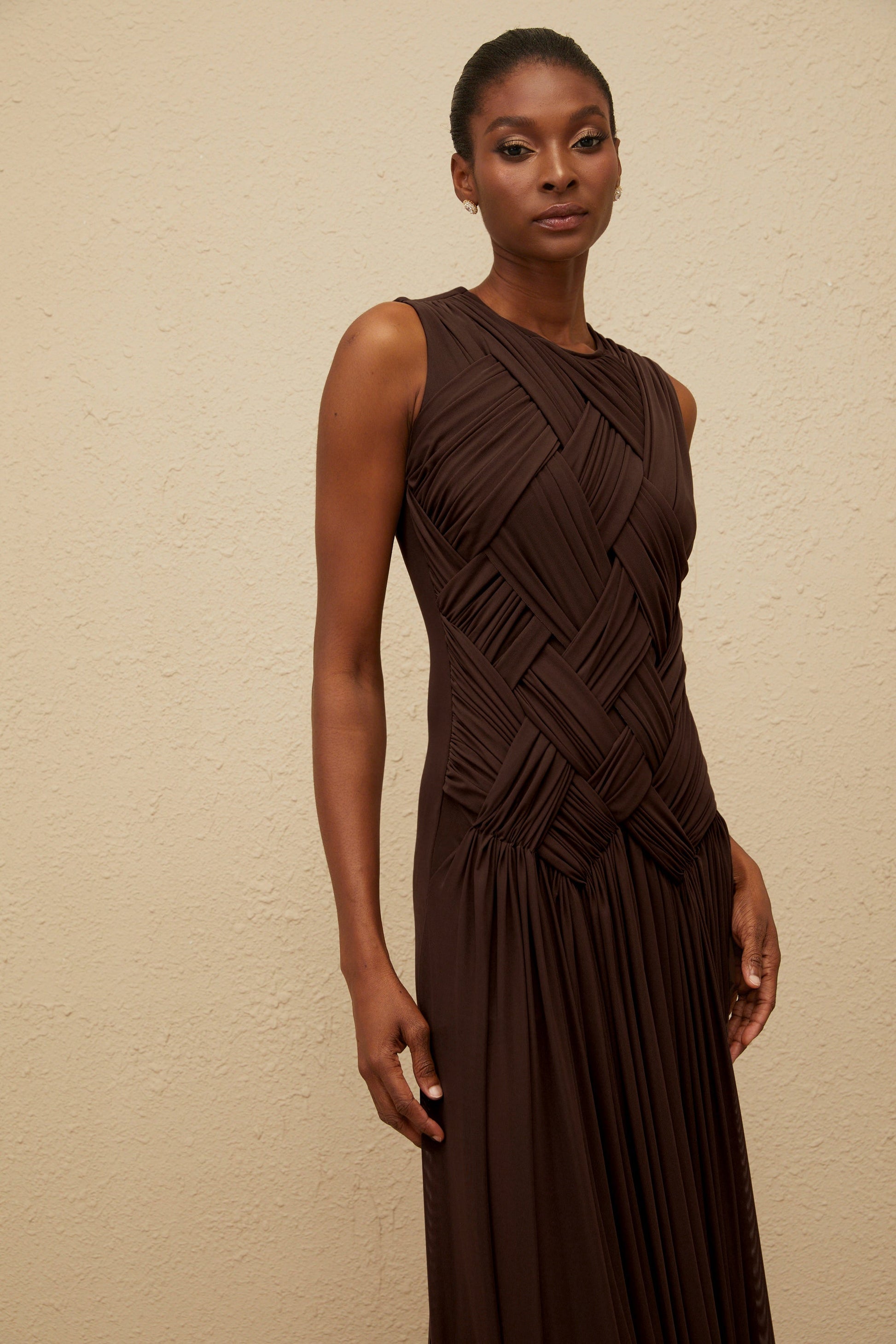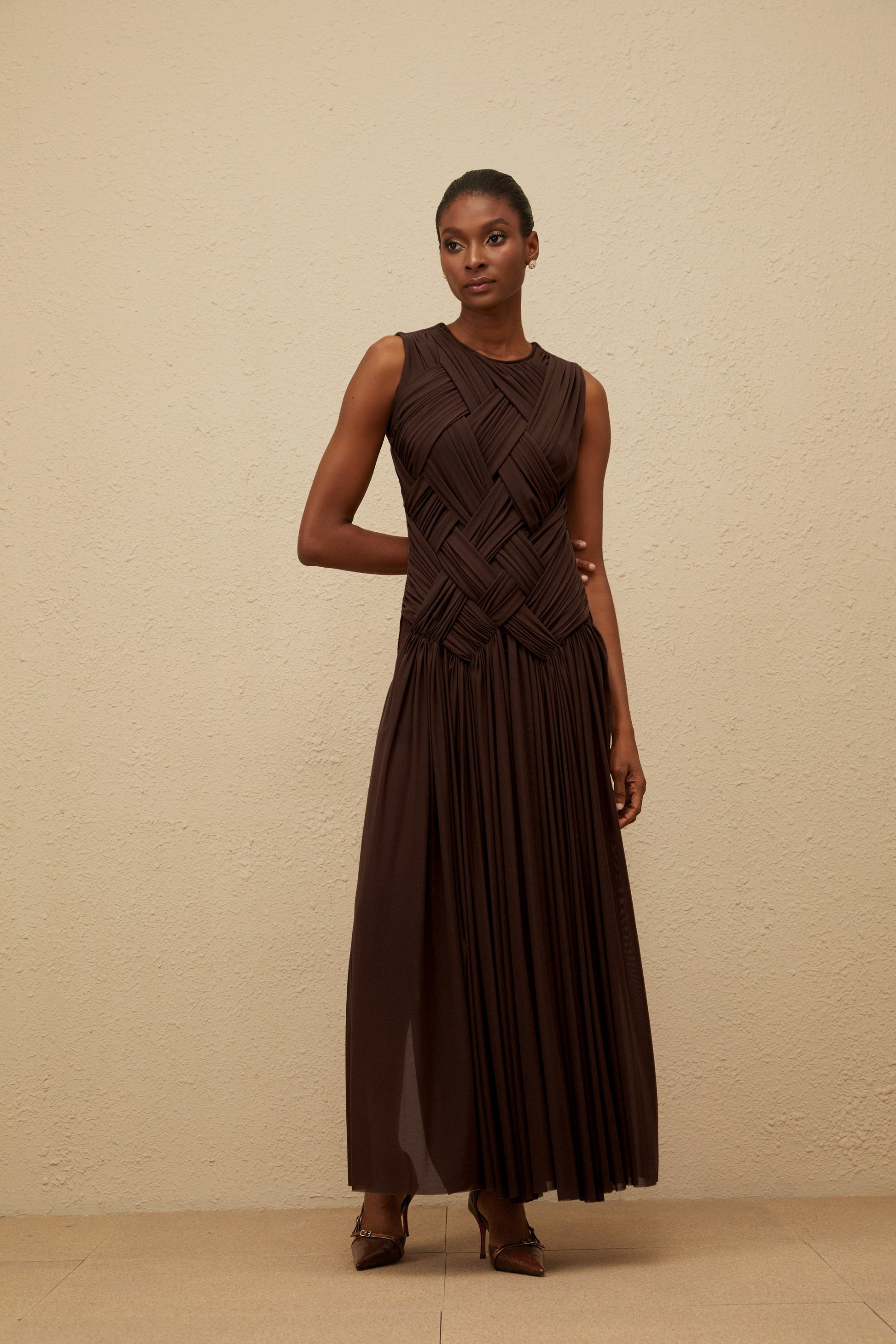 Daphné Brown Asymmetrical Braided Tulle Midi Dress