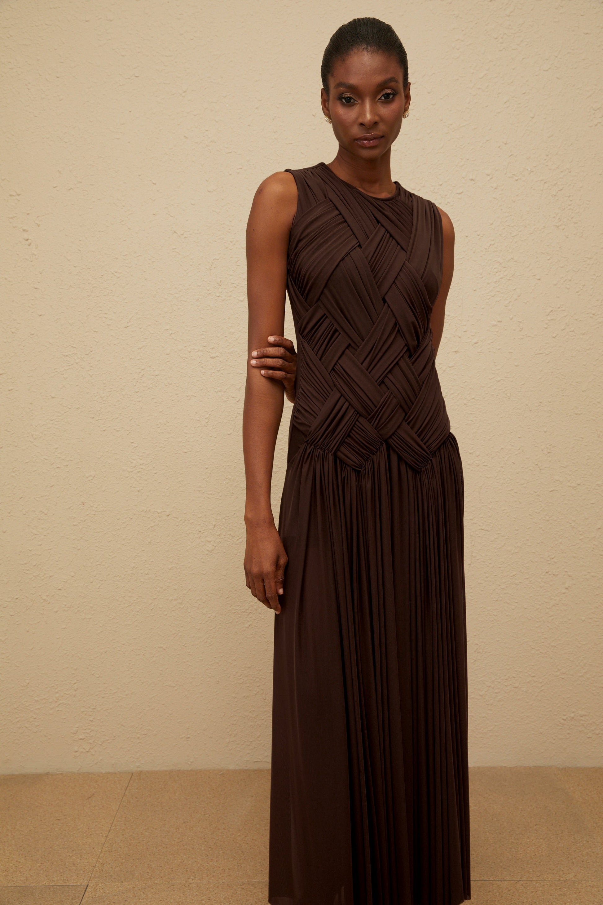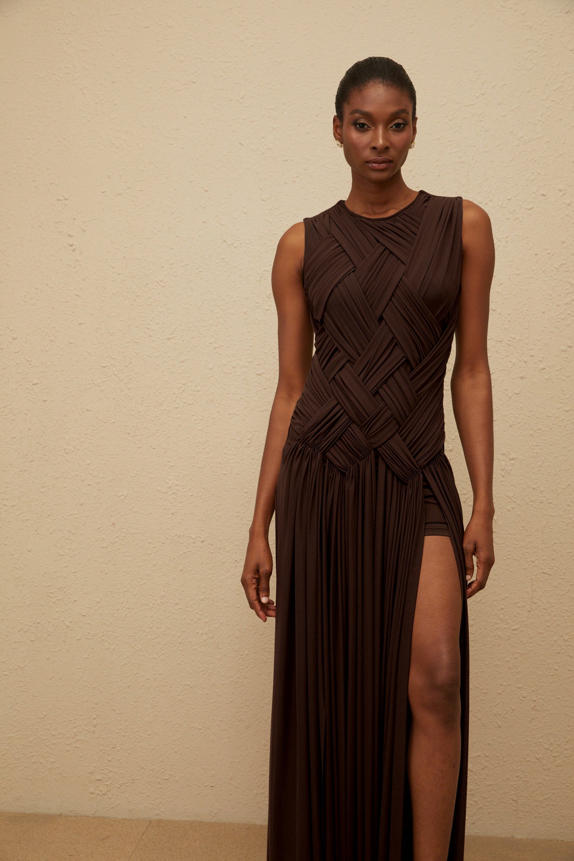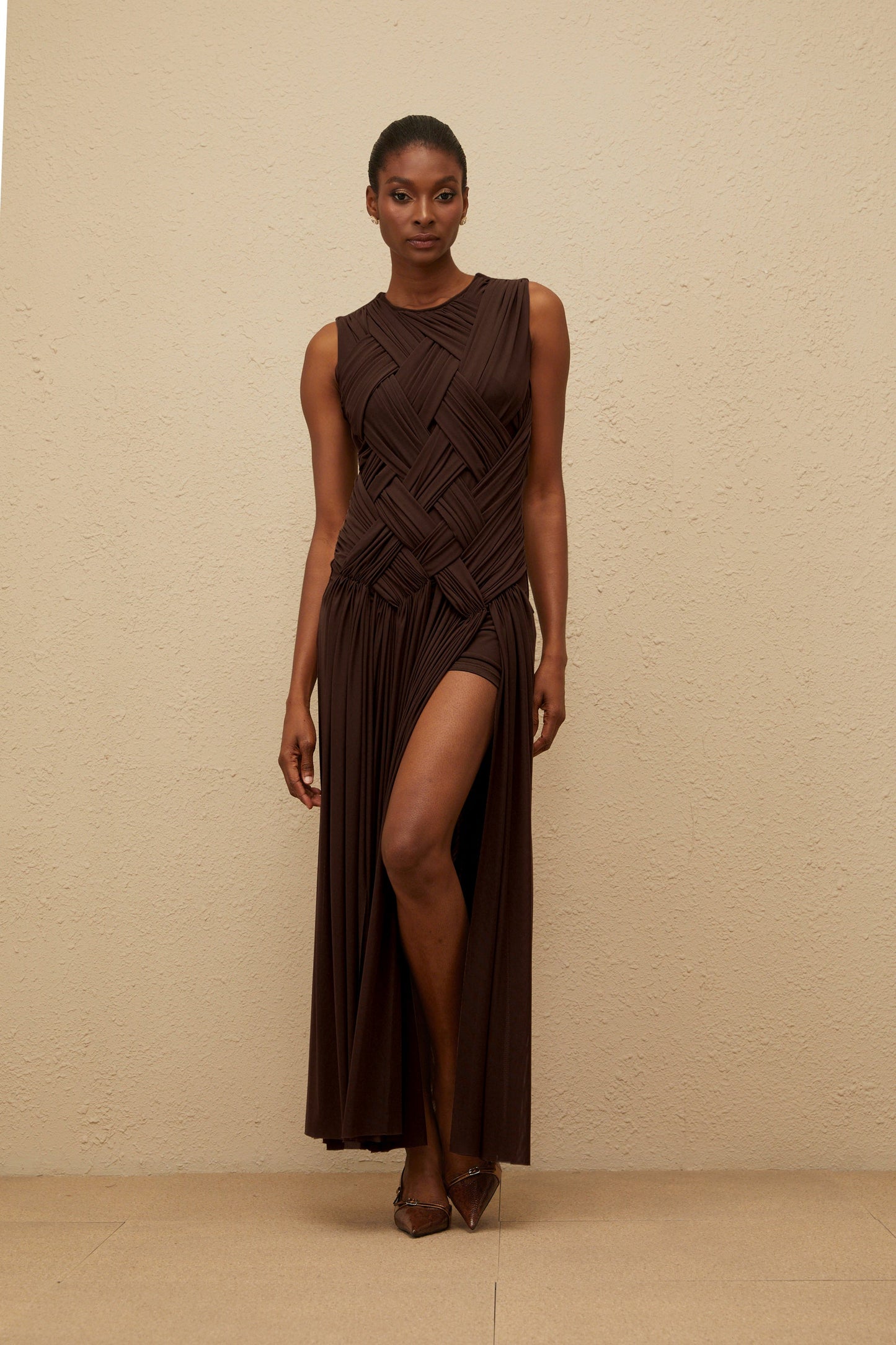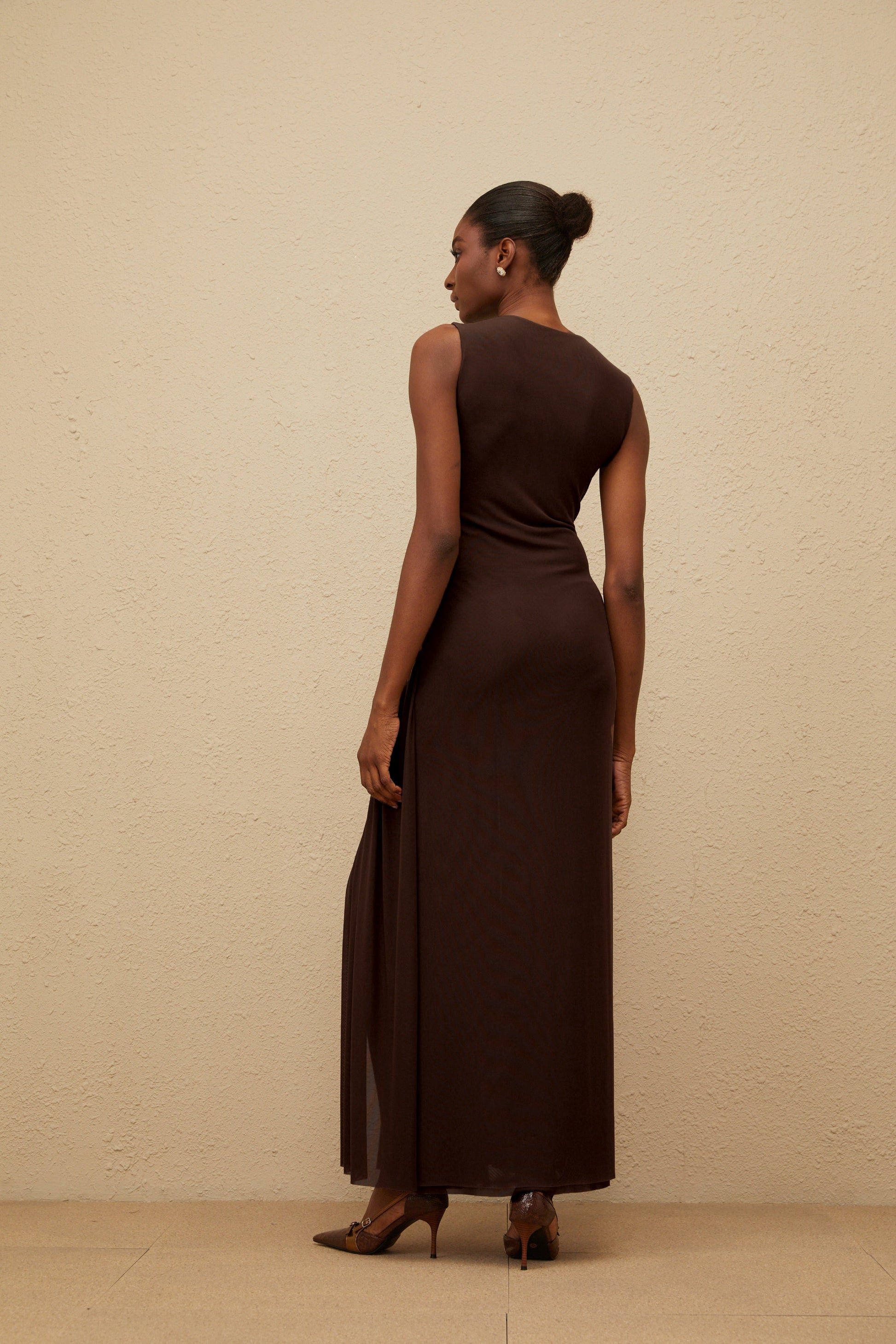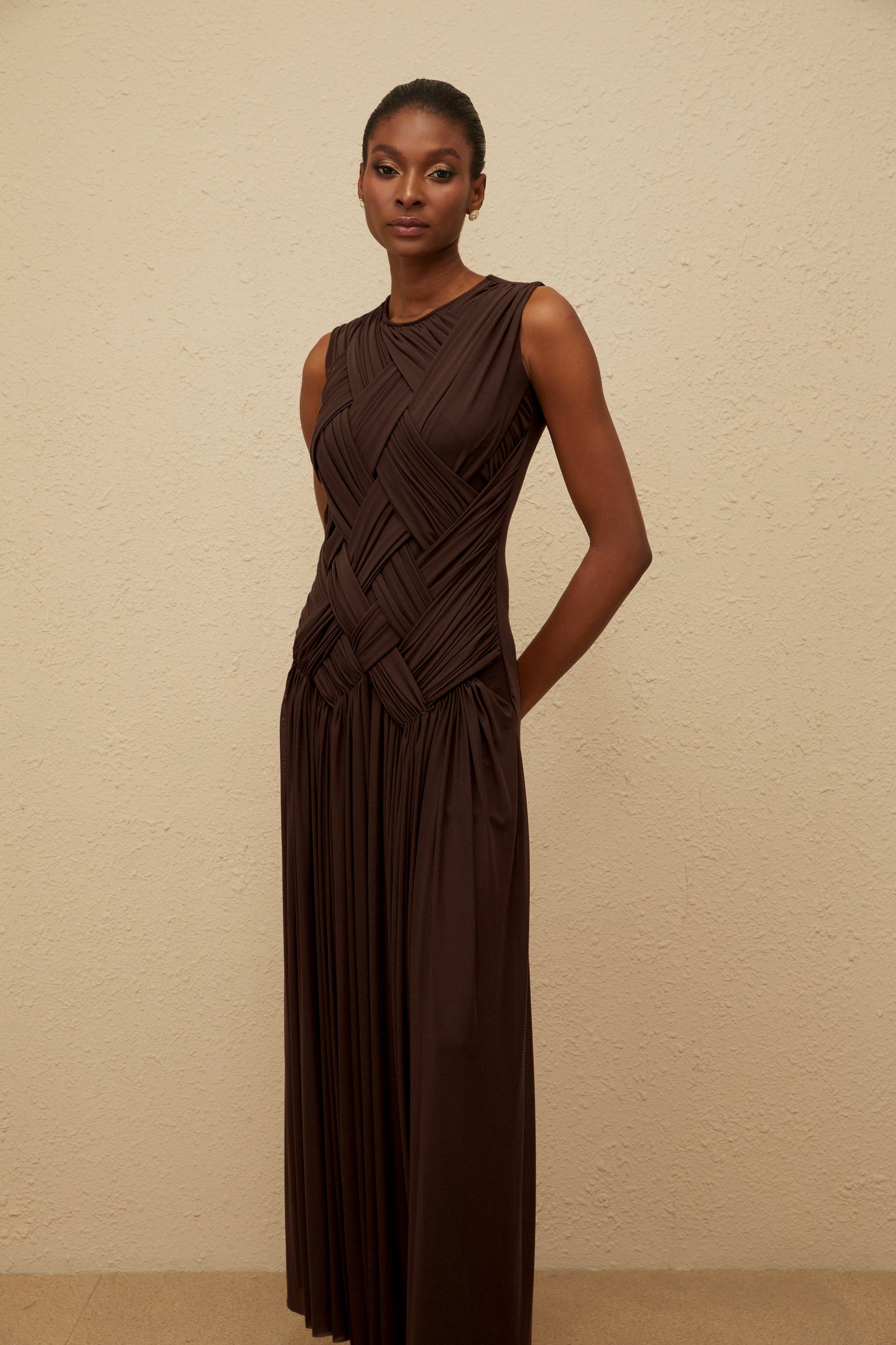 Daphné Brown Asymmetrical Braided Tulle Midi Dress