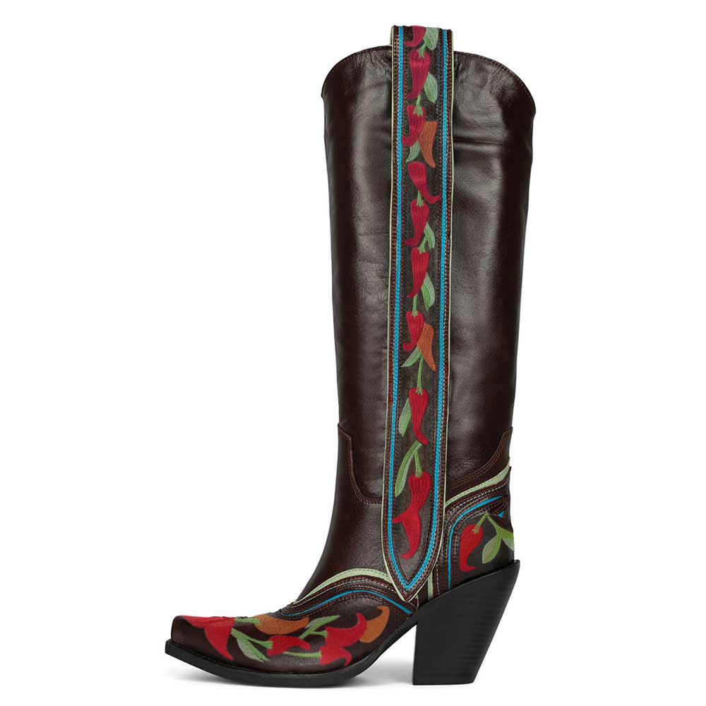 - Special Designs: Dark brown knee-high western boots with an enchanting colorful chili pattern embroidery design and side loops.