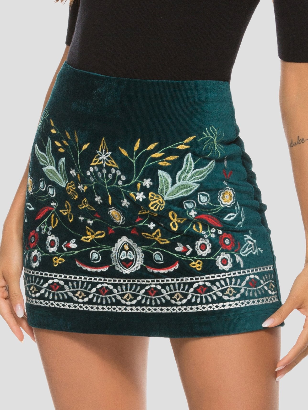 This skirt is crafted from high-quality velvet fabric, which is soft and lustrous, enhancing the skirt's luxurious feel and comfort. The delicate floral embroidery adds unique decorative and elegant details to the skirt. The fitted design highlights the wearer's curves, accentuating the body shape. An invisible zipper is located at the back waist, facilitating easy dressing while maintaining a sleek appearance. The skirt's length showcases long legs, adding a touch of fashion and vitality.