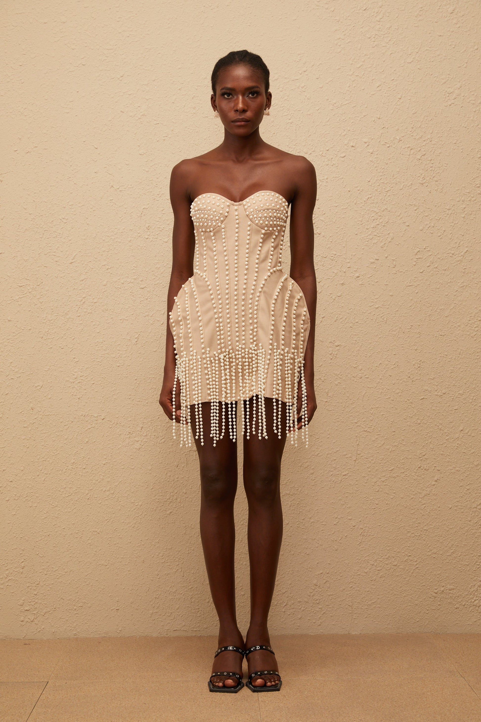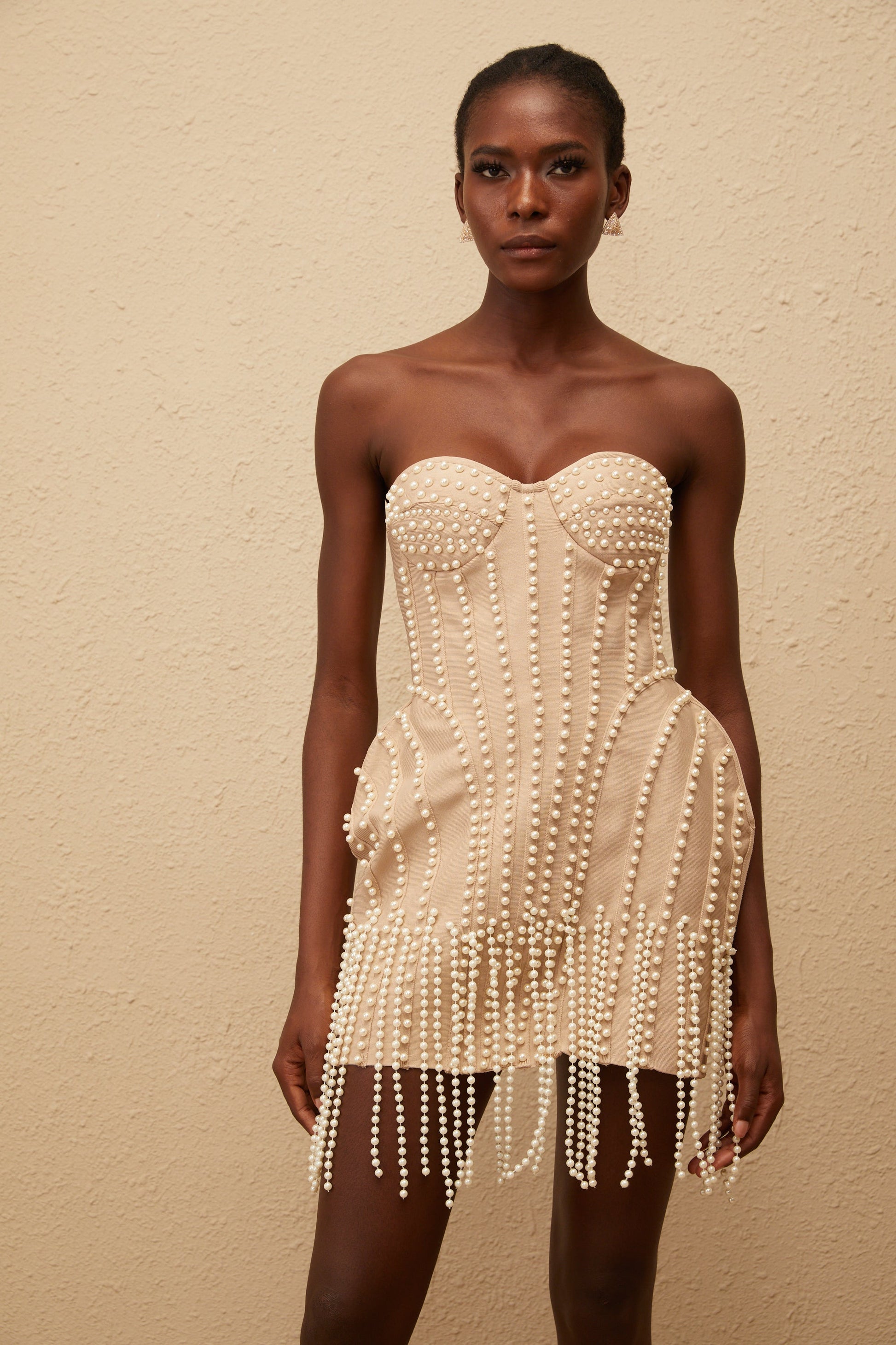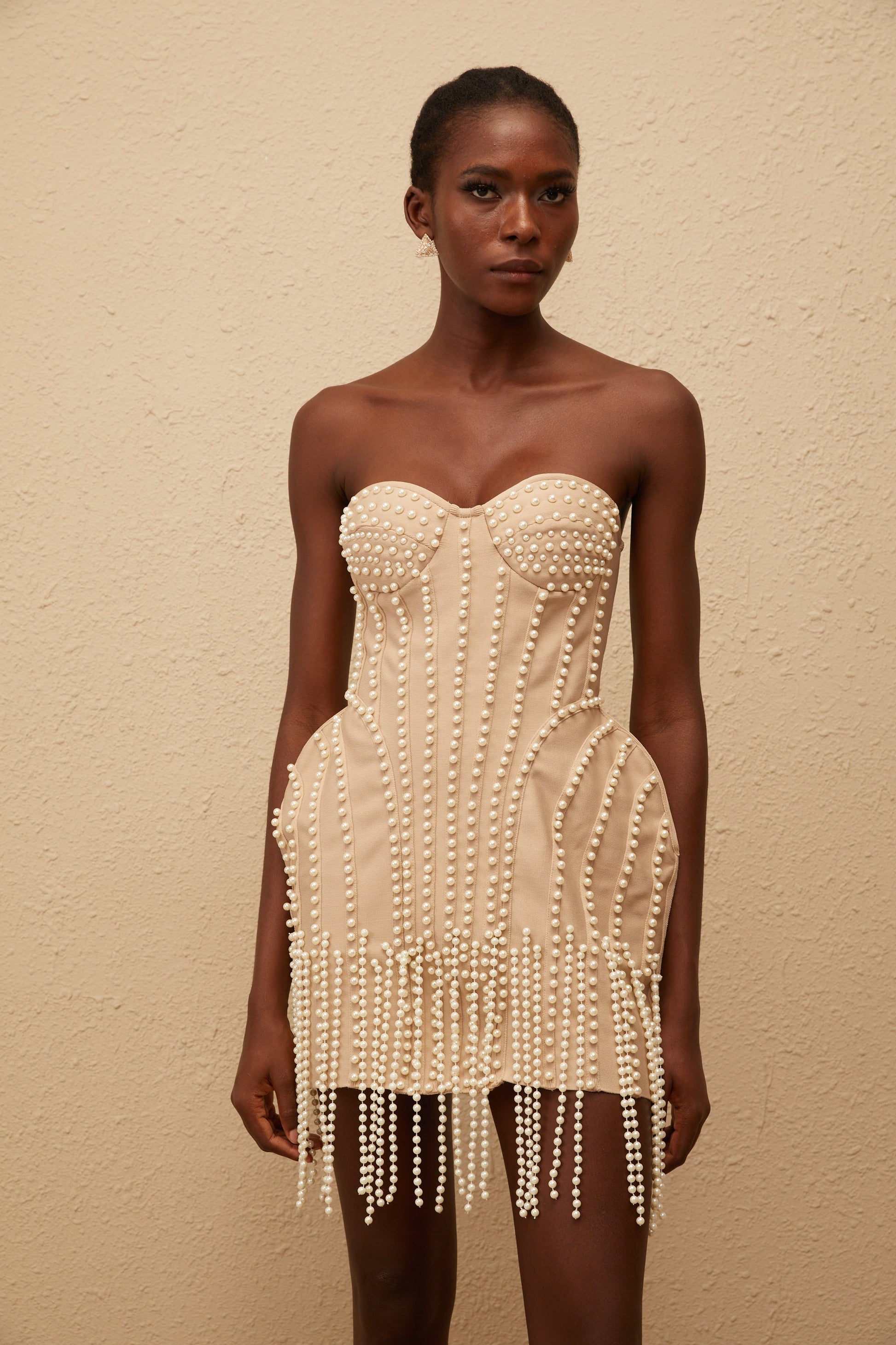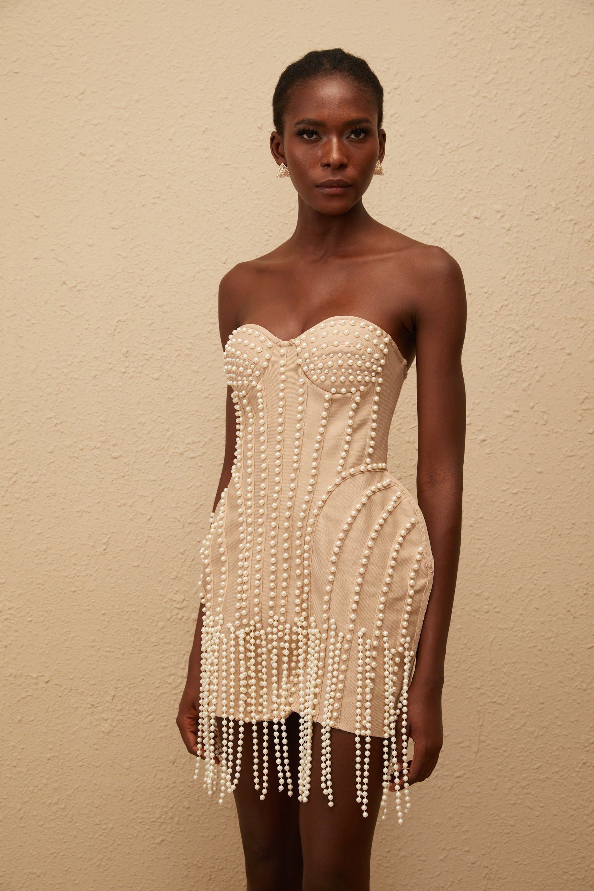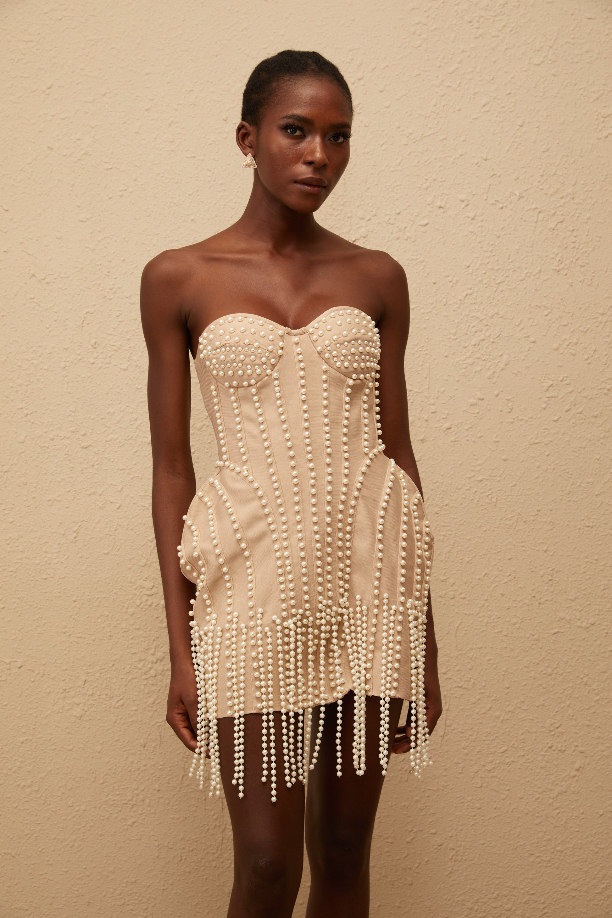 Delilah Neutral Faux Pearl Fringed Mini Dress