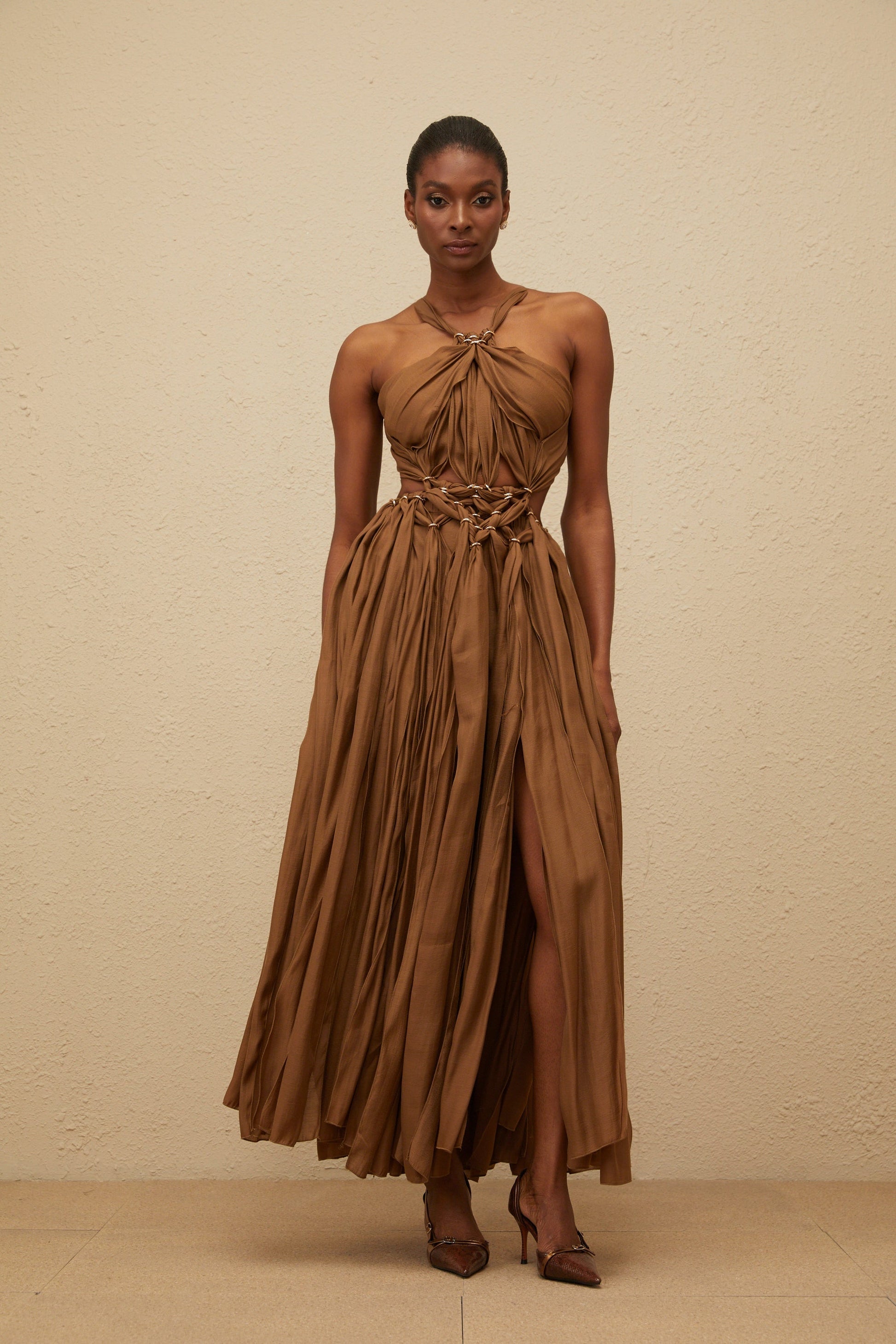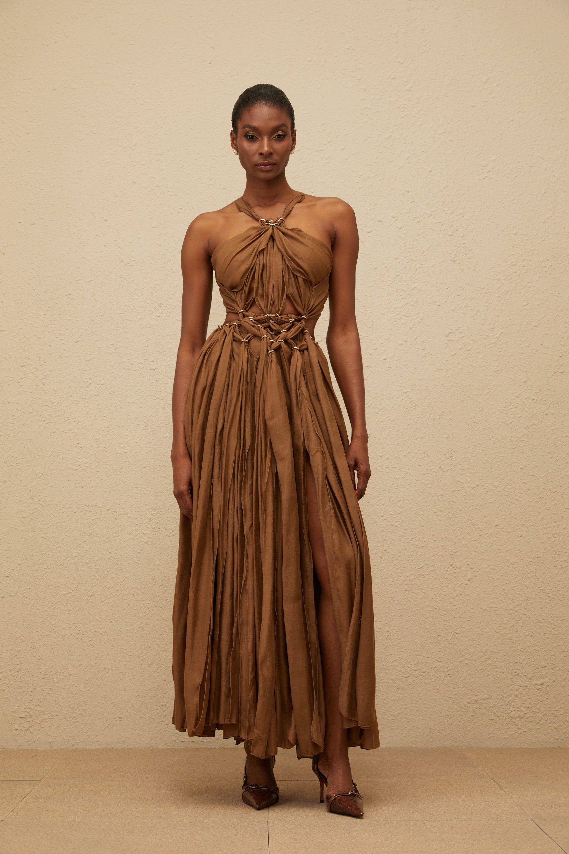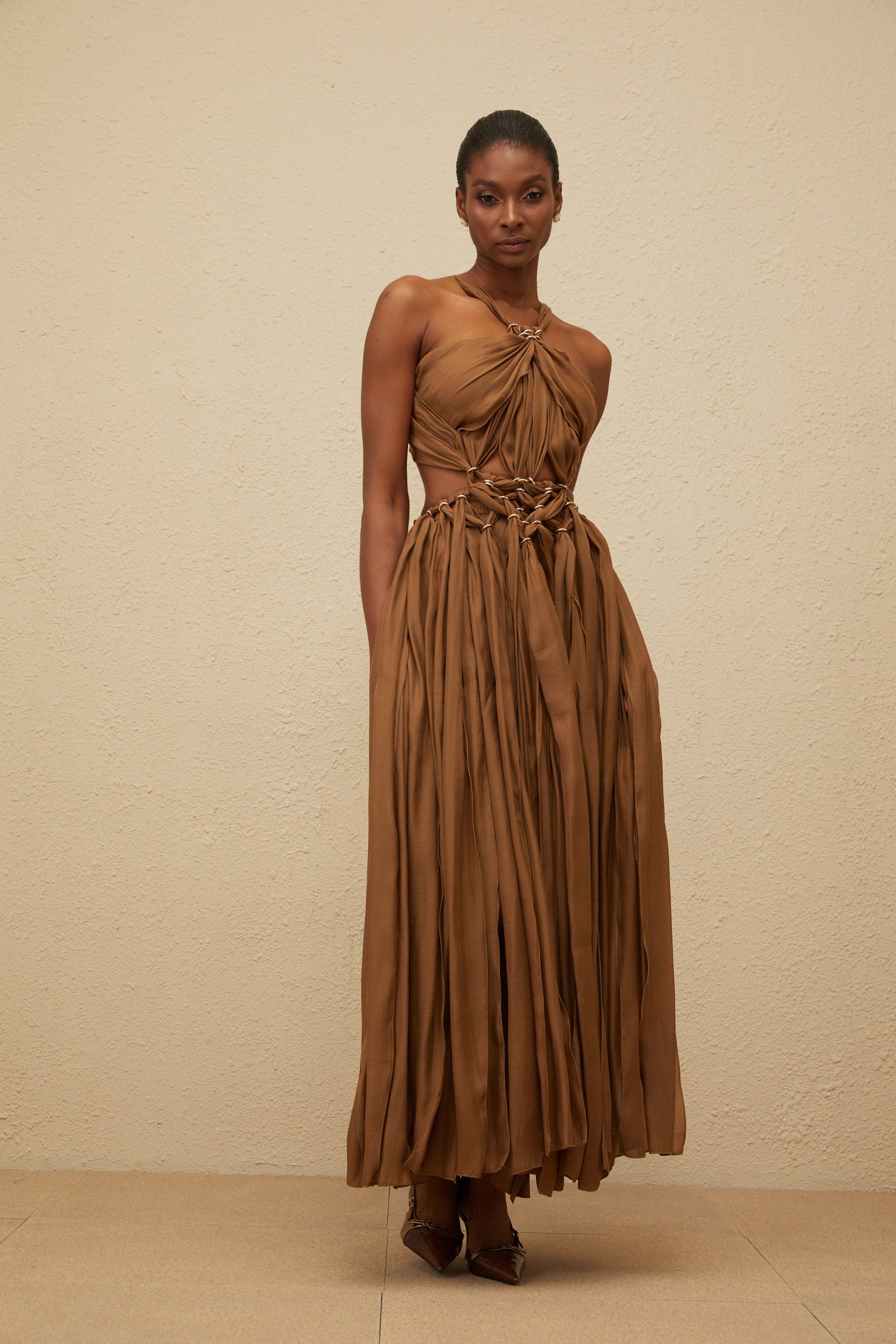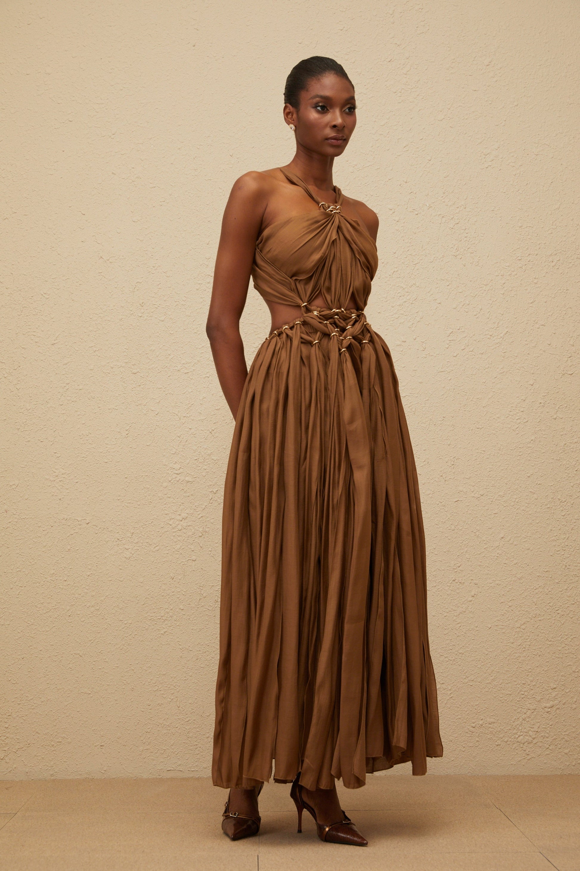 Déotille Brown Braided Cutout Shirred Midi Dress