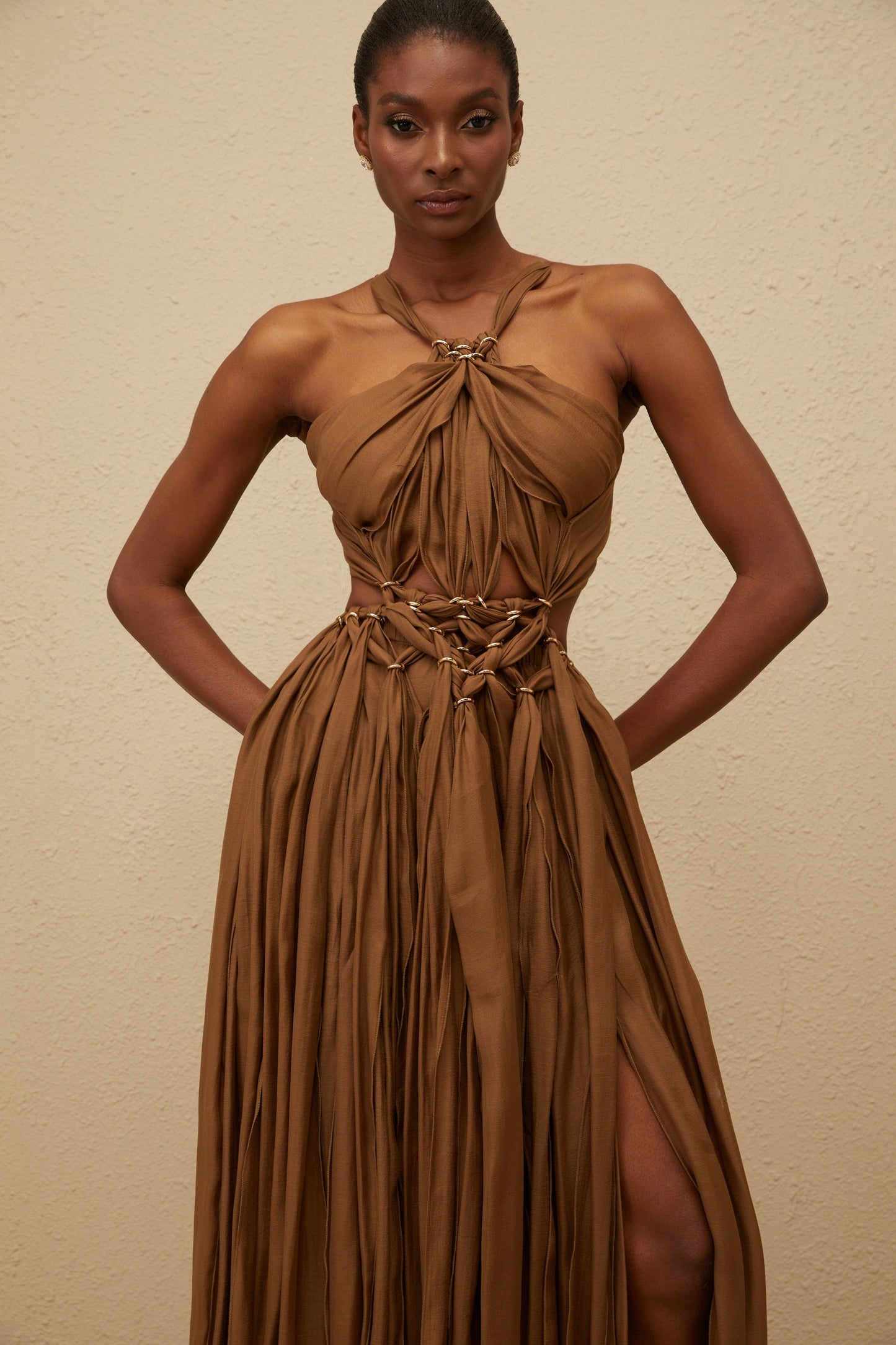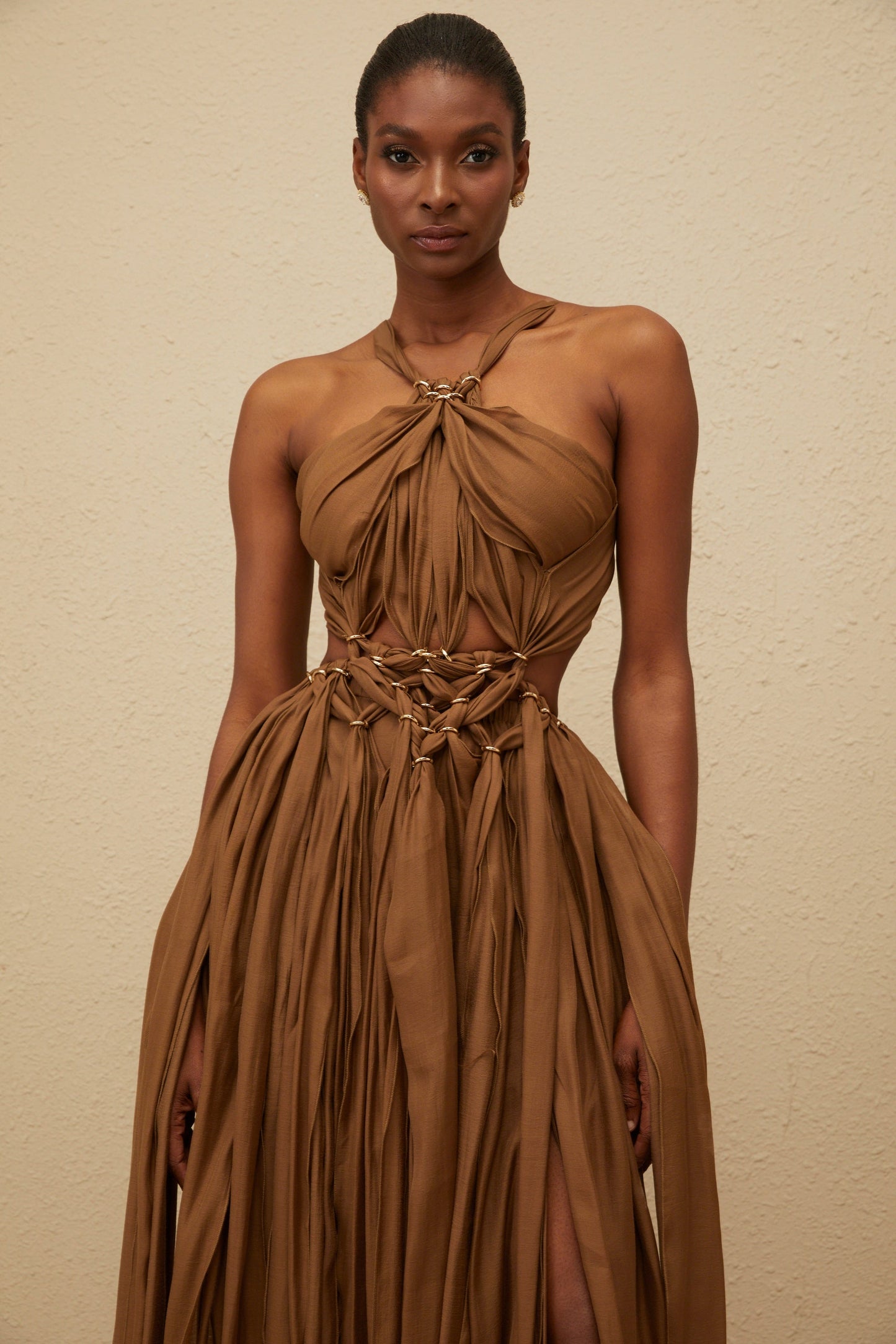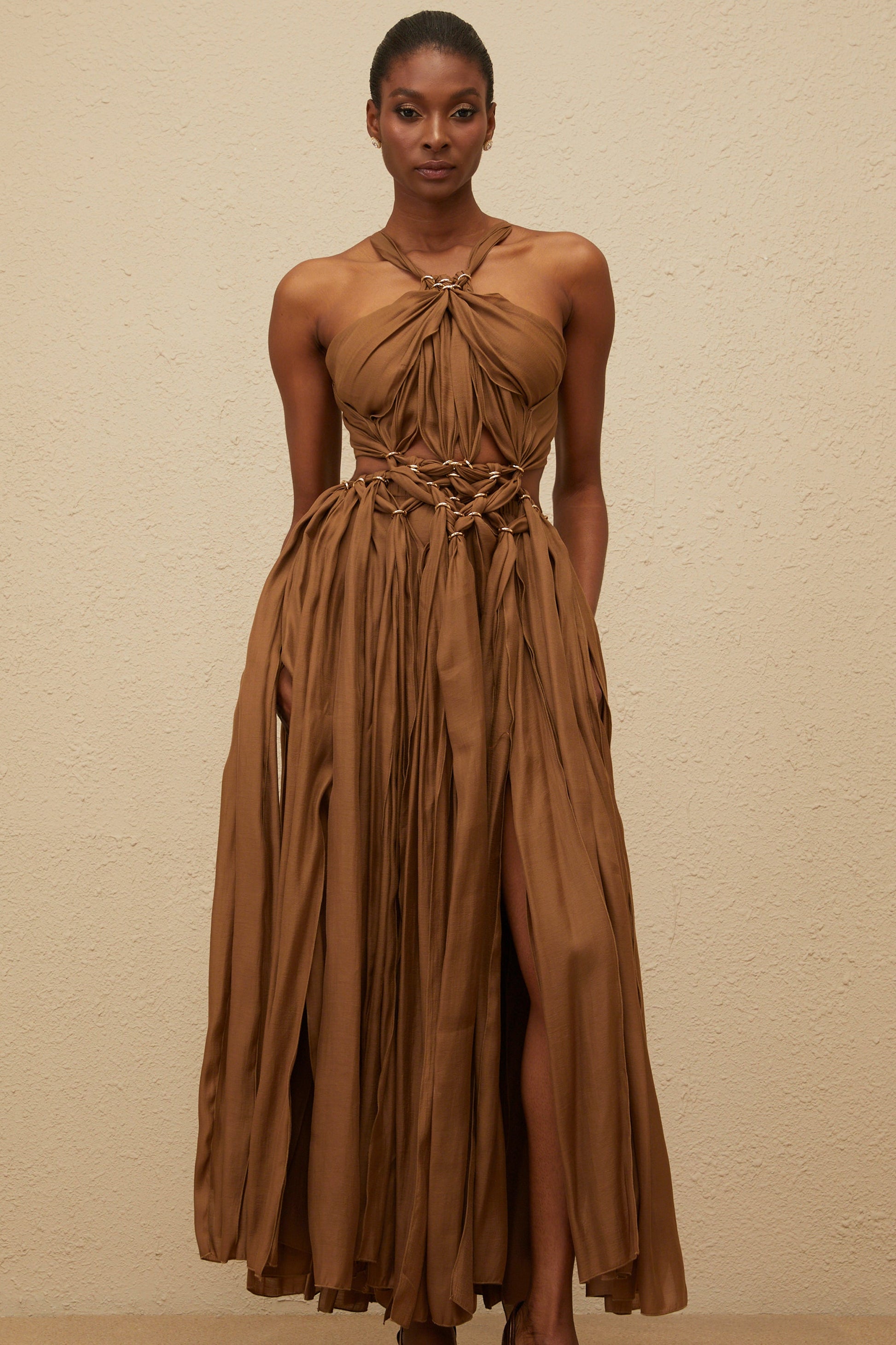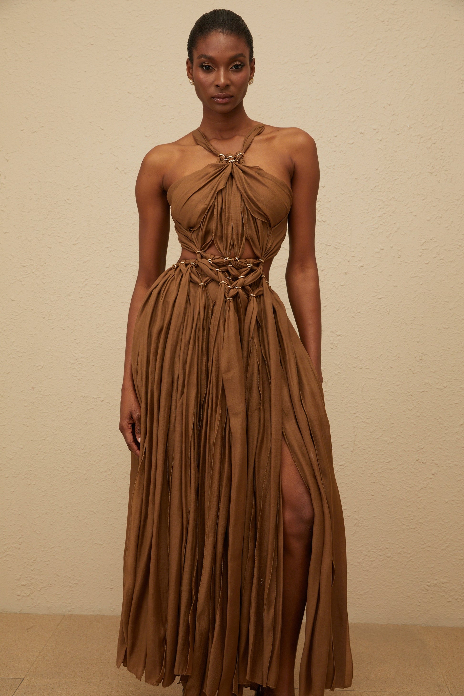 Déotille Brown Braided Cutout Shirred Midi Dress
