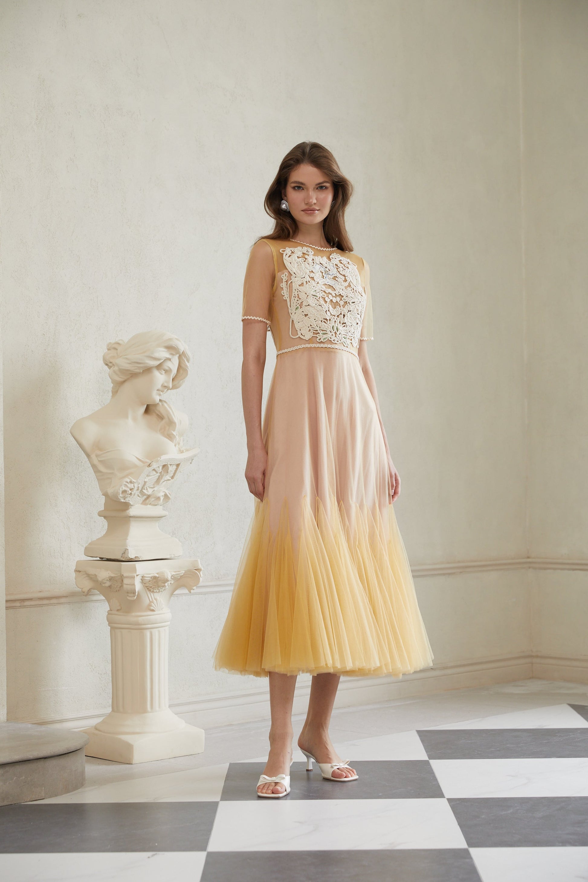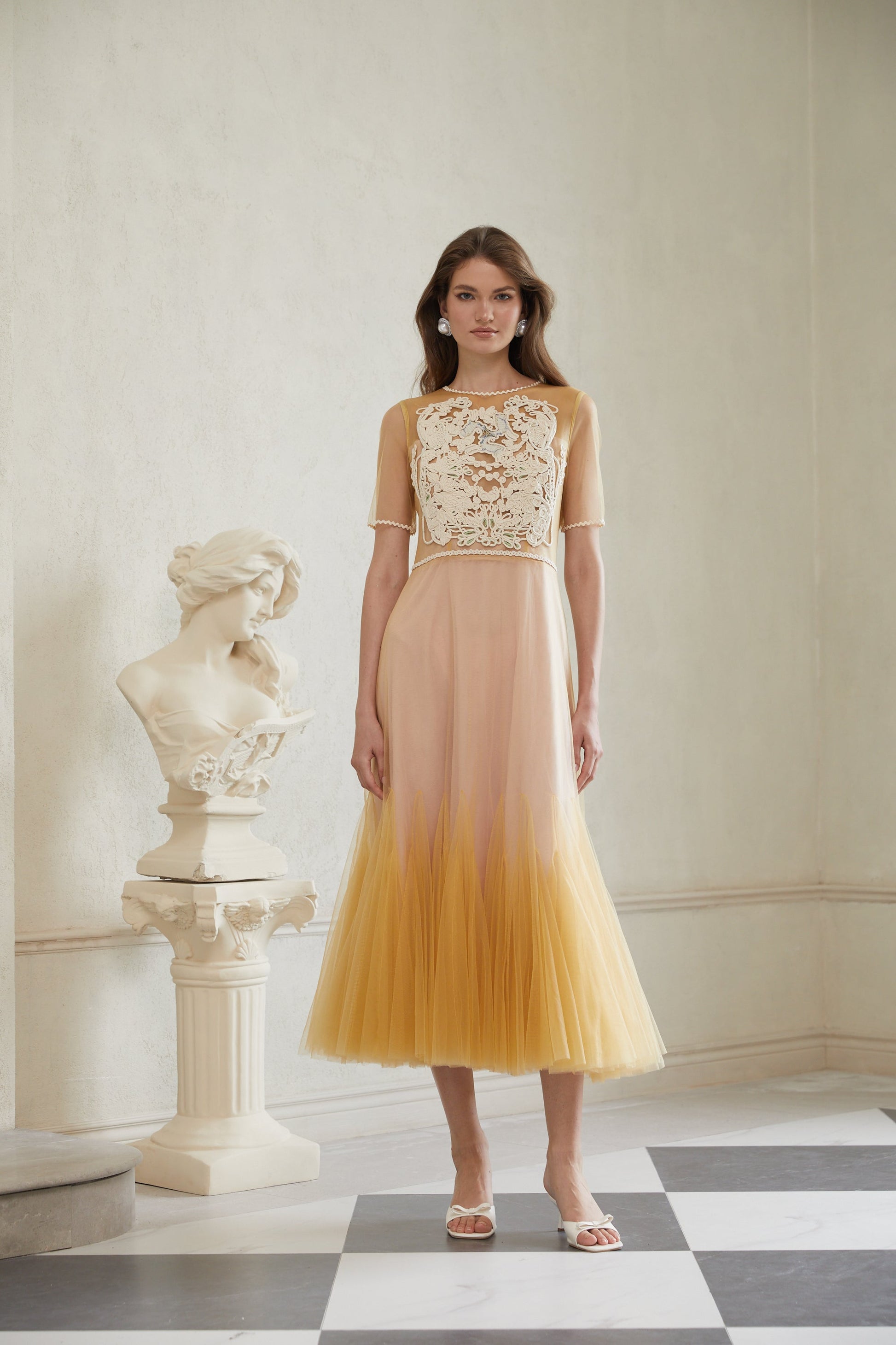 Despoina Yellow Floral Braided Tulle Midi Dress