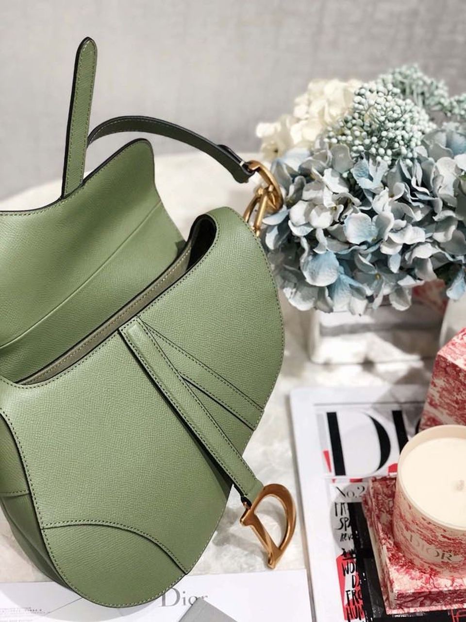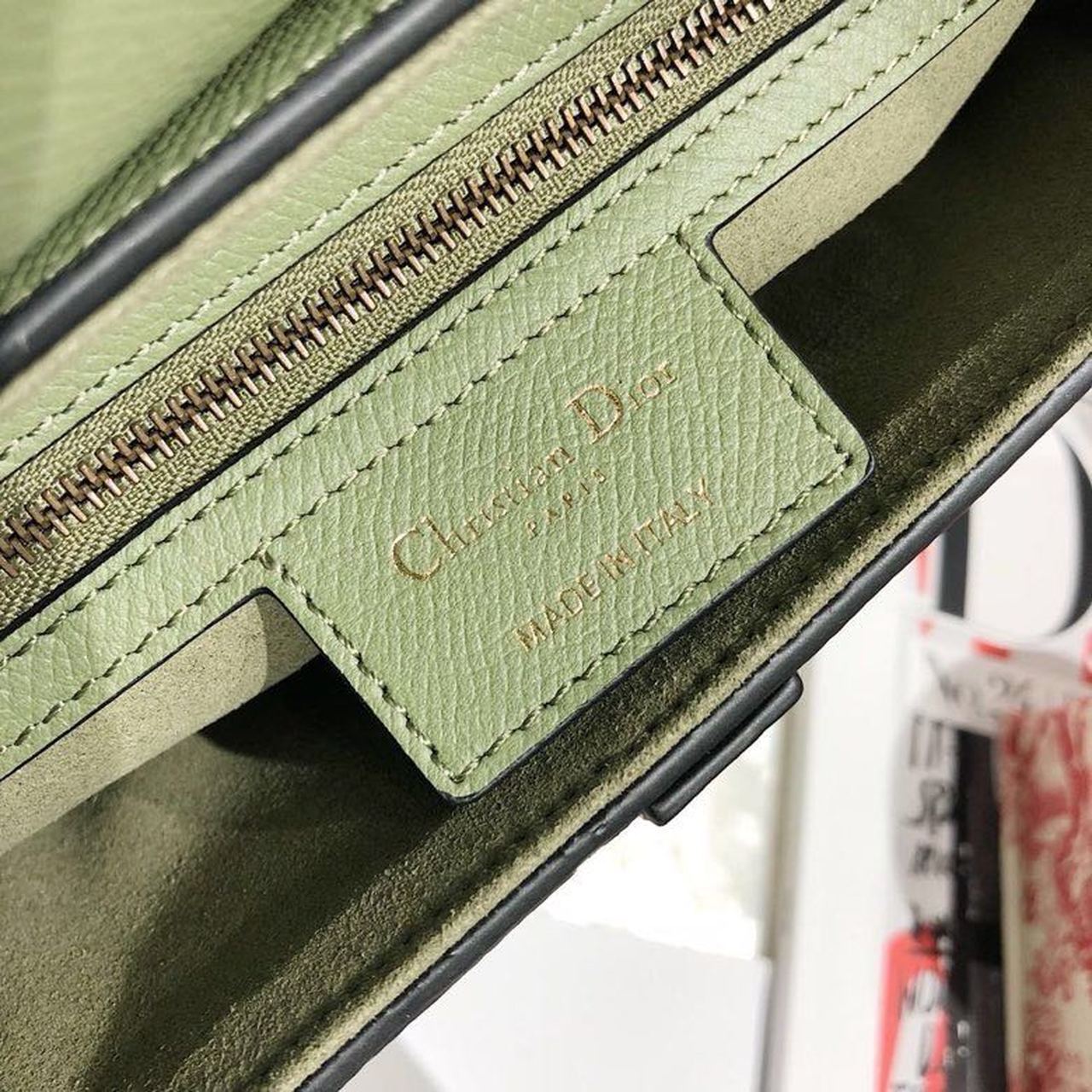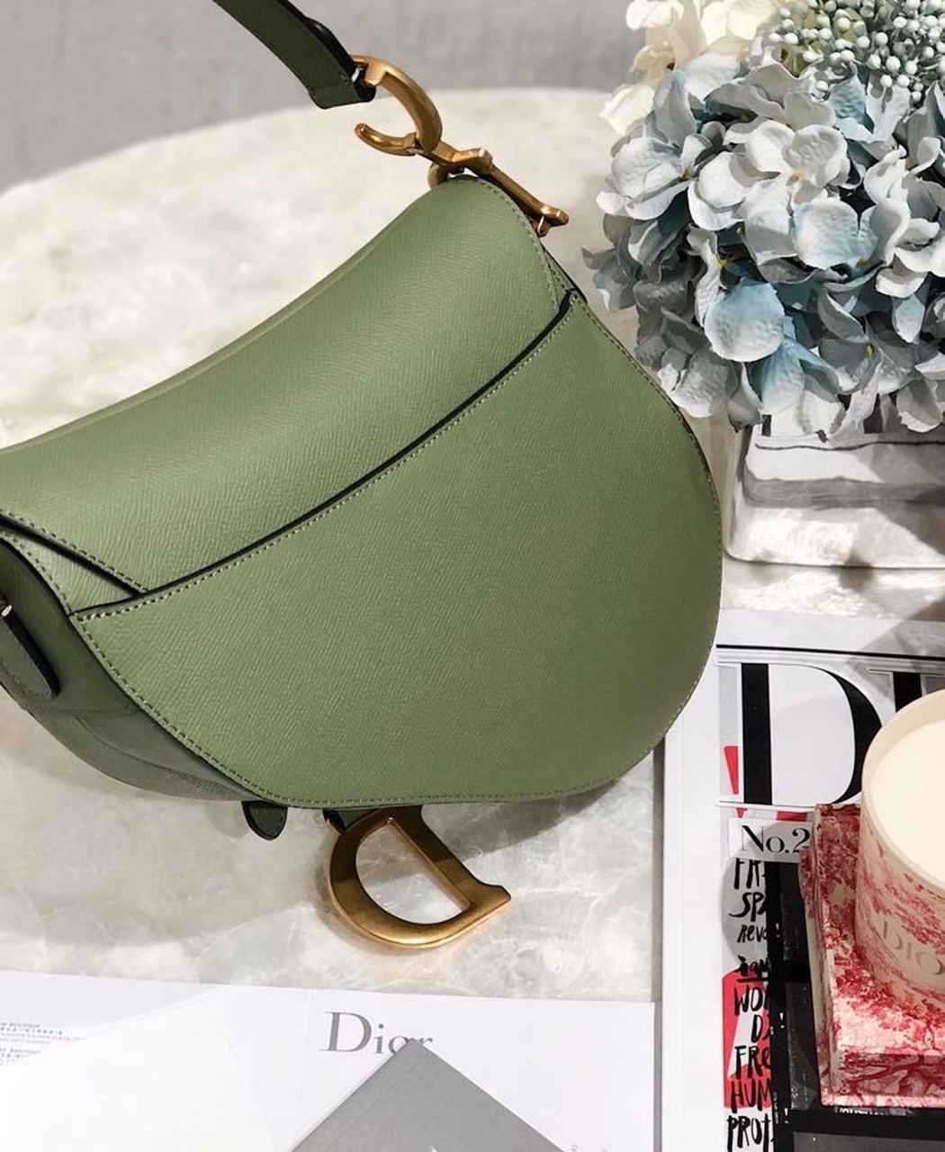 Maria Grazia Chiuri brings a fresh update to the iconic Saddle bag. Featuring a Saddle flap with a magnetic ‘D’ stirrup clasp, the legendary design boasts a ‘CD’ signature on each side of the handle. The cedar green grained style is embellished with antique gold-finish metal hardware and can be carried by hand or worn over the shoulder and can be customized with different shoulder straps