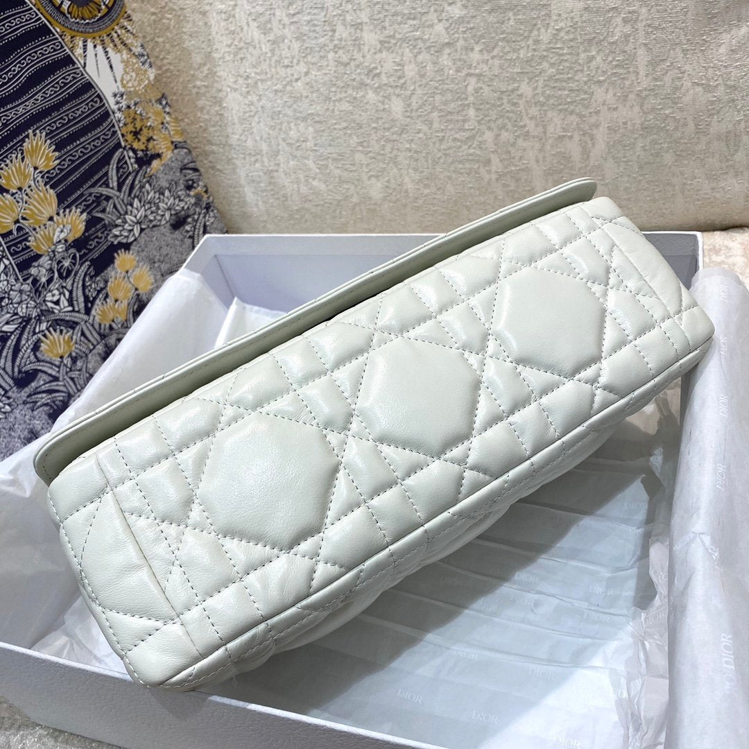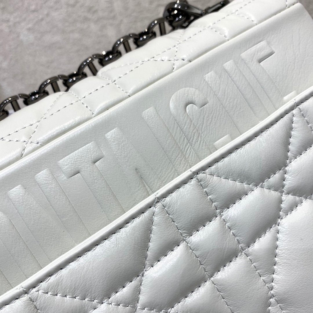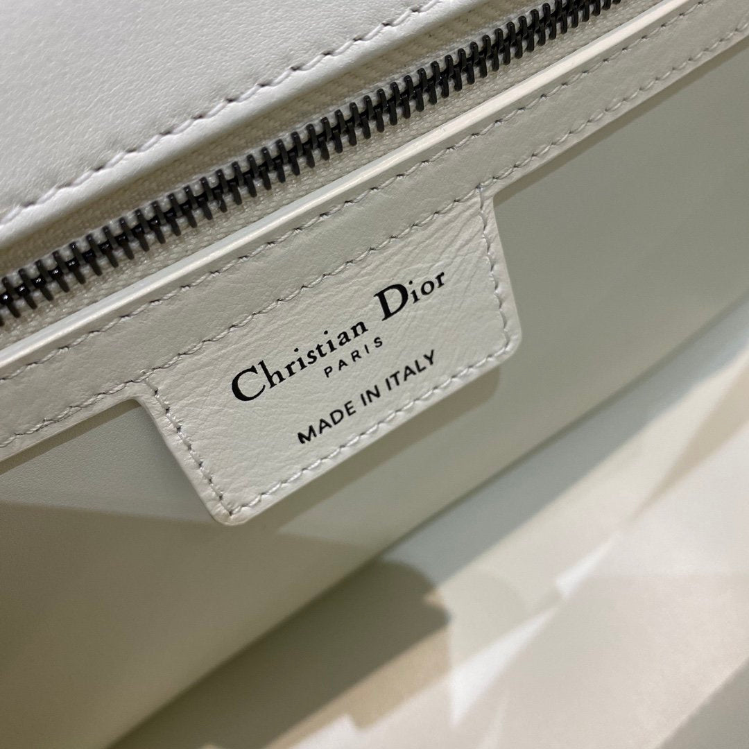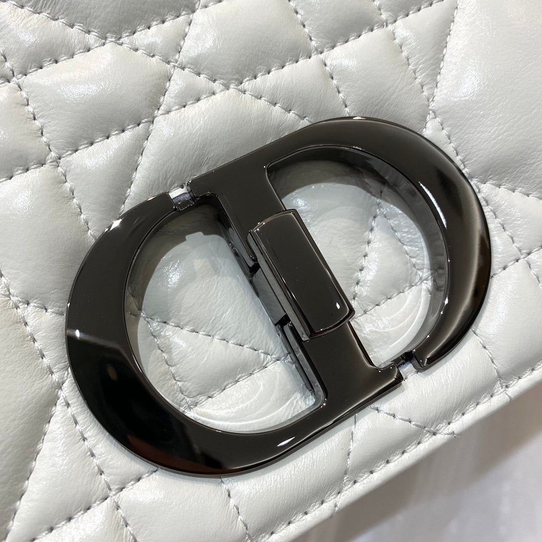 The DYOR Caro bag combines modernity with timeless elegance. The design is crafted in white supple with Cannage stitching. The bag features a flap adorned with an antique metal ‘CD’ twist clasp, inspired by the seal of a CHRSTN DR perfume bottle. The detachable chain shoulder strap with ‘CD’ signature links allows it to be carried by hand, over the shoulder or crossbody, or replaced by one of the House’s wide embroidered straps, allowing the large bag to pair with day or evening attire.