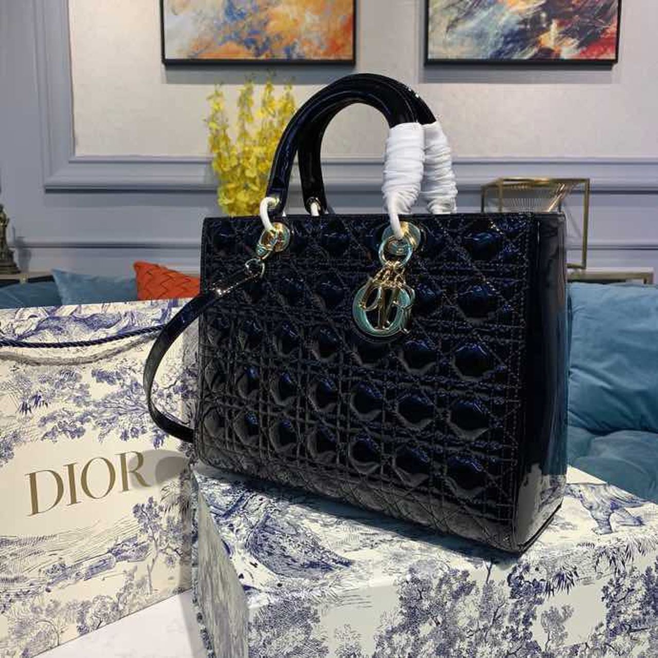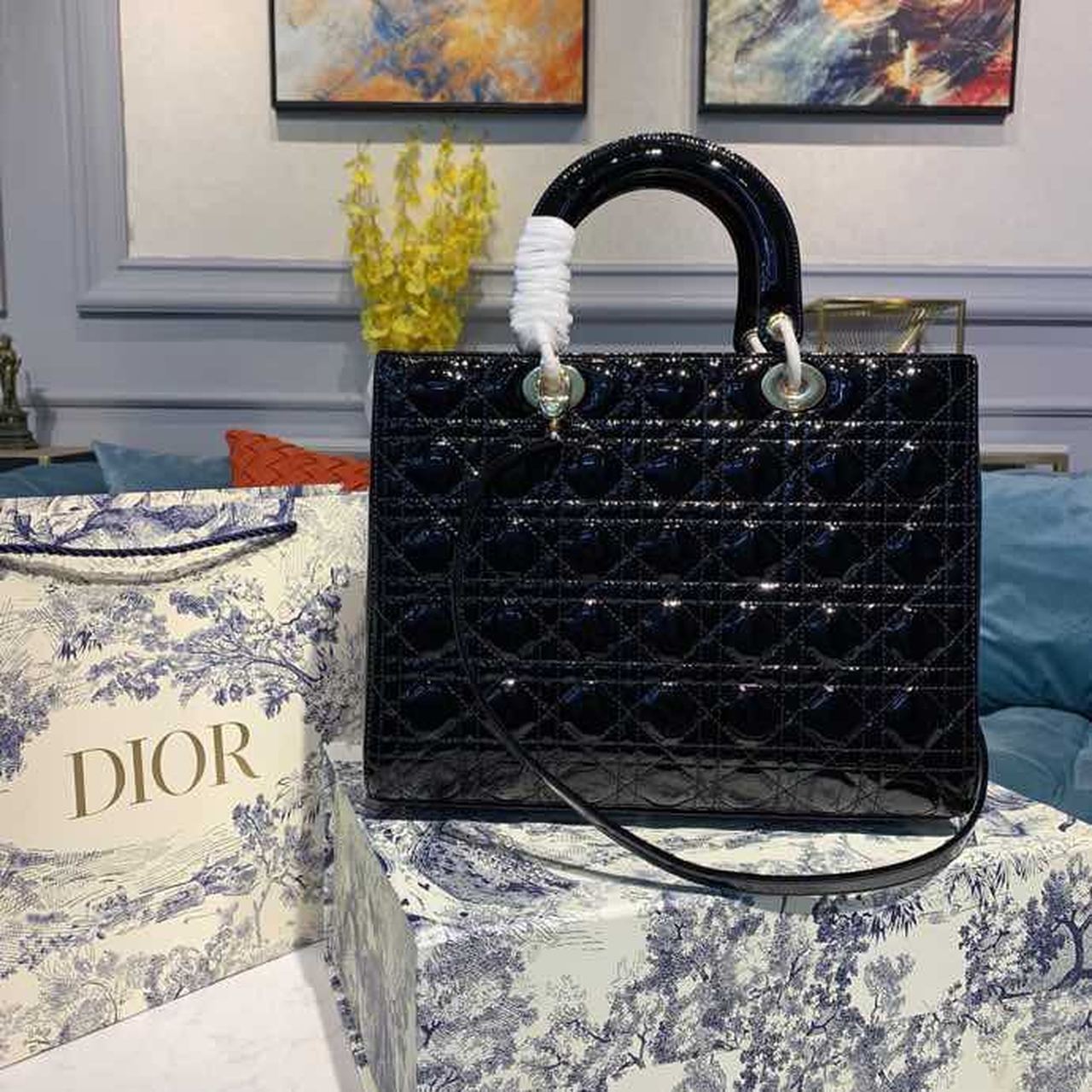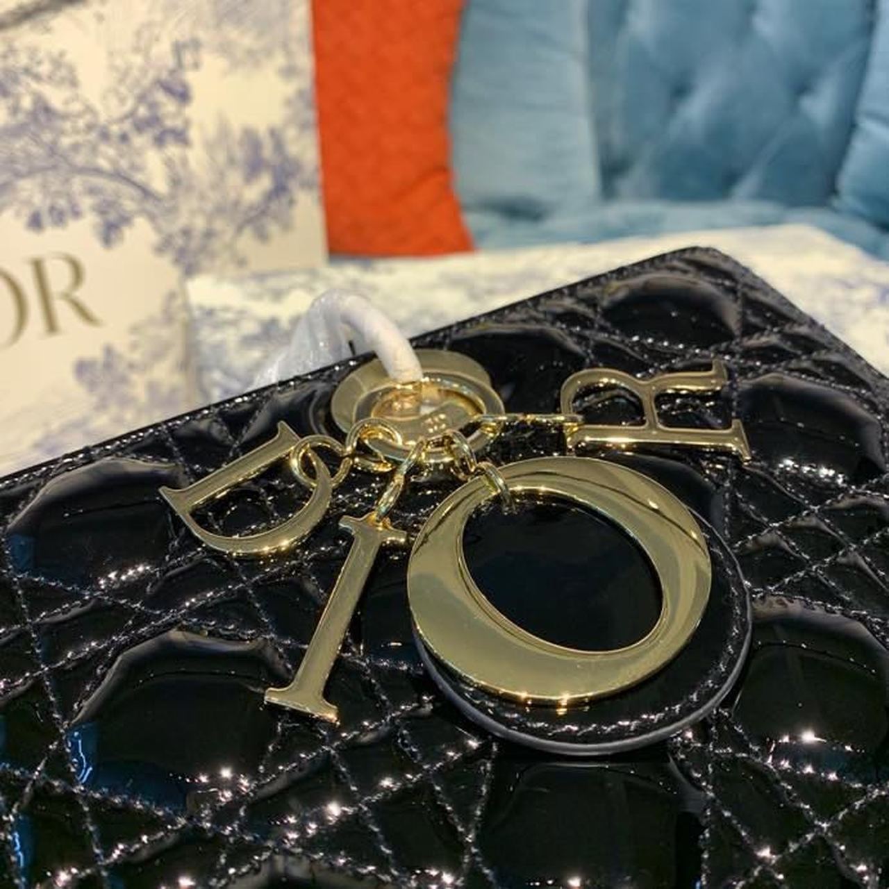 The Lady DYOR handbag epitomizes the House’s vision of elegance and beauty. Sleek and refined, the timeless yet relevant style is crafted in black material with Cannage stitching, creating the instantly recognizable quilted texture. The pale gold-finish metal ‘D.I.O.R.’ charms lend a polished touch to the style. Featuring a thin, removable shoulder strap, the large Lady DYOR bag can be carried by hand, worn over the shoulder or crossbody as an ideal evening companion.