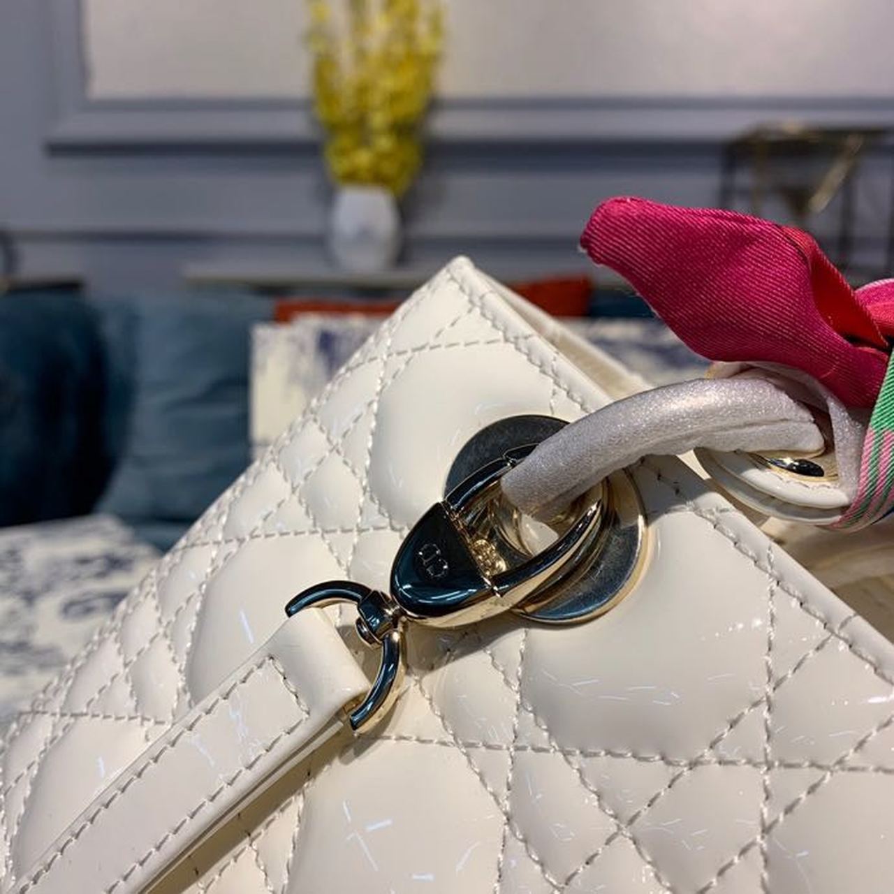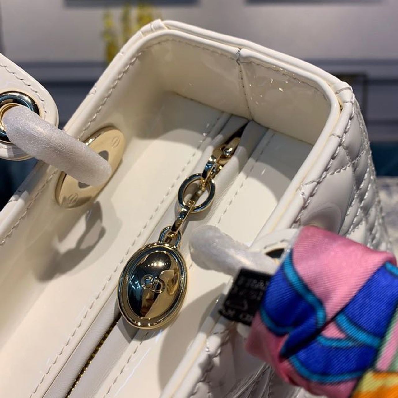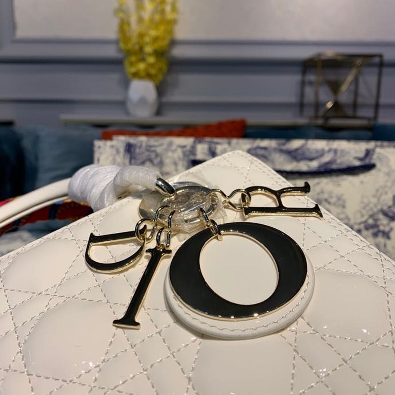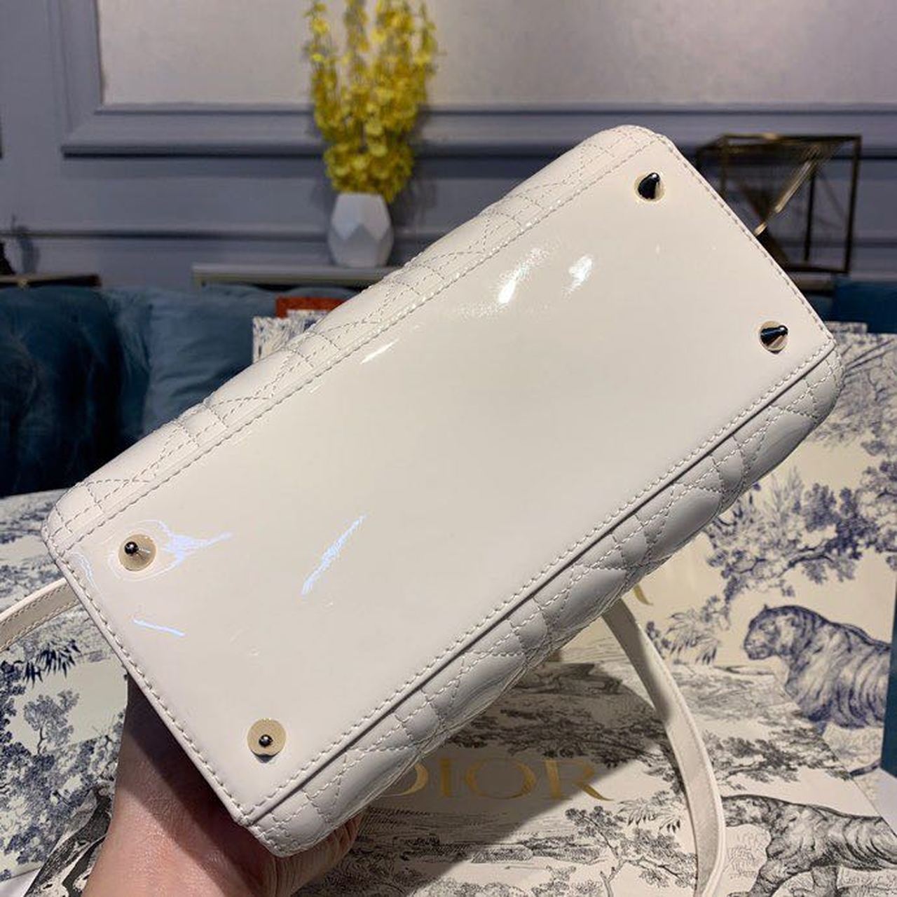 DI Medium Lady Bag Gold Toned Hardware Patent White For Women 24cm/9in CD