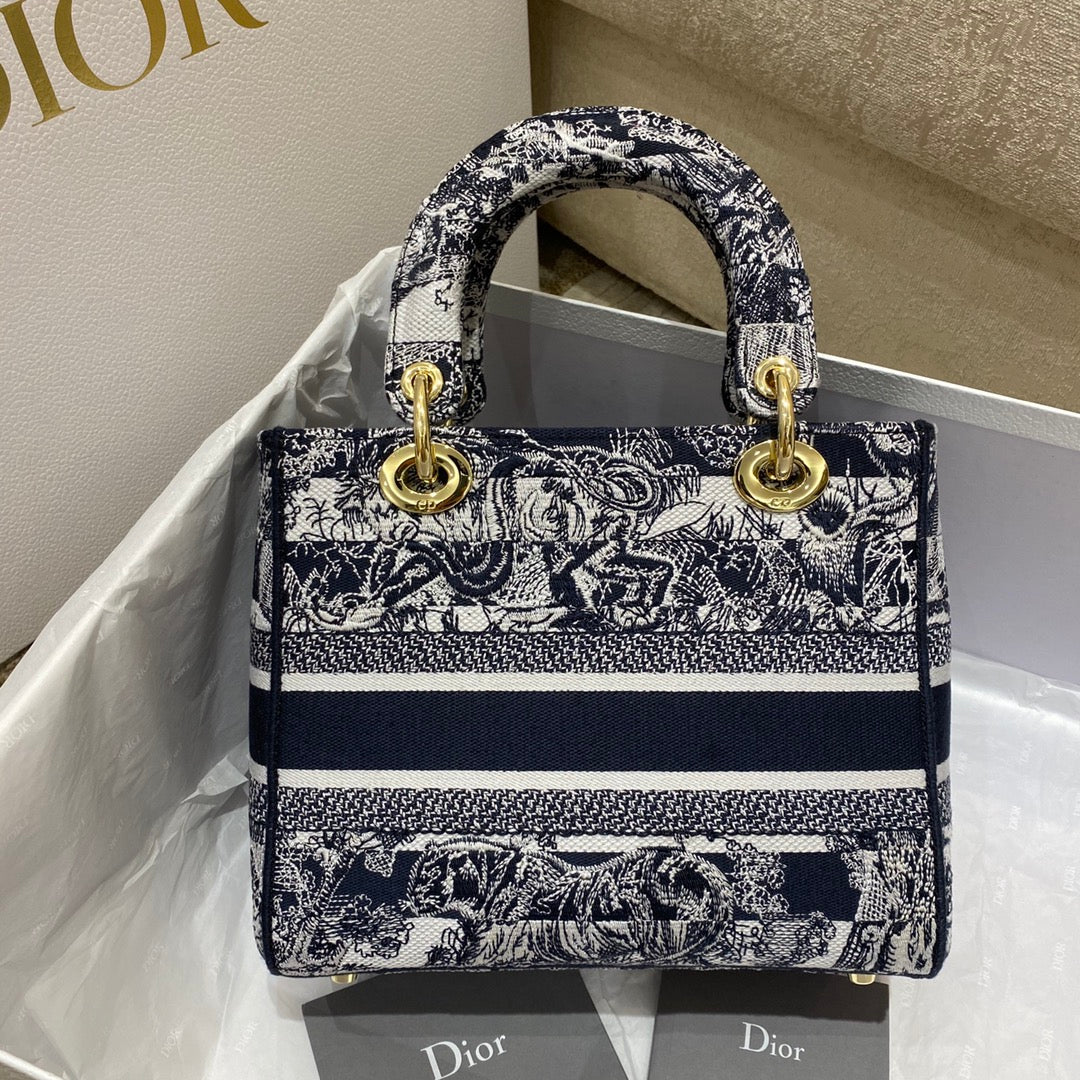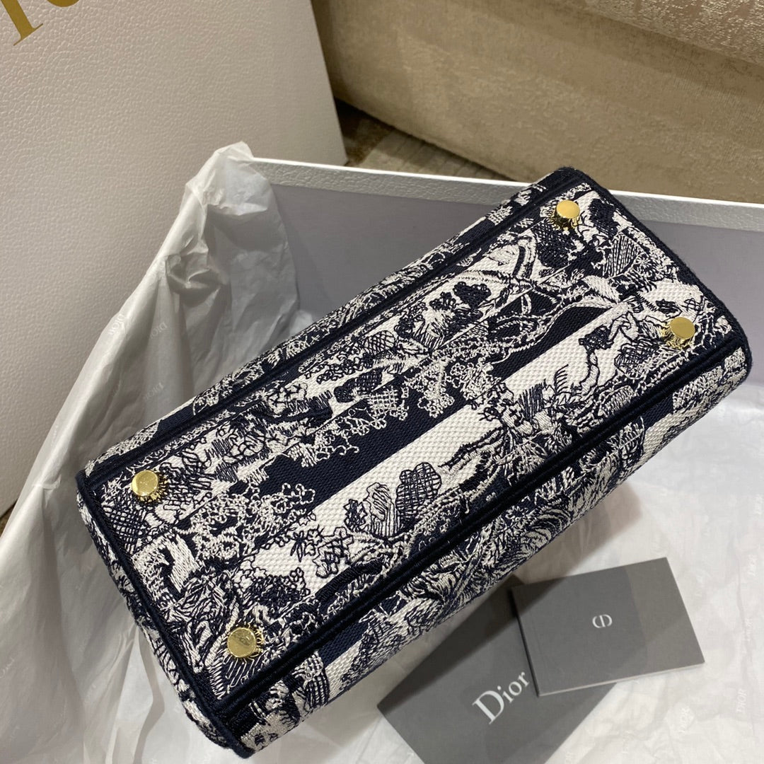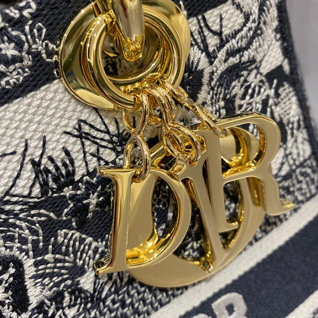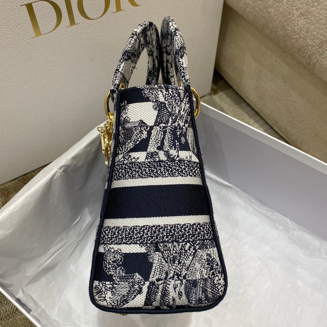 CHRSTN DR Medium Lady D-Lite Bag Toile de Jouy Stripes Embroidery, Navy Blue Handbags, 24cm CD M0565ORLP_M928