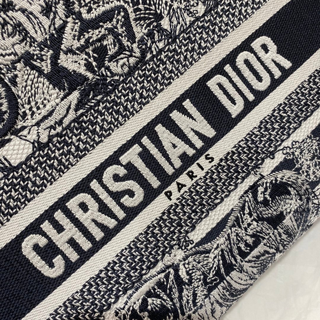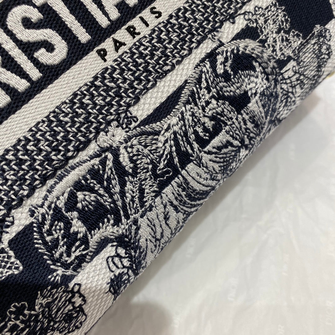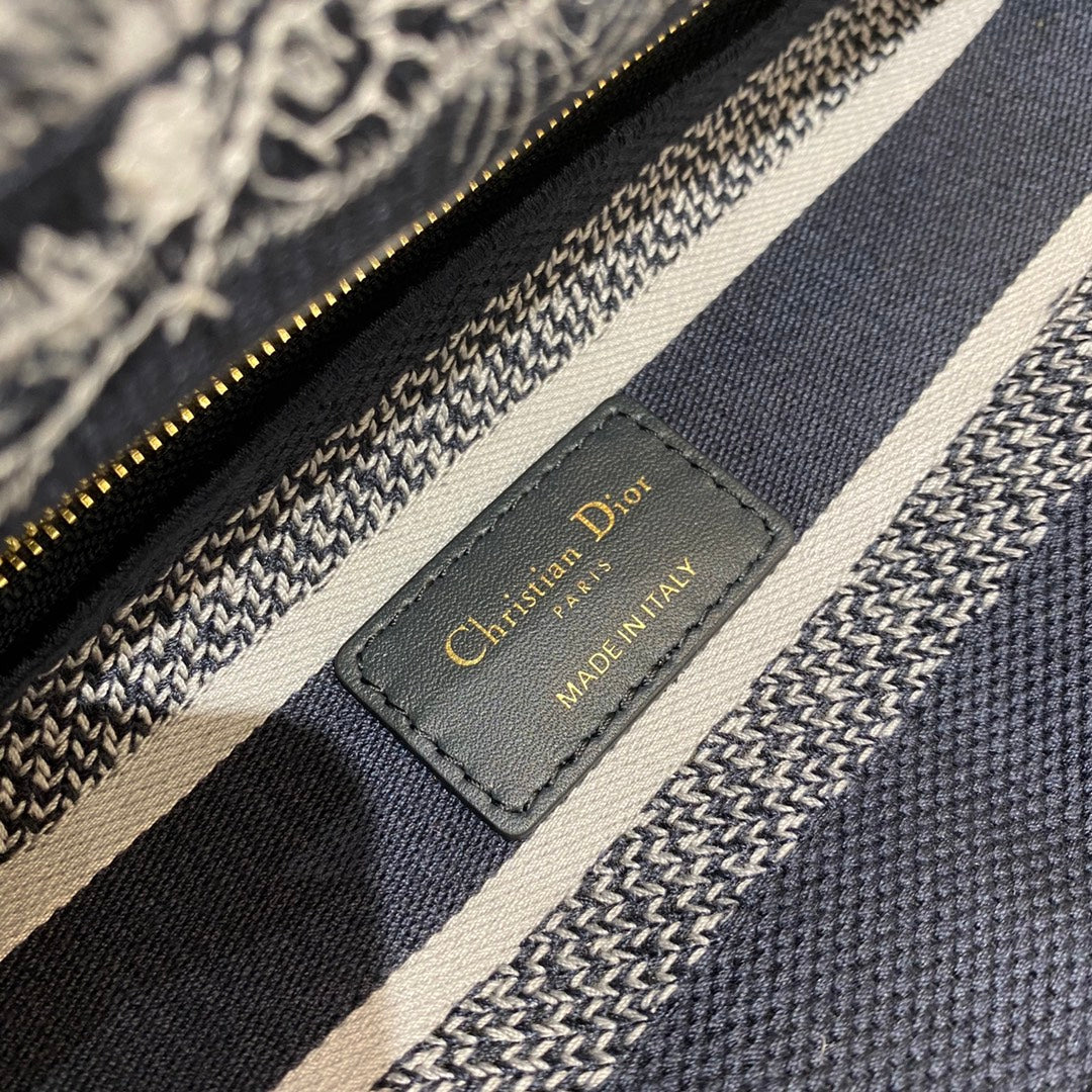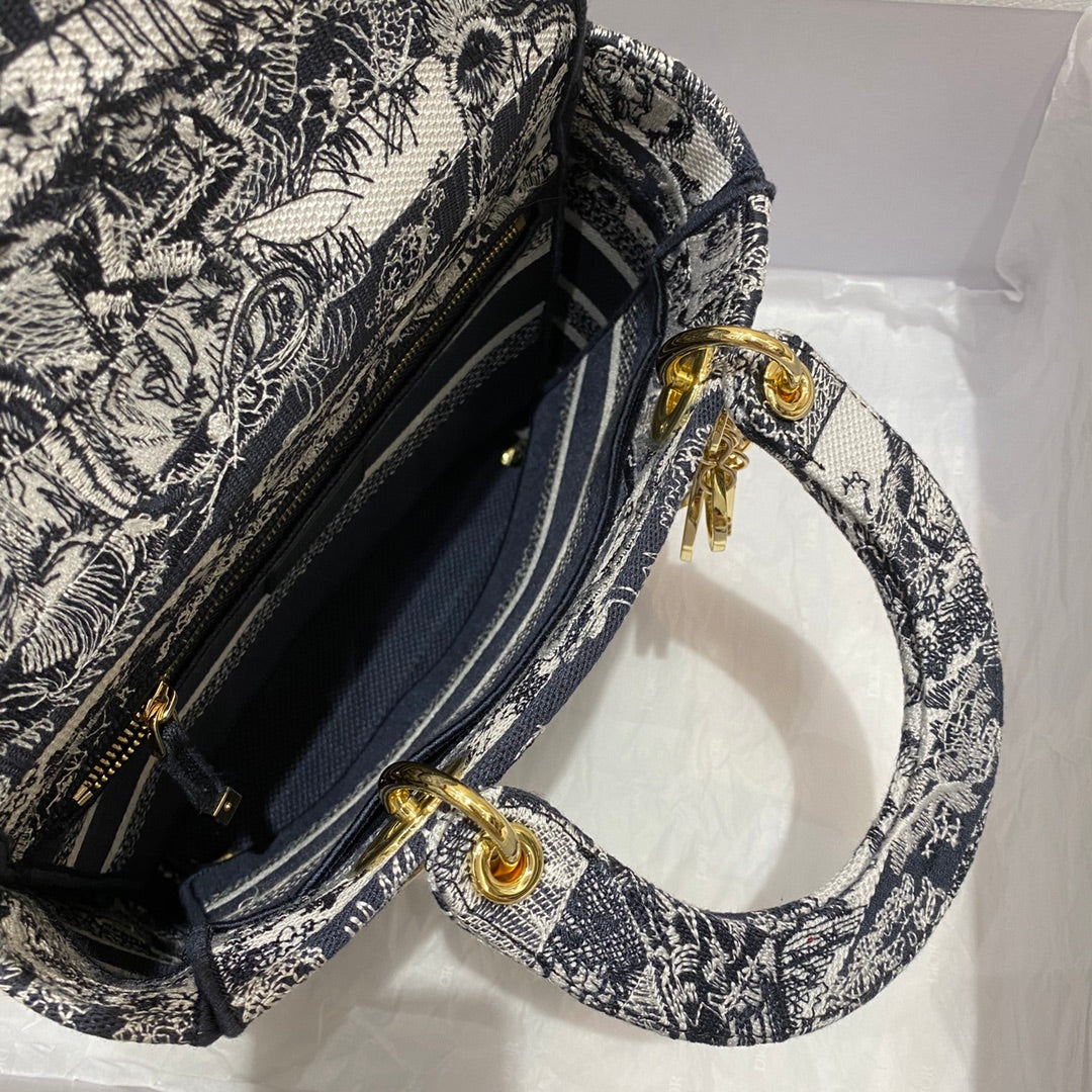 CHRSTN DR Medium Lady D-Lite Bag Toile de Jouy Stripes Embroidery, Navy Blue Handbags, 24cm CD M0565ORLP_M928