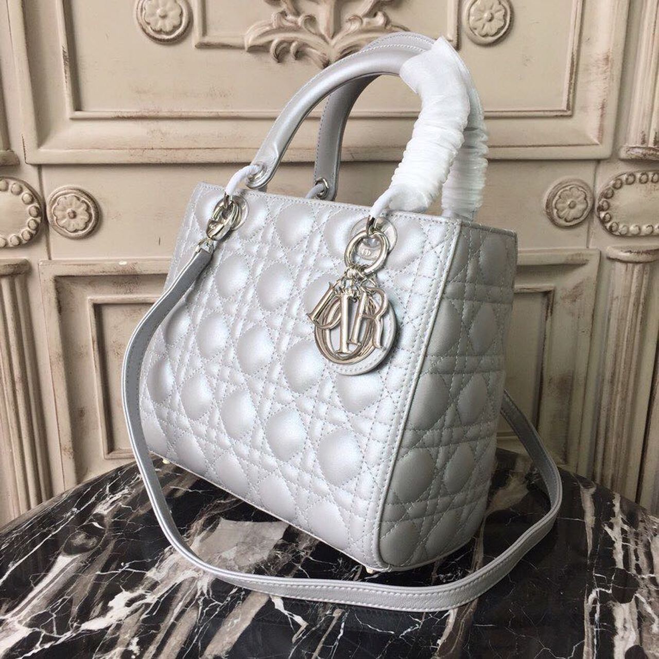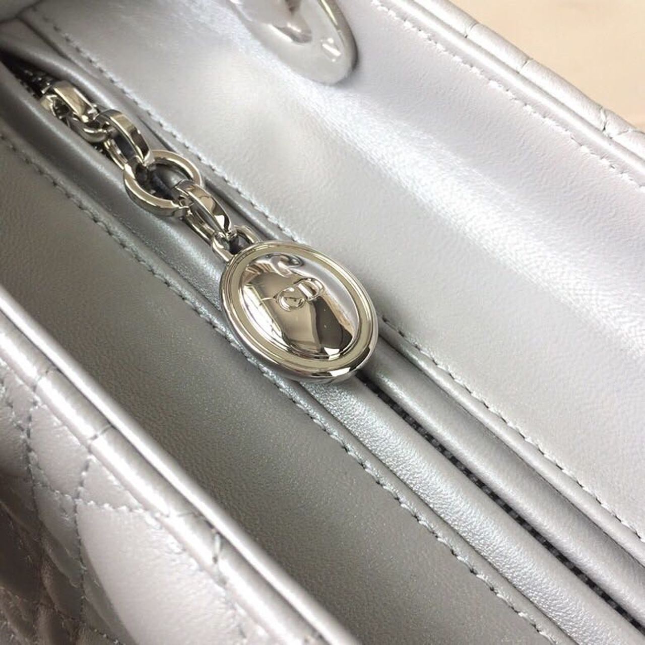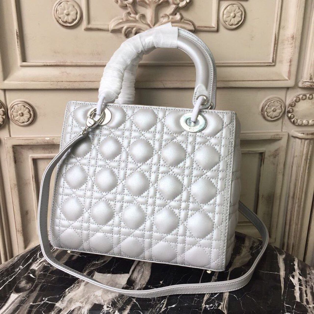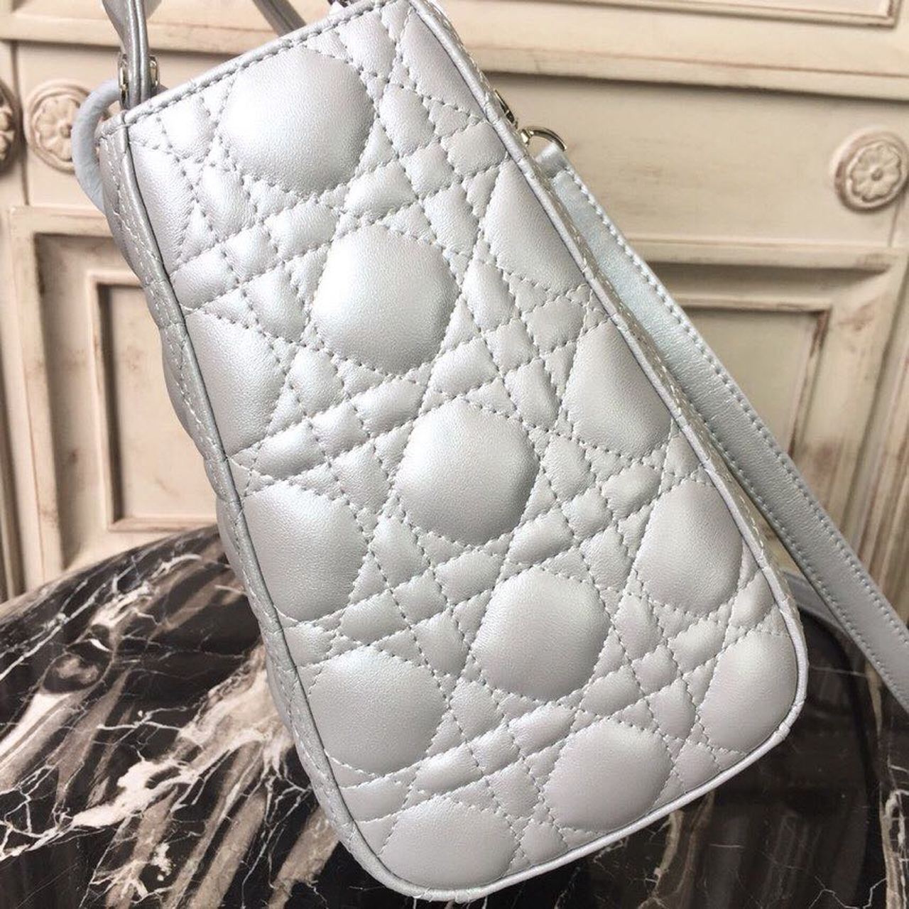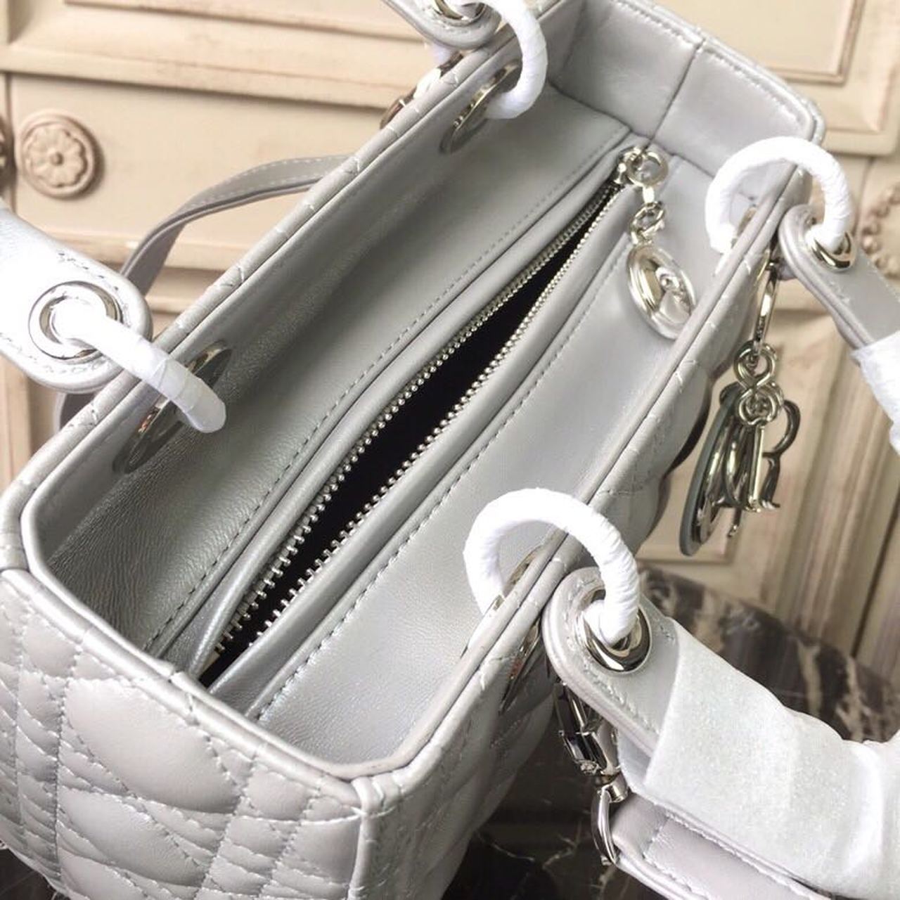 CHRSTN DR Medium Opaline Gray Pearlescent Cannage Lady DYOR Bag Hardware Pearl Gold For Women 9.5in/24cm CD