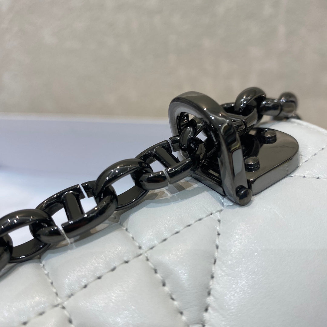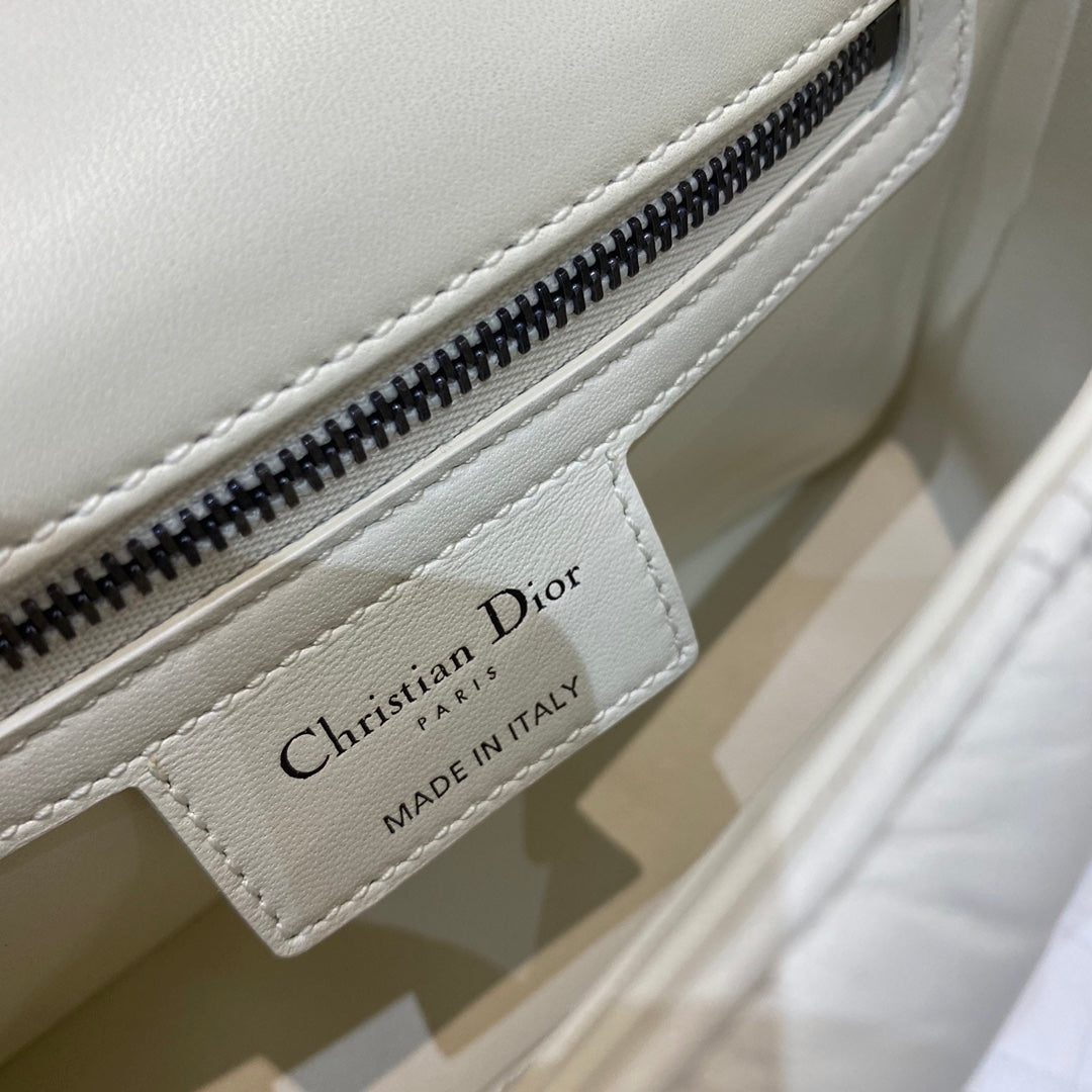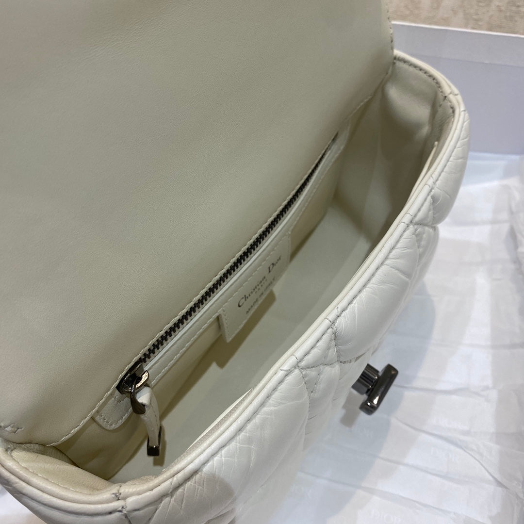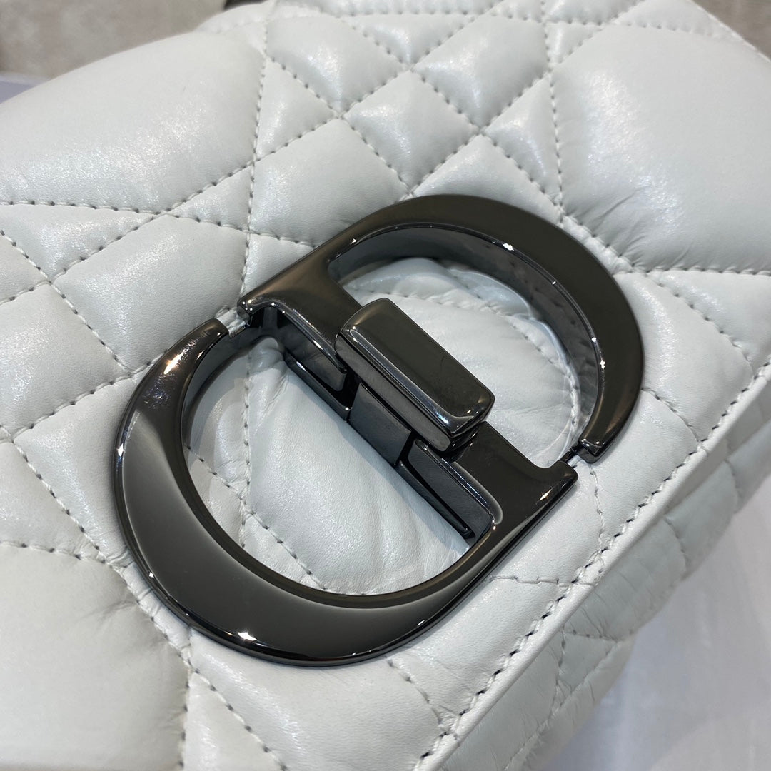 The DYOR Caro bag combines modernity with timeless elegance. The design is crafted in white supple with Cannage stitching. The bag features a flap adorned with an antique metal ‘CD’ twist clasp, inspired by the seal of a CHRSTN DR perfume bottle. The detachable chain shoulder strap with ‘CD’ signature links allows it to be carried by hand, over the shoulder or crossbody, or replaced by one of the House’s wide embroidered straps, allowing the large bag to pair with day or evening attire.