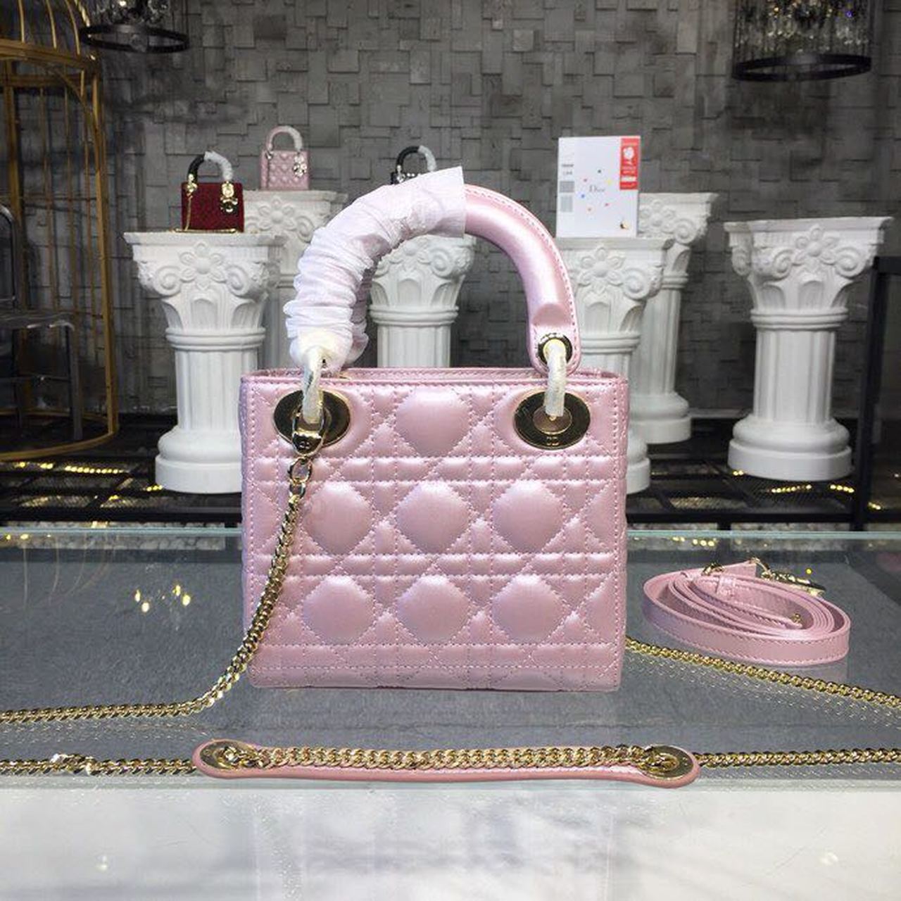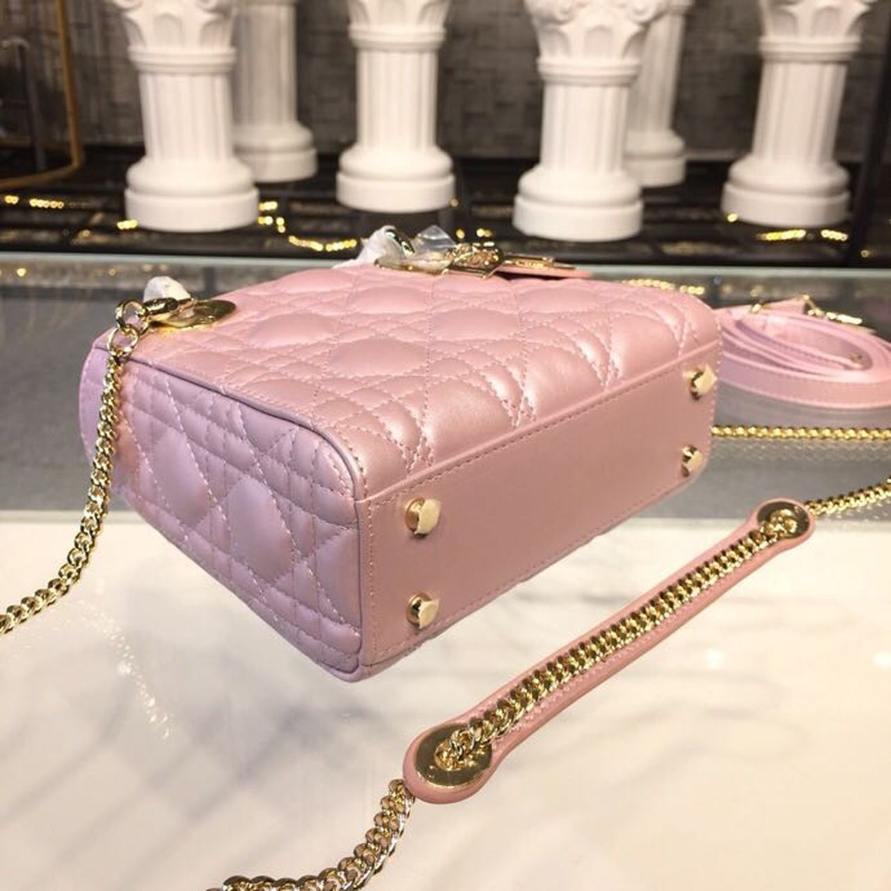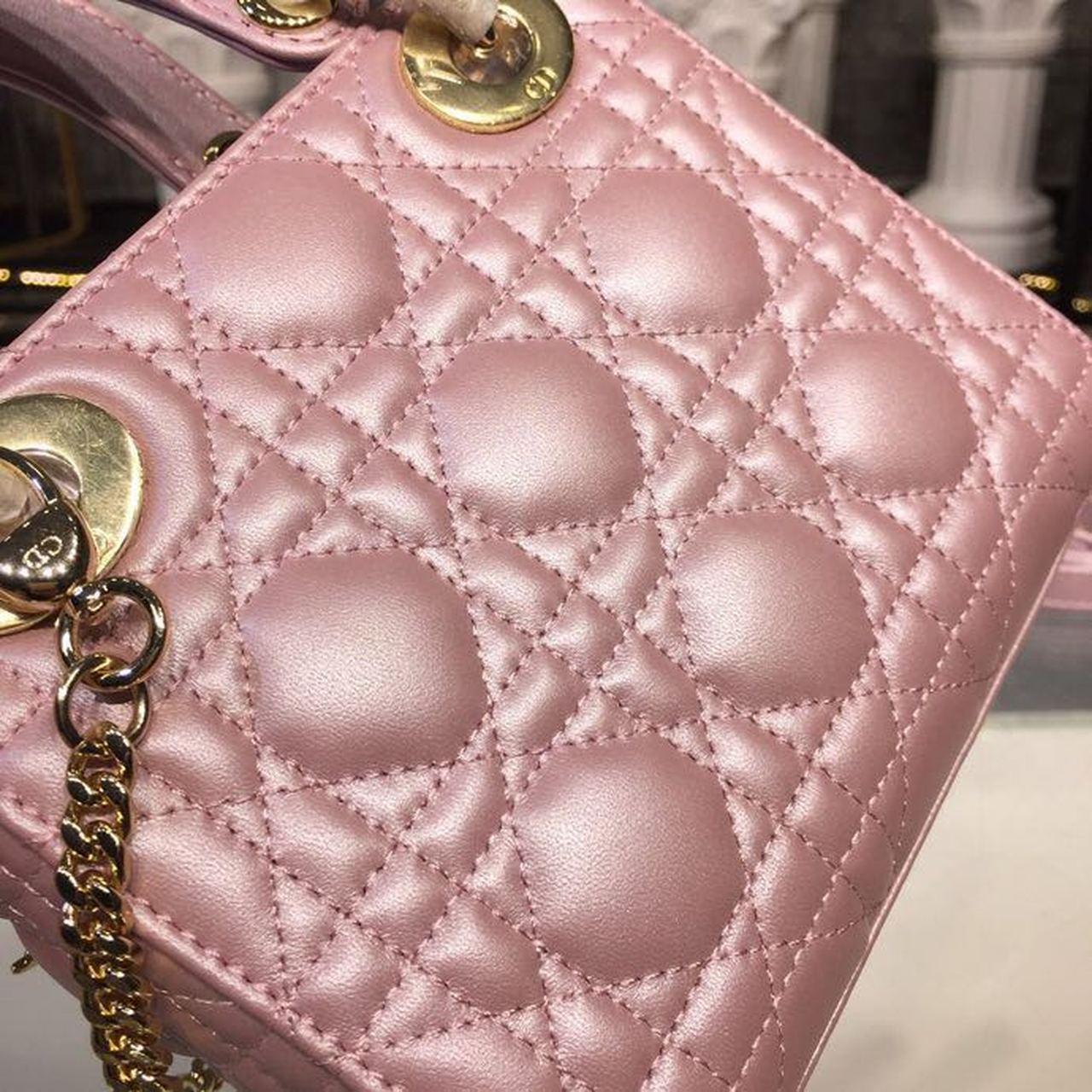 DI Mini Lady Cannage Quilted Bag with Chain Gold Toned Hardware Pink For Women 6.5in/17cm CD
