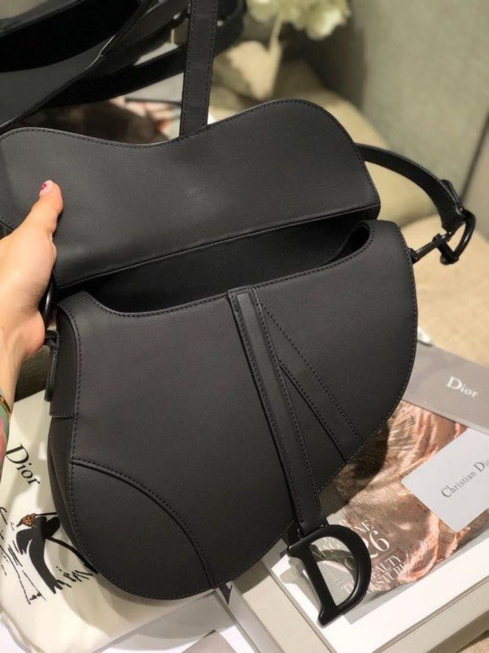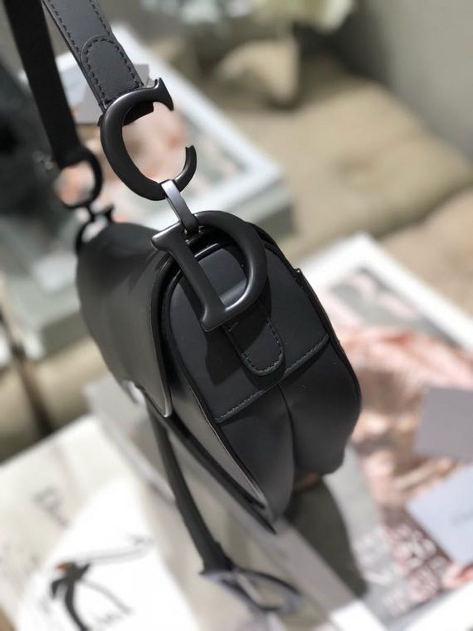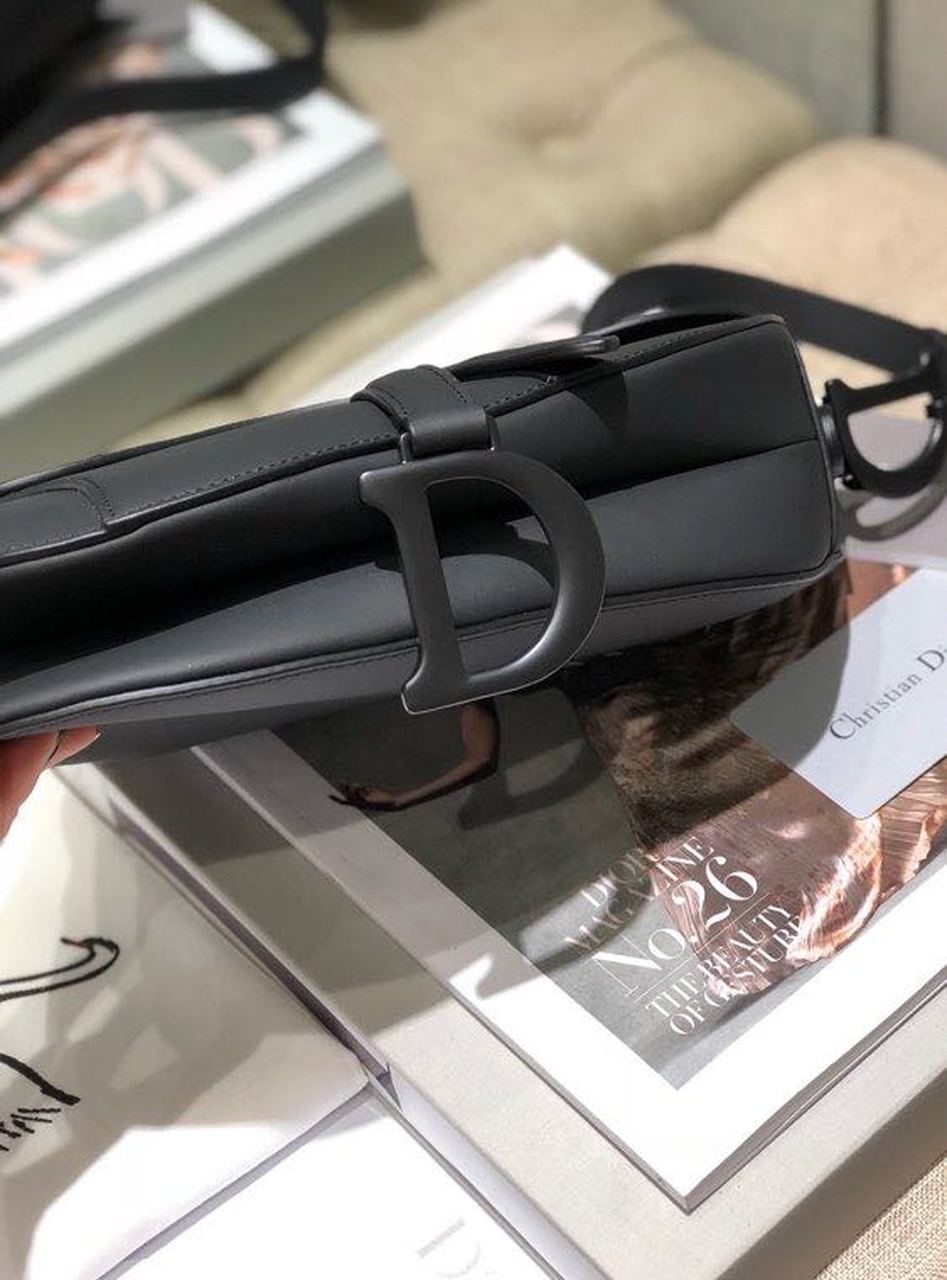 The iconic Saddle bag is reinvented once more by Maria Grazia Chiuri. Featuring a Saddle flap with a magnetic ‘D’ stirrup clasp, it boasts a ‘CD’ signature on each side of the handle. The black ultramatte style is embellished with tonal metal hardware. The Saddle bag may be carried by hand or worn over the shoulder and can be customized with different shoulder straps.
