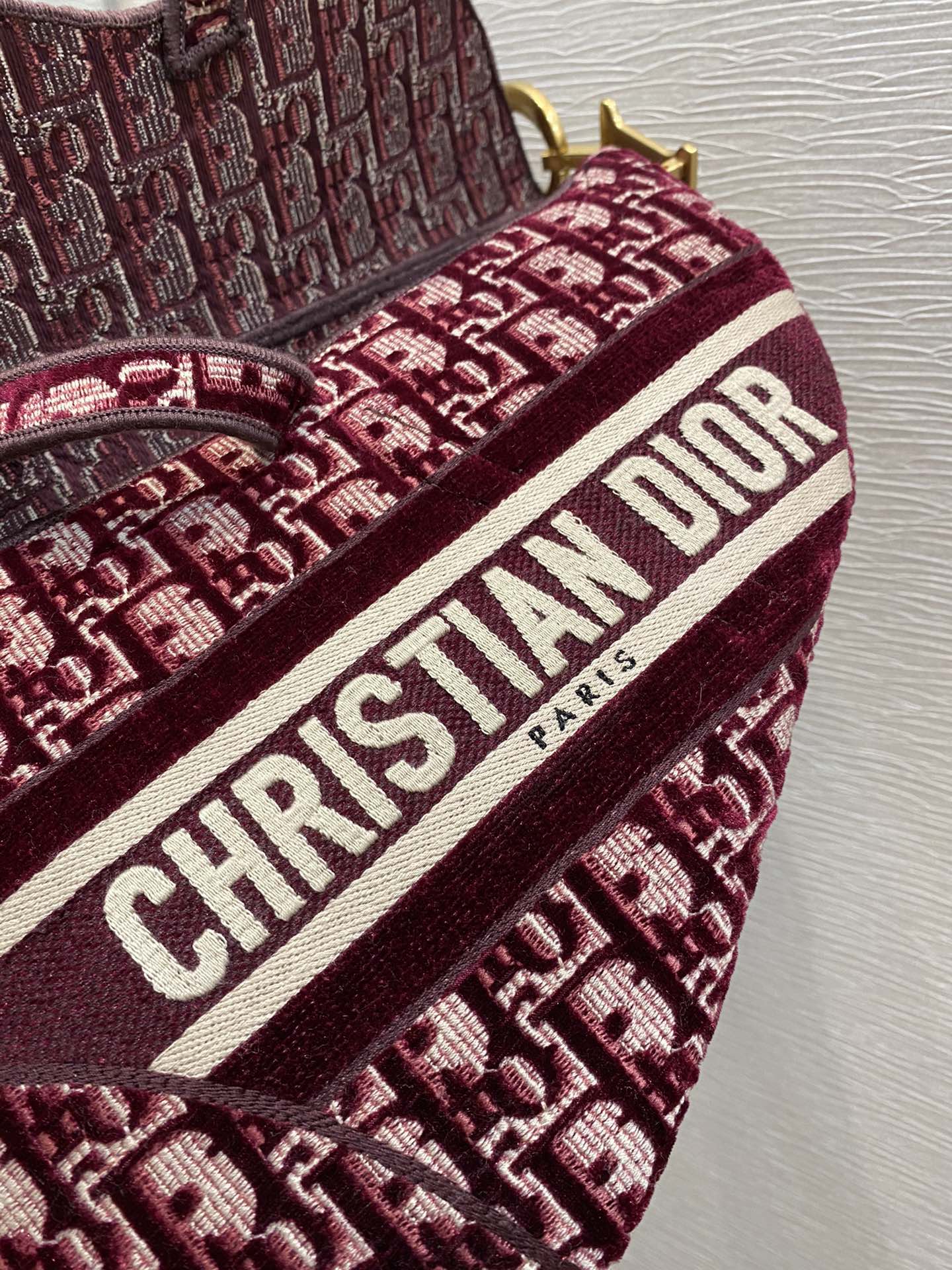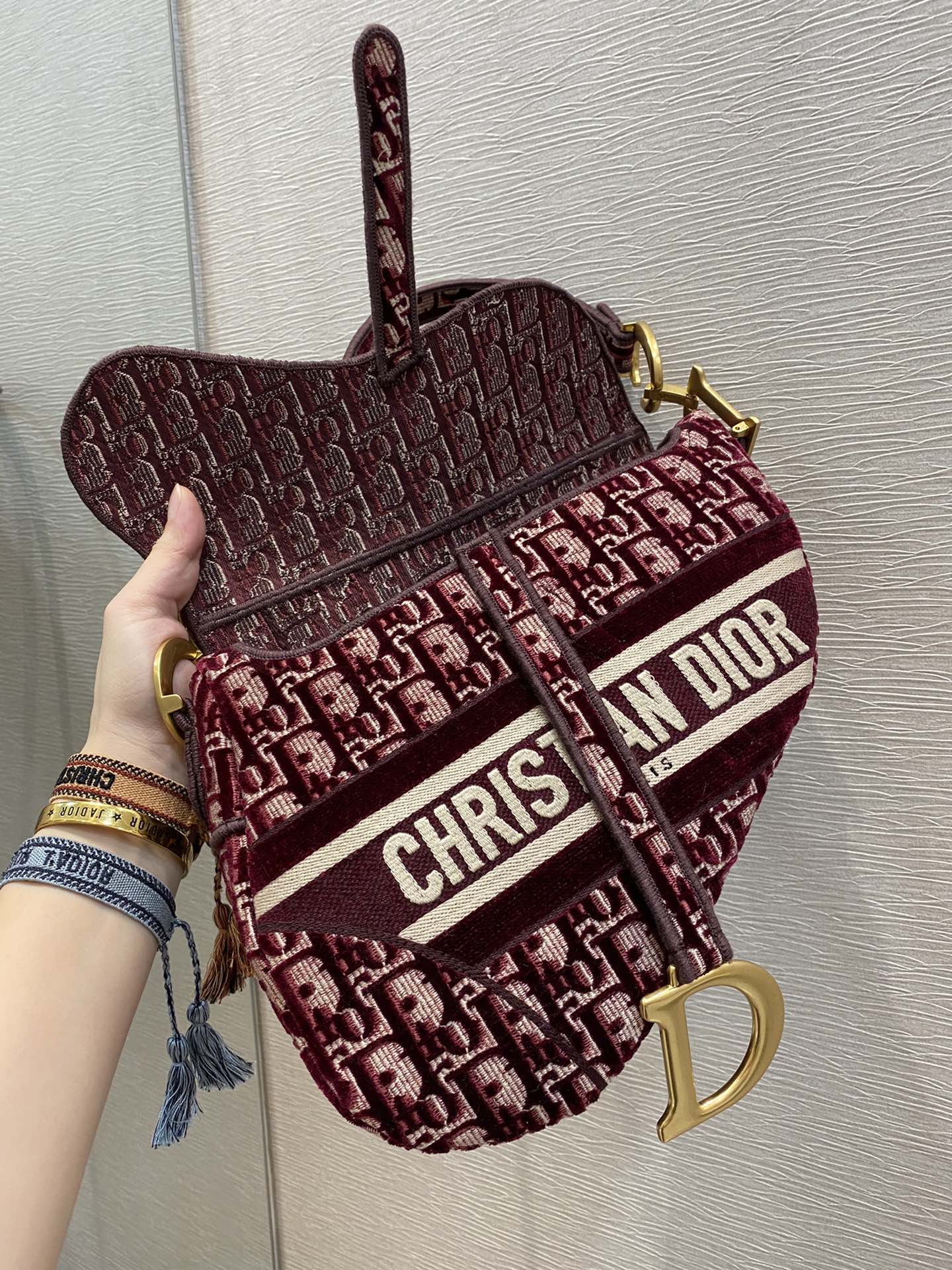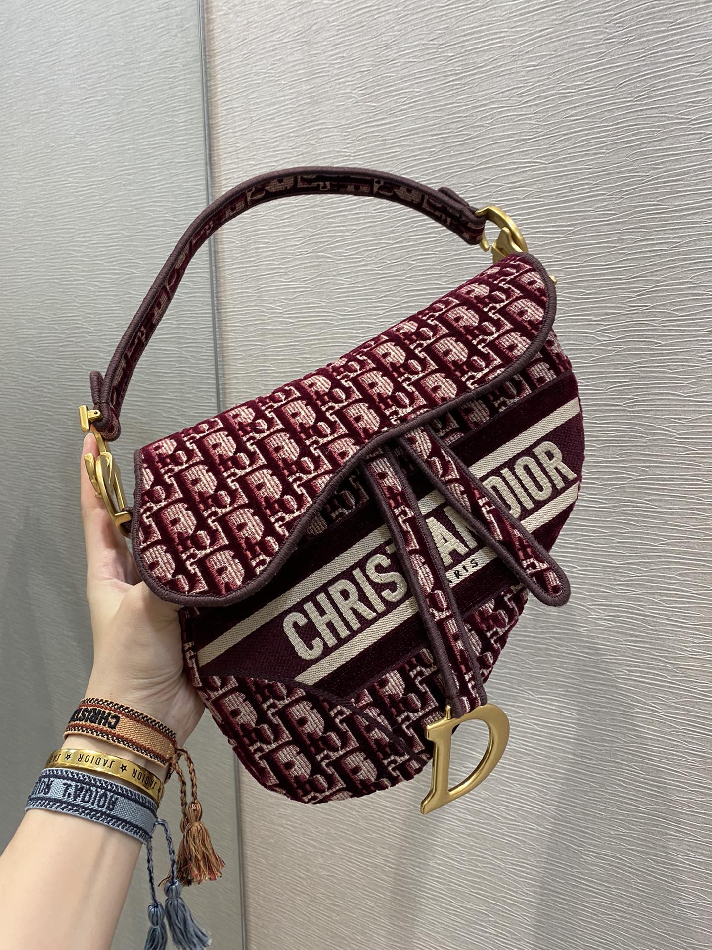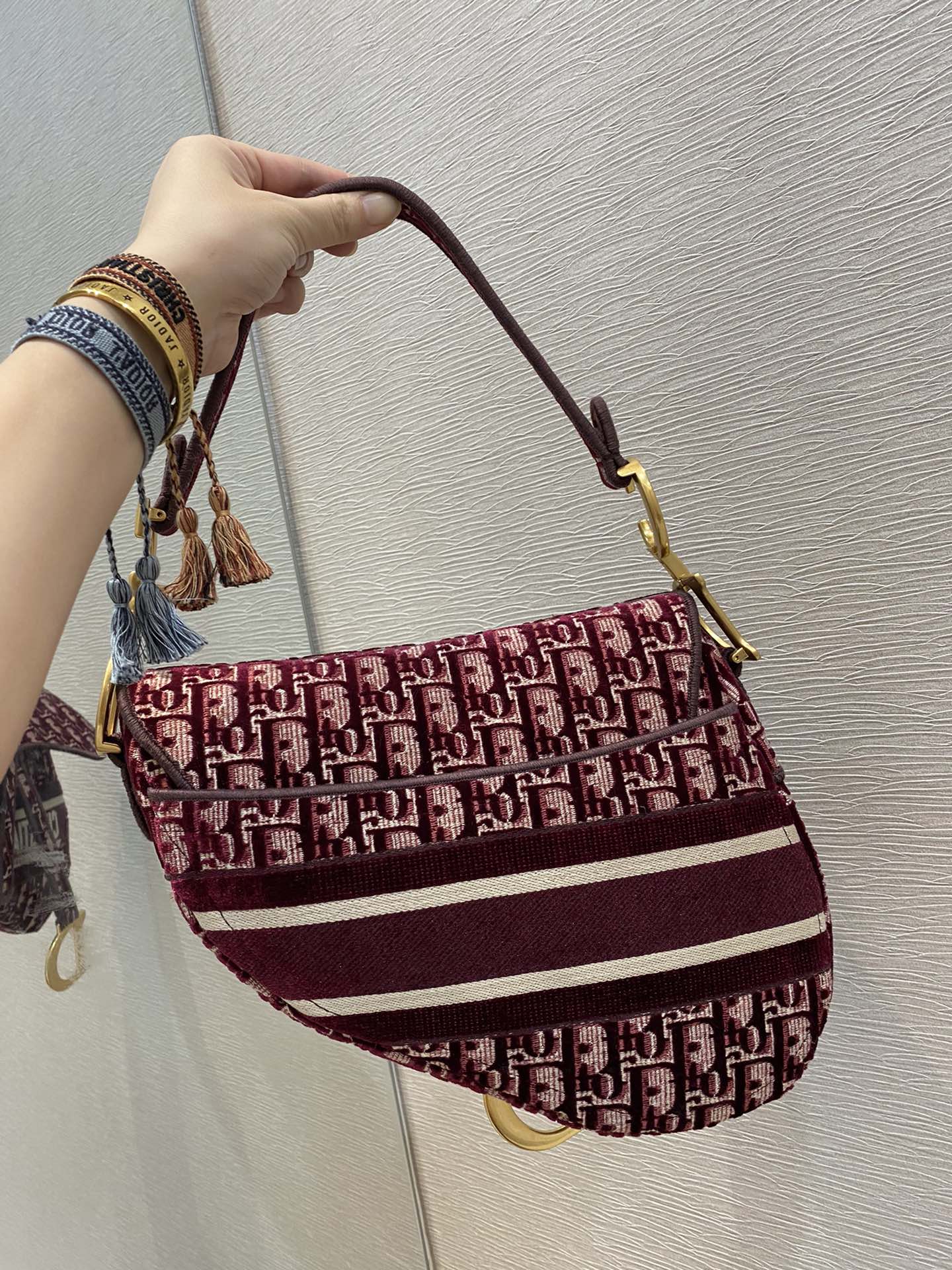Maria Grazia Chiuri brings a fresh update to the legendary Saddle bag. Featuring a Saddle flap with a magnetic ‘D’ stirrup clasp, it features a ‘CD’ signature on each side of the handle. The burgundy Oblique jacquard is embellished with antique gold-finish metal details. The Saddle bag may be carried by hand or worn over the shoulder and can be customized with different shoulder straps.