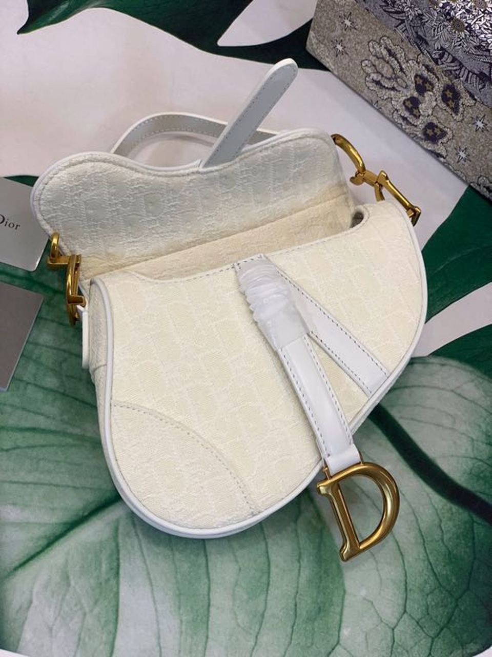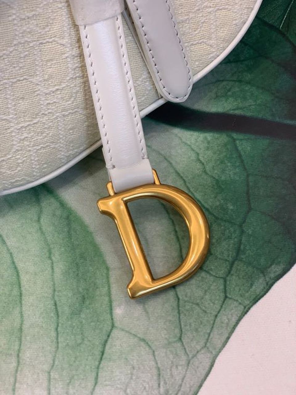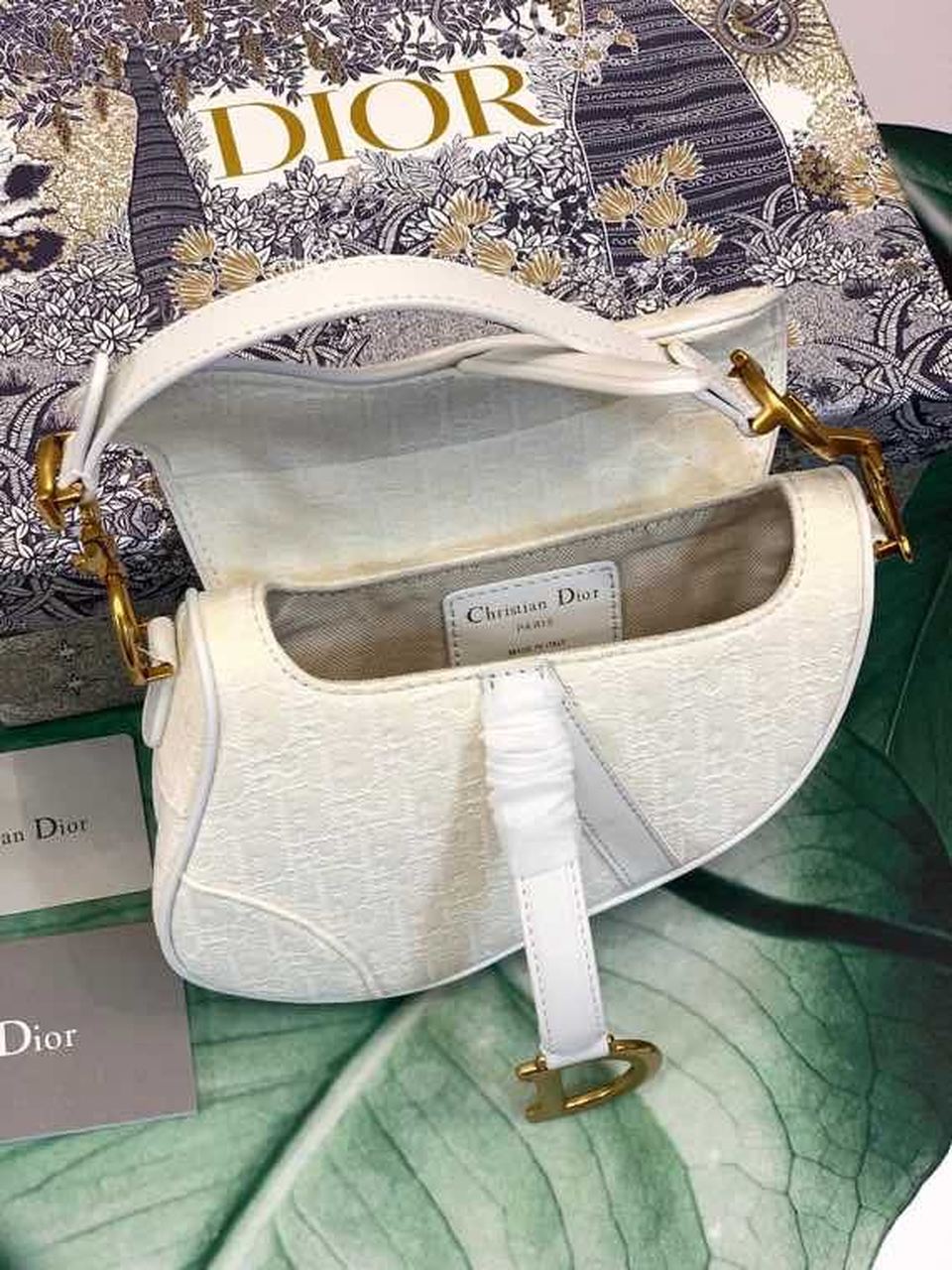 The iconic Saddle bag, crafted in white , is reimagined by Maria Grazia Chiuri. The legendary design is embellished with a DYOR Oblique perforations motif and features a Saddle flap with a magnetic ‘D’ stirrup clasp and an antique gold-finish metal ‘CD’ signature on either side of the strap. The bag has a wide embroidered strap, both adjustable and removable, and may be carried by hand, worn over the shoulder or crossbody.