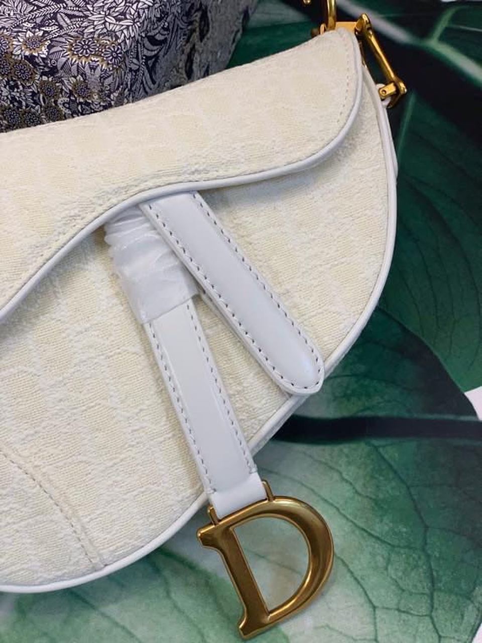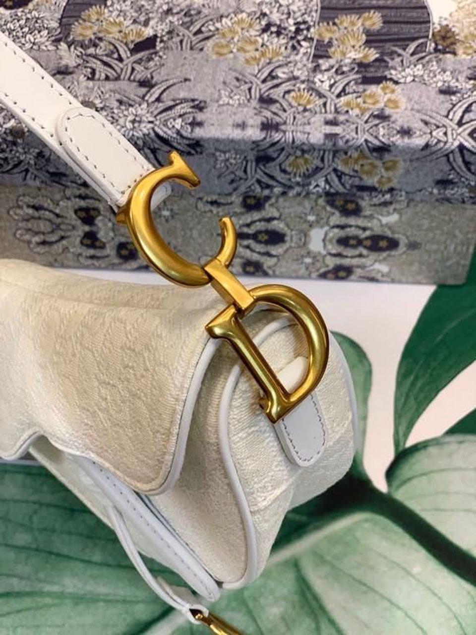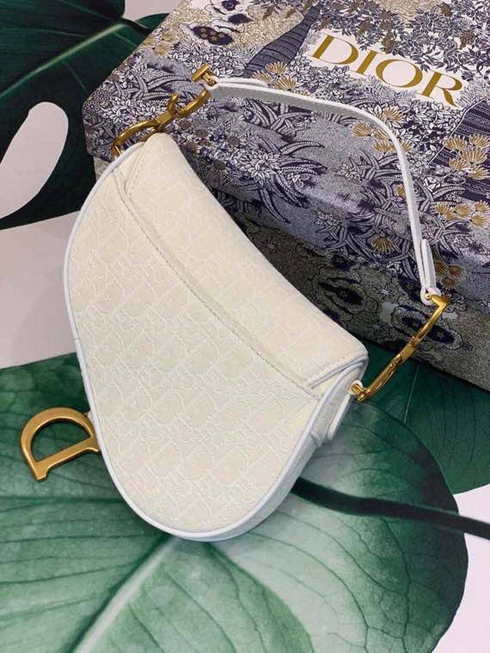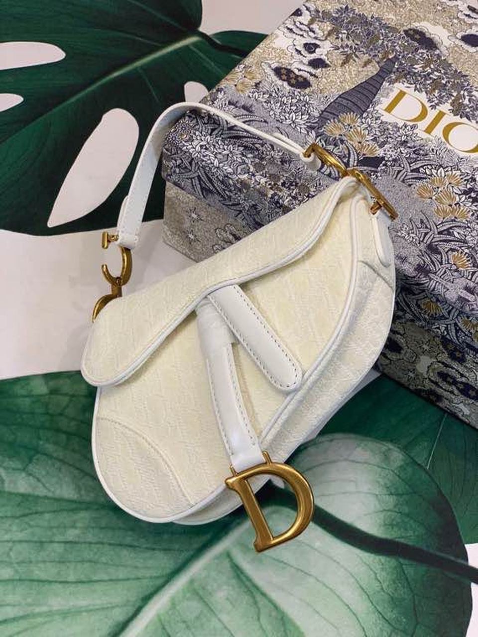 The iconic Saddle bag, crafted in white , is reimagined by Maria Grazia Chiuri. The legendary design is embellished with a DYOR Oblique perforations motif and features a Saddle flap with a magnetic ‘D’ stirrup clasp and an antique gold-finish metal ‘CD’ signature on either side of the strap. The bag has a wide embroidered strap, both adjustable and removable, and may be carried by hand, worn over the shoulder or crossbody.