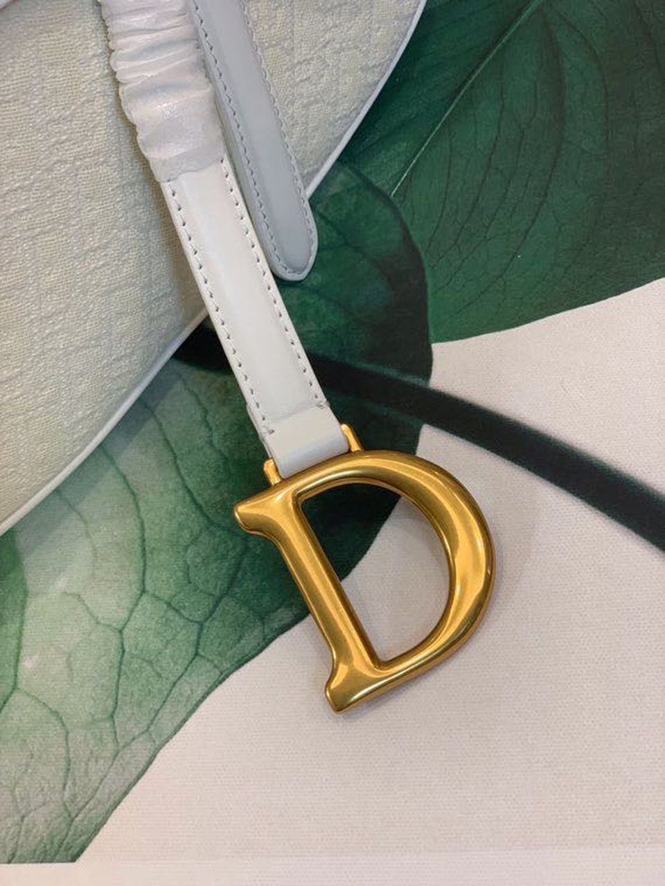 The iconic Saddle bag, crafted in white , is reimagined by Maria Grazia Chiuri. The legendary design is embellished with a DYOR Oblique perforations motif and features a Saddle flap with a magnetic ‘D’ stirrup clasp and an antique gold-finish metal ‘CD’ signature on either side of the strap. The bag has a wide embroidered strap, both adjustable and removable, and may be carried by hand, worn over the shoulder or crossbody.