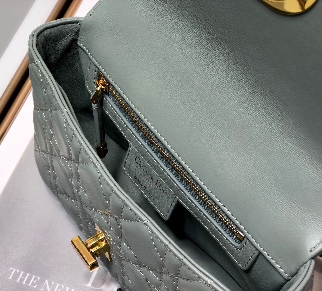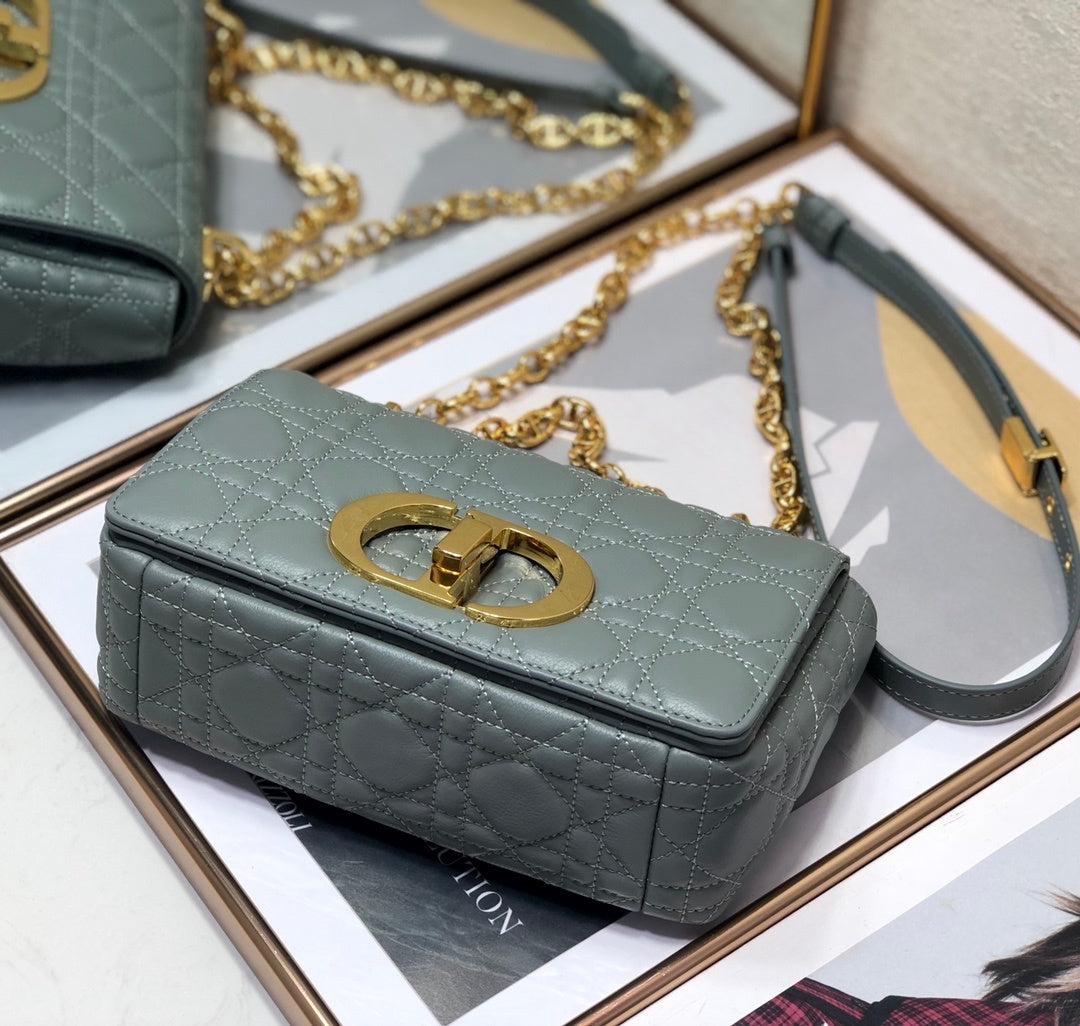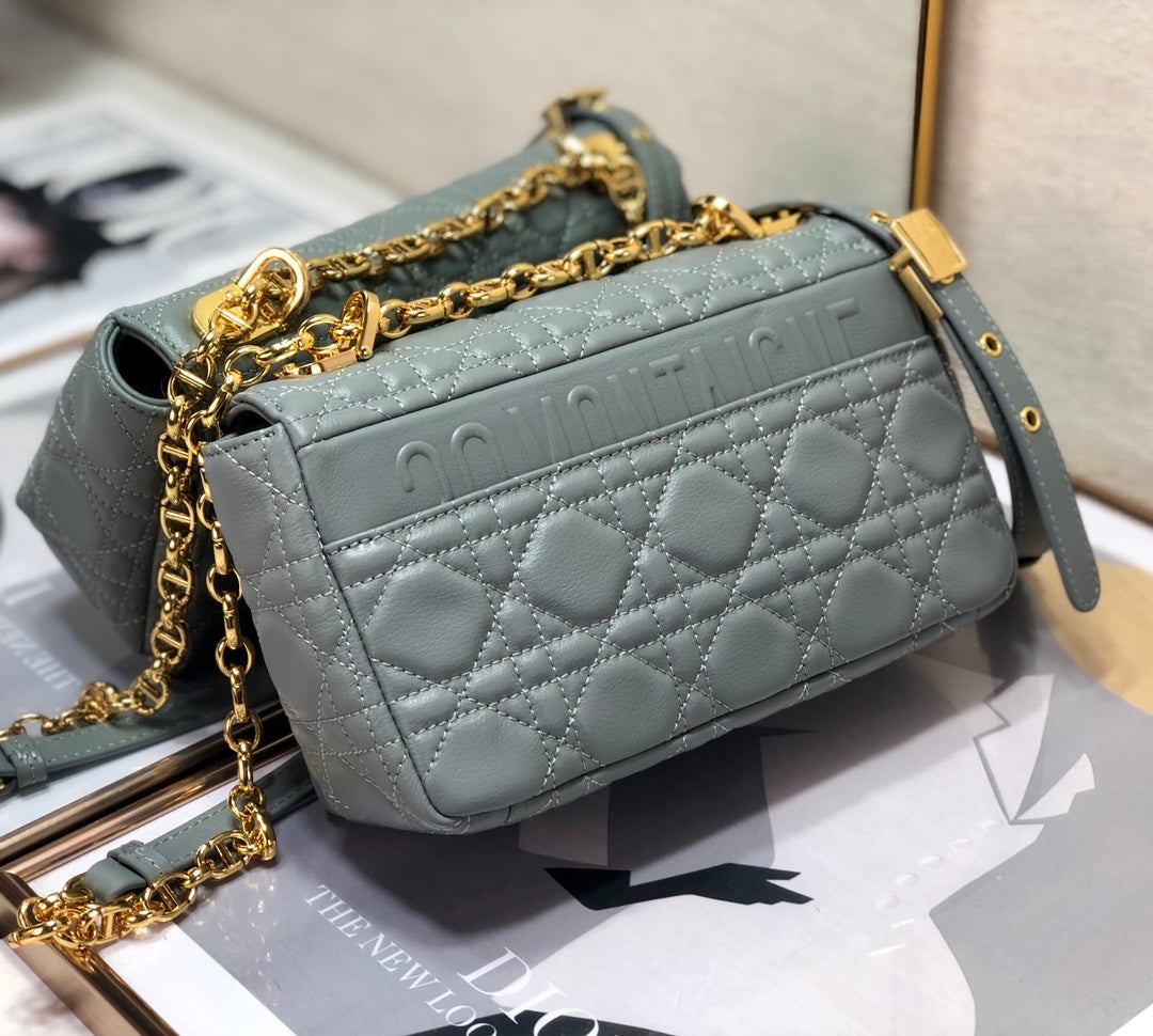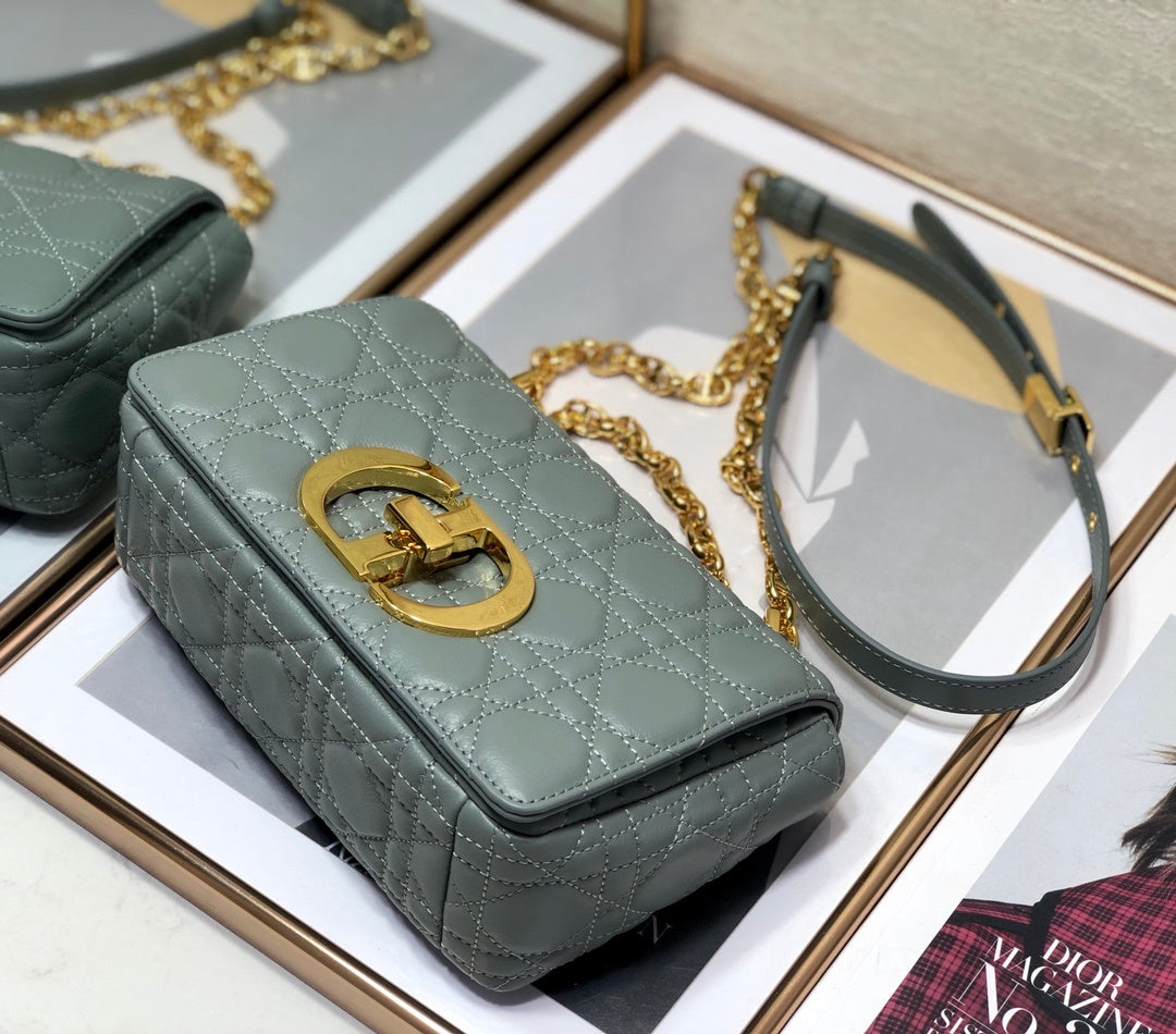 The DYOR Caro bag combines modernity with timeless elegance. The design is crafted in gray supple with Cannage stitching. The bag features a flap adorned with an antique gold-finish metal ‘CD’ twist clasp, inspired by the seal of a CHRSTN DR perfume bottle. The detachable chain shoulder strap with ‘CD’ signature links allows it to be carried by hand, over the shoulder or crossbody, or replaced by one of the House’s wide embroidered straps, allowing the small bag to pair with day or evening attire.