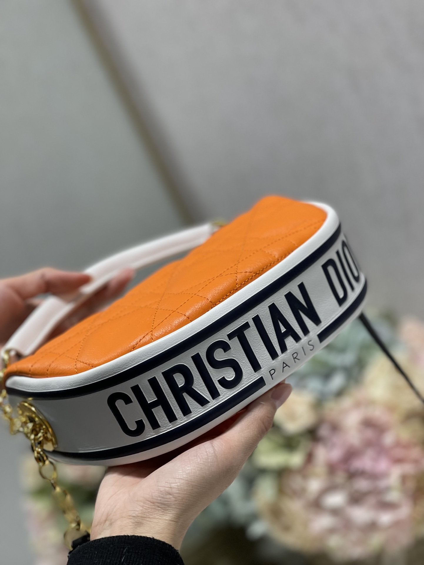 Maria Grazia Chiuri’s DYOR Vibe bag modernizes the allure of a Hobo style with modern lines while embodying the collection’s colorful pop universe. Crafted in fluorescent orange Macrocannage, the bag has a black ‘CHRSTN DR PARIS’ signature adorns the bottom of the bag. Featuring a handle in addition to a removable and adjustable shoulder strap with a military-inspired buckle, the small DYOR Vibe bag can be carried by hand, worn over the shoulder or crossbody for a sportier look.