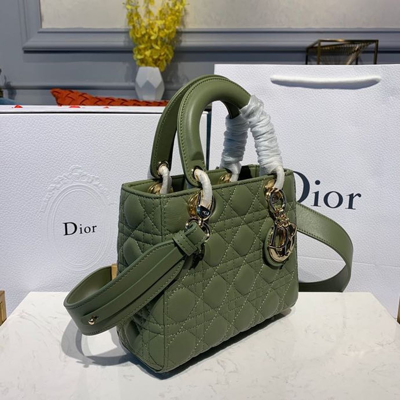 DI Small Lady Bag Gold Toned Hardware Olive Green For Women 8in/20cm CD