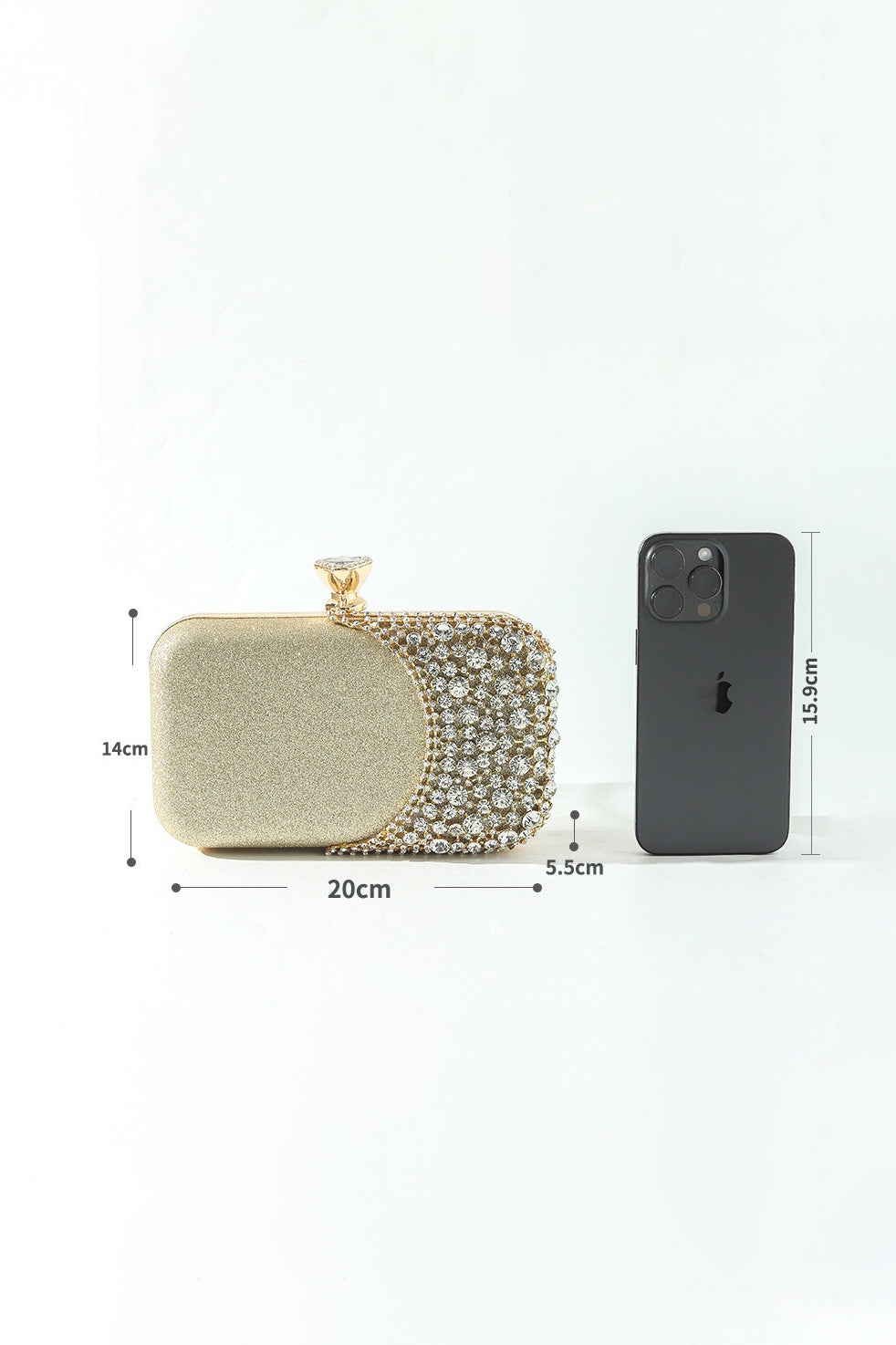 Shine at your next dinner event with this diamond-studded clutch bag. The sparkling rhinestones and shiny chain strap make it the perfect accessory for formal gatherings. Its compact design offers just enough space for your essentials while adding a touch of glamour to your evening.