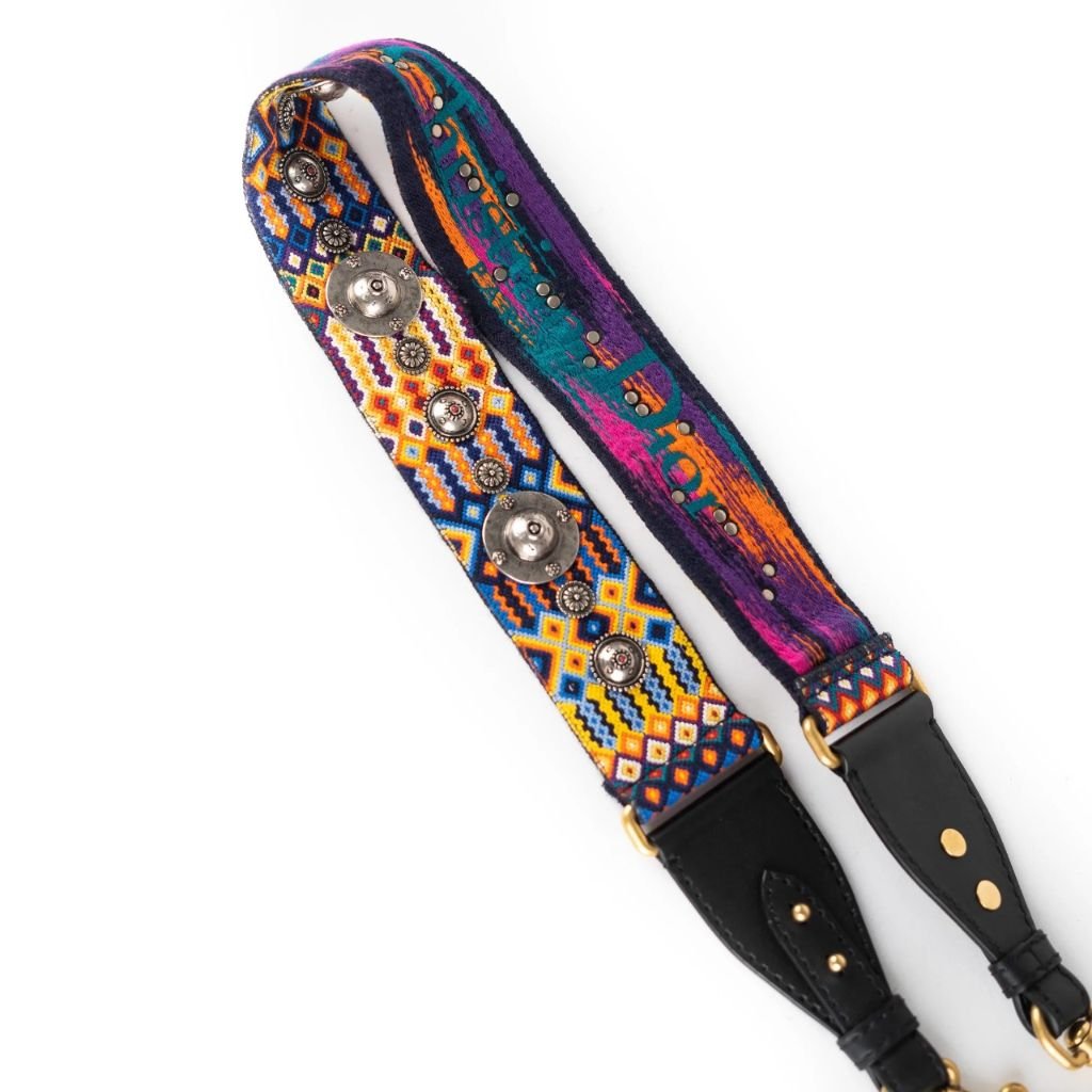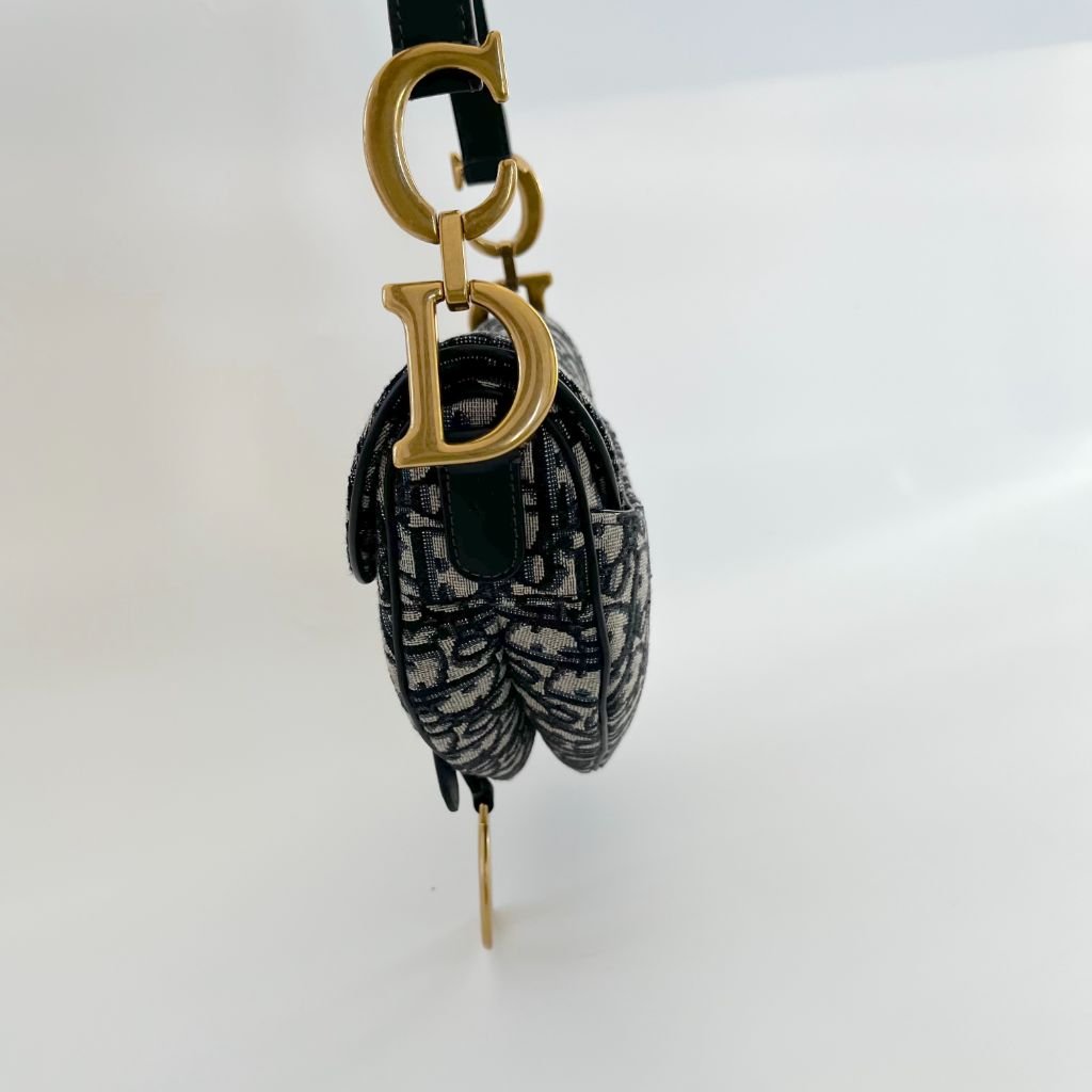 Dior Blue Oblique Canvas And Leather Saddle shoulder bag, has gold-tone 'CD' letters to hold the single handle and a letter 'D' attached to the flap. Comes with embroidered detachable strap