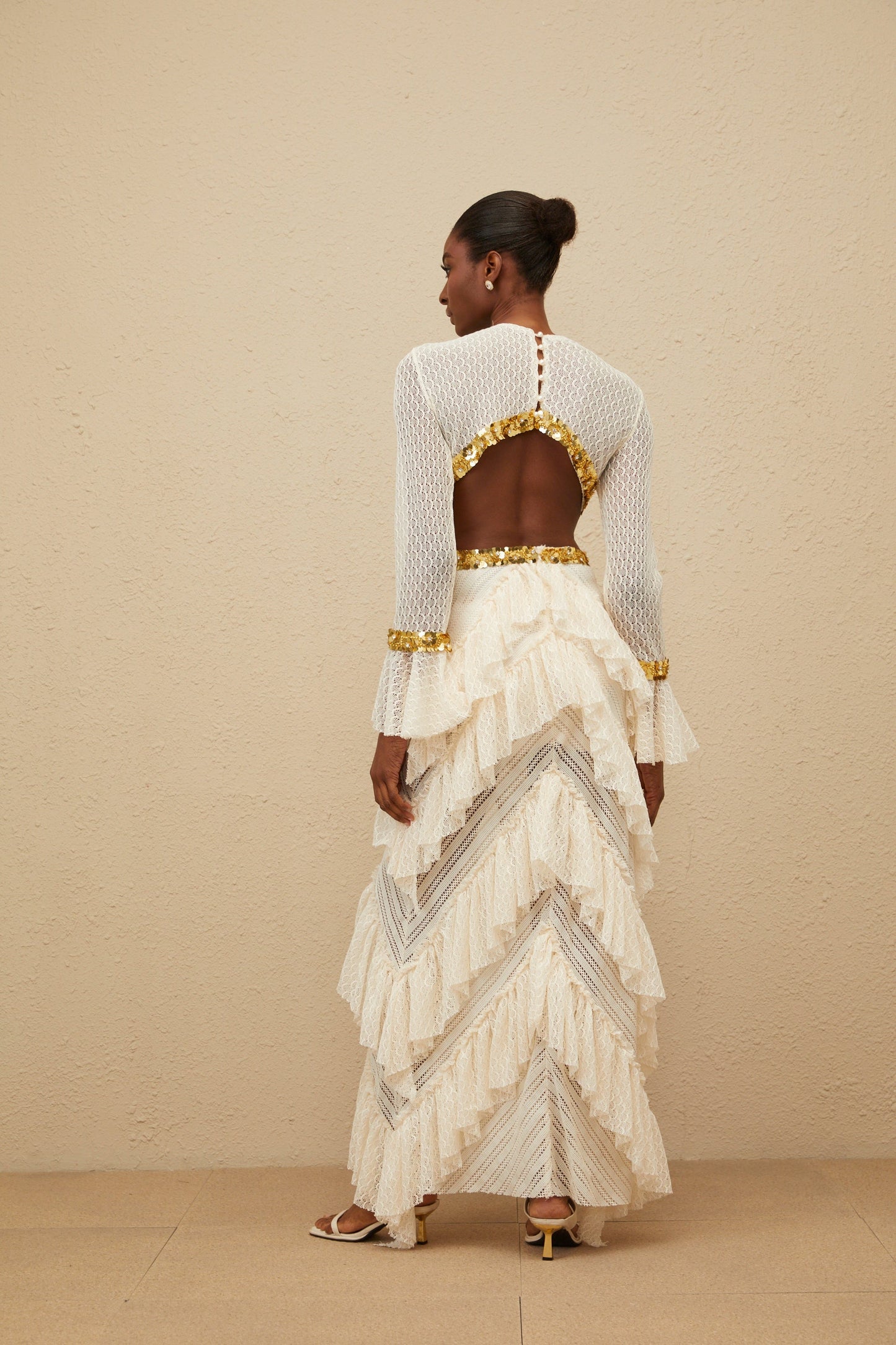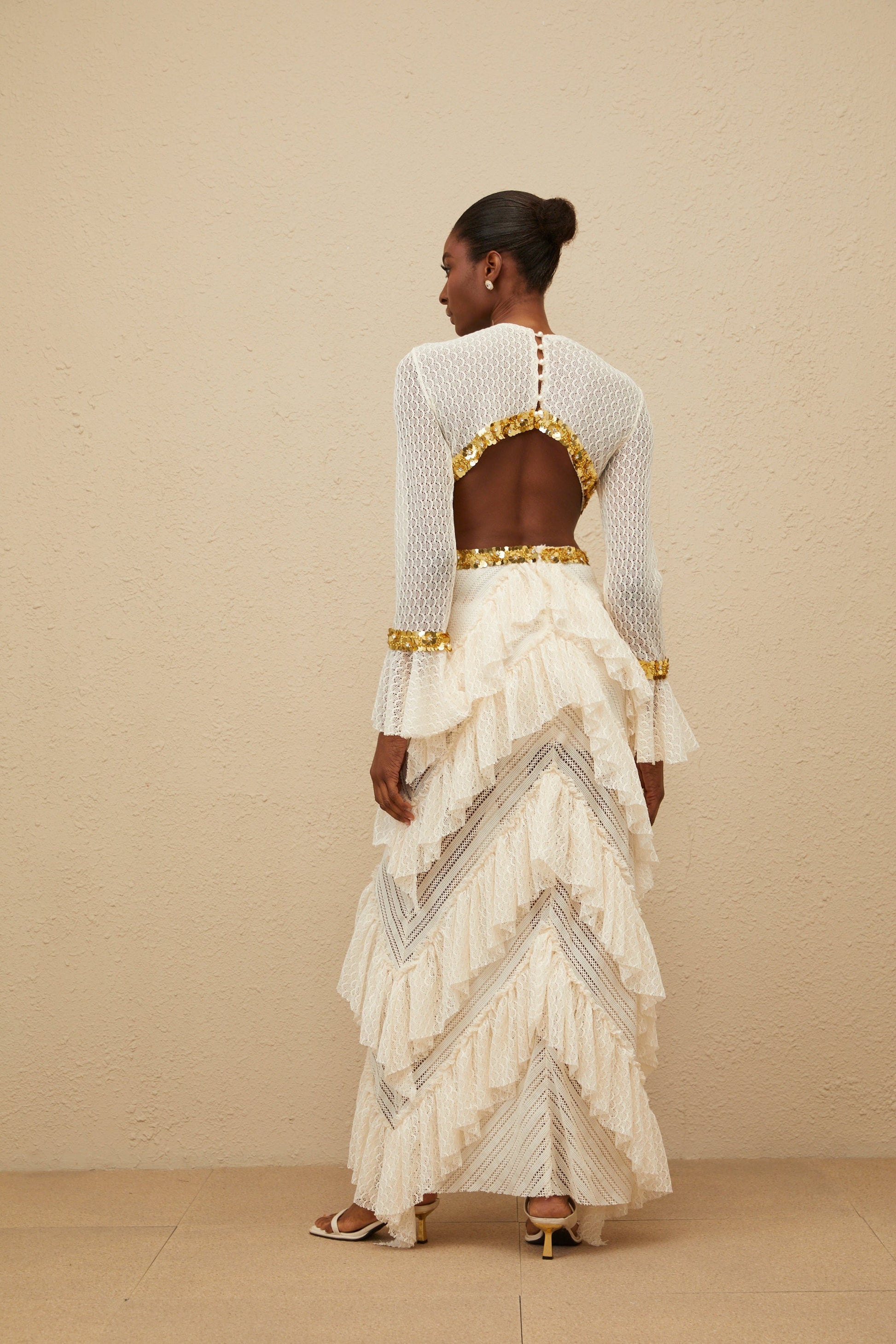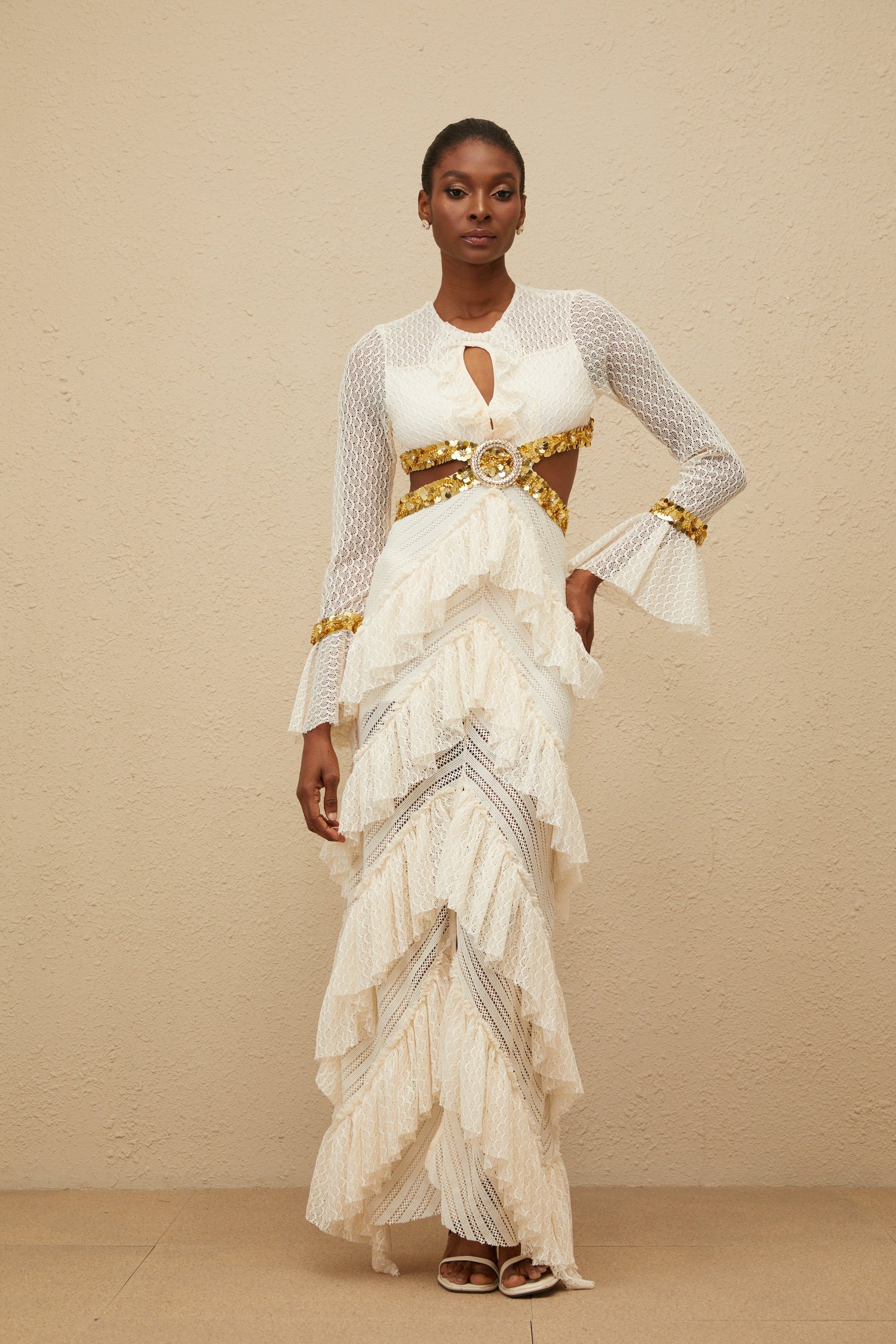 Dorée Neutral Ruffled Sequin Lace Maxi Dress