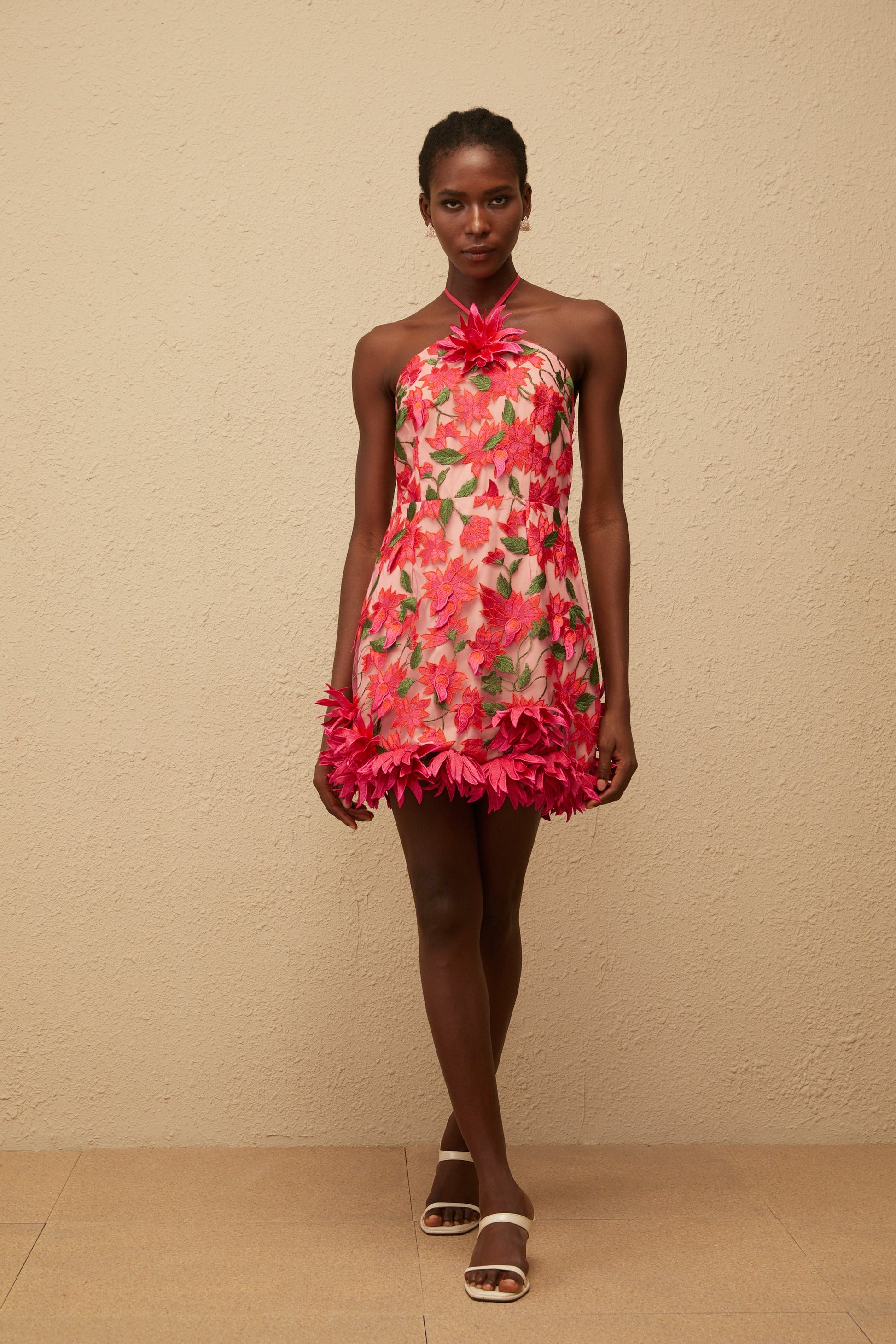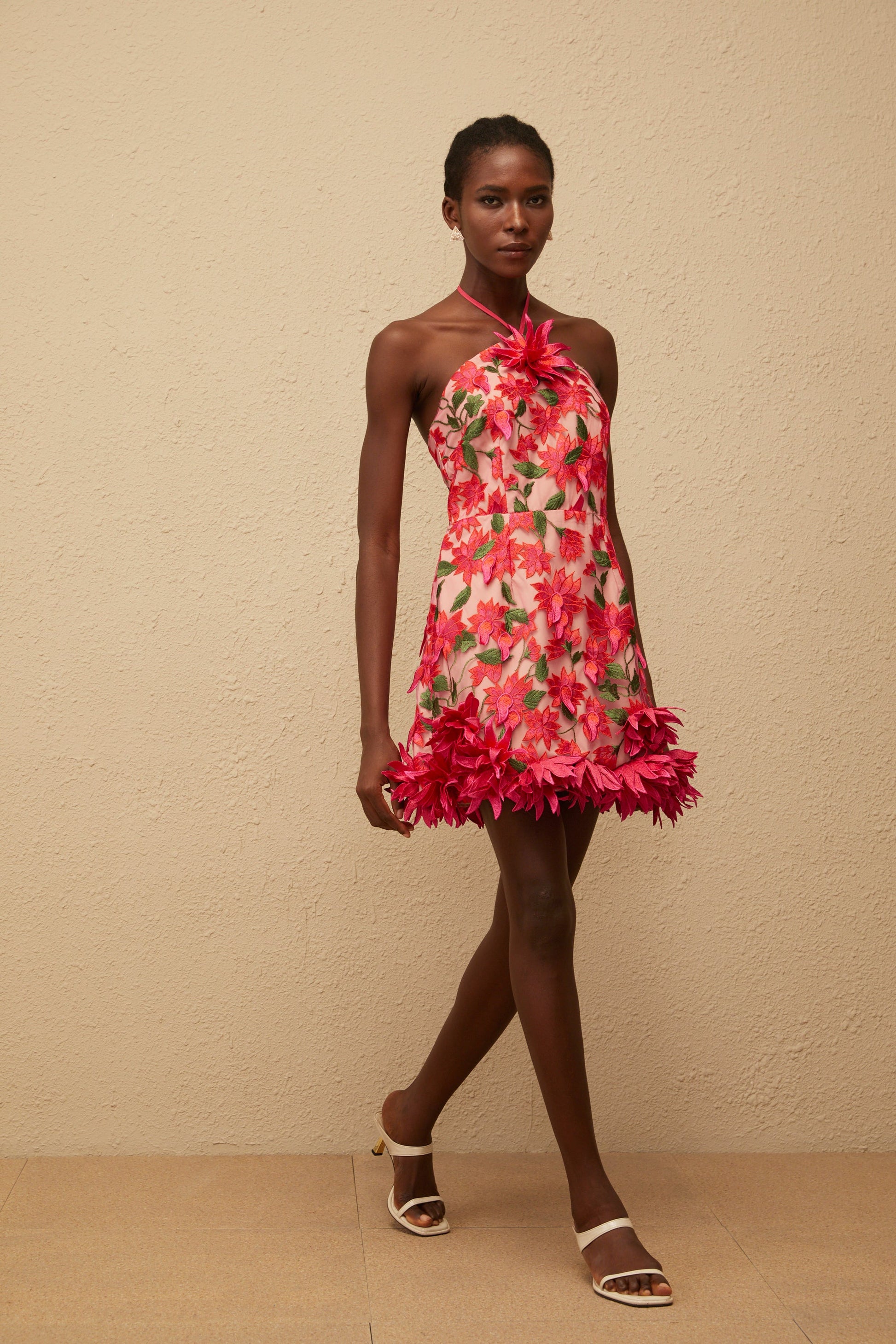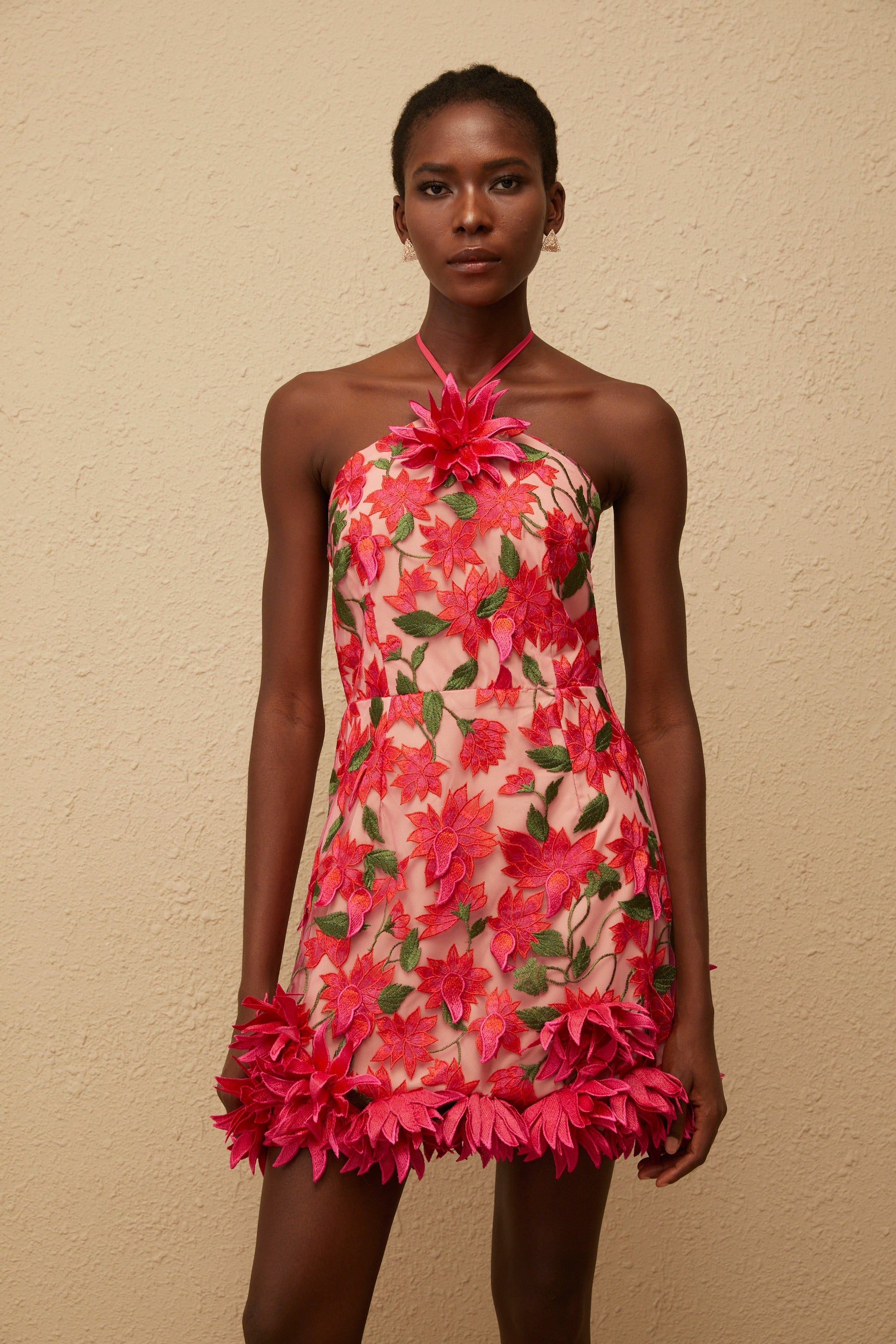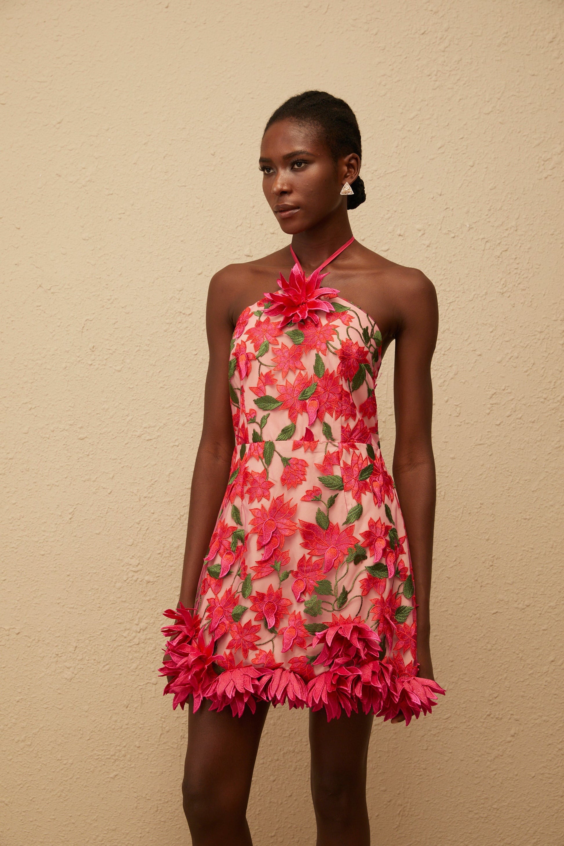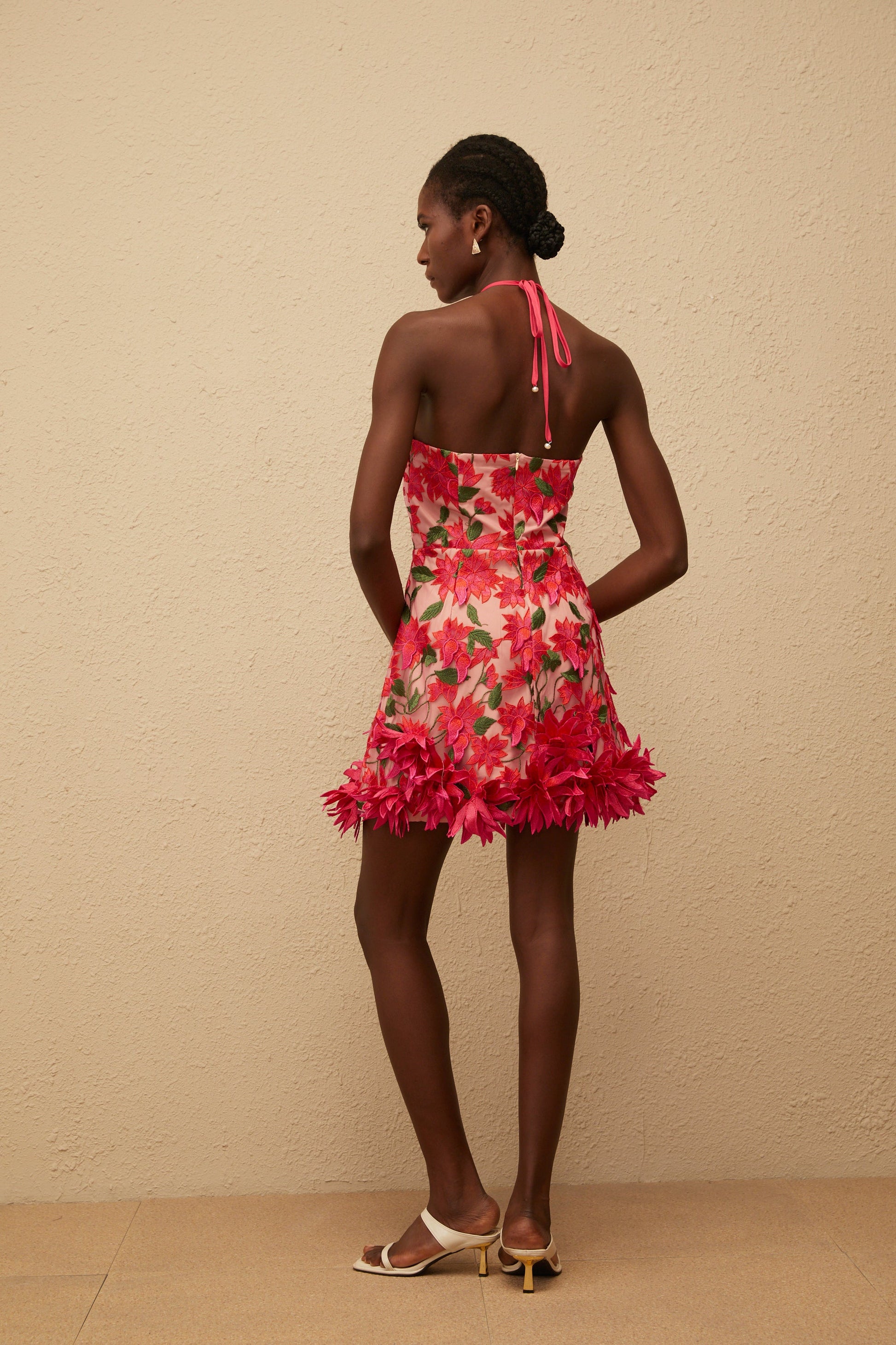 Doriane Red Halterneck Floral Embroidered Mini Dress