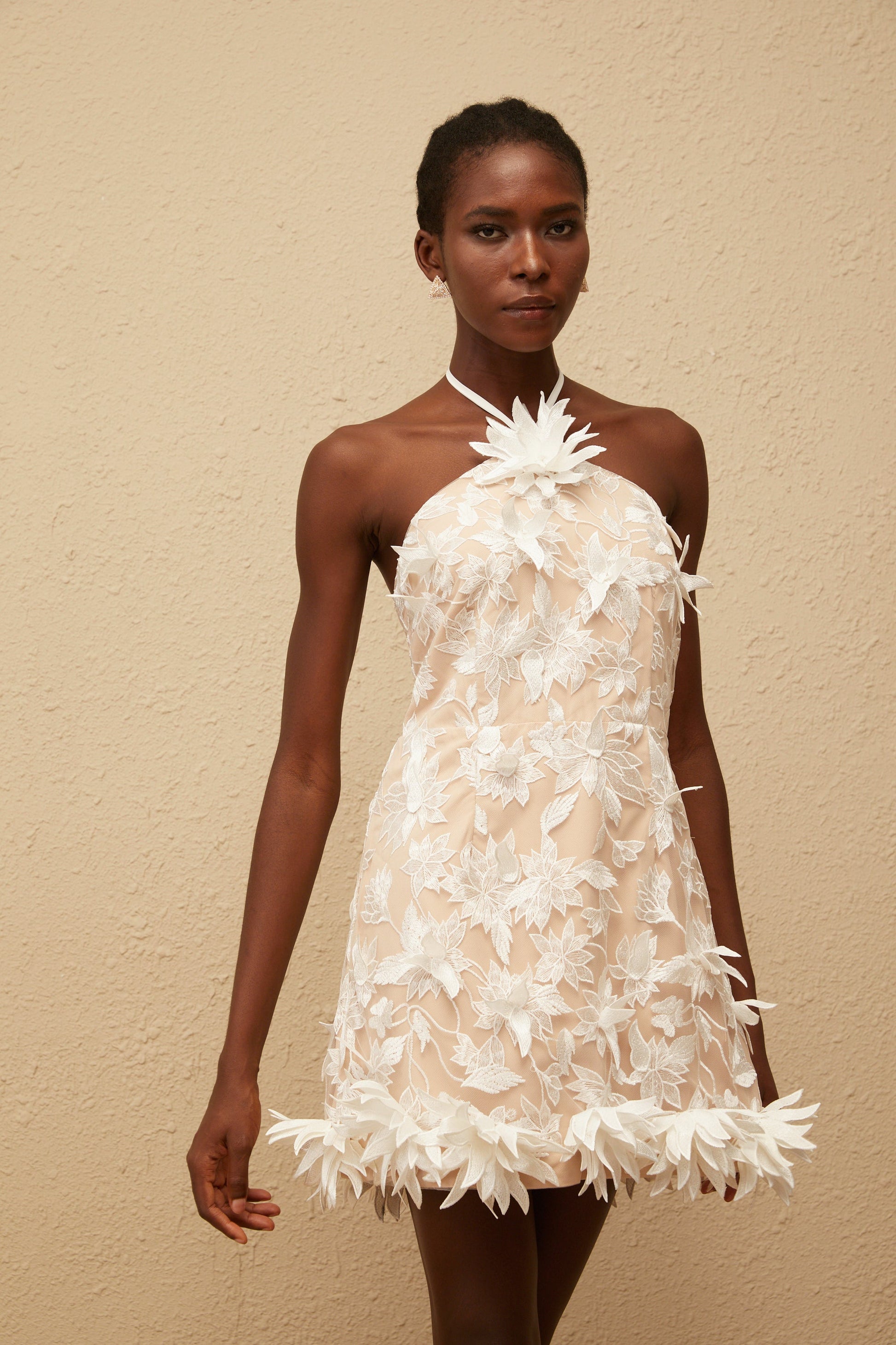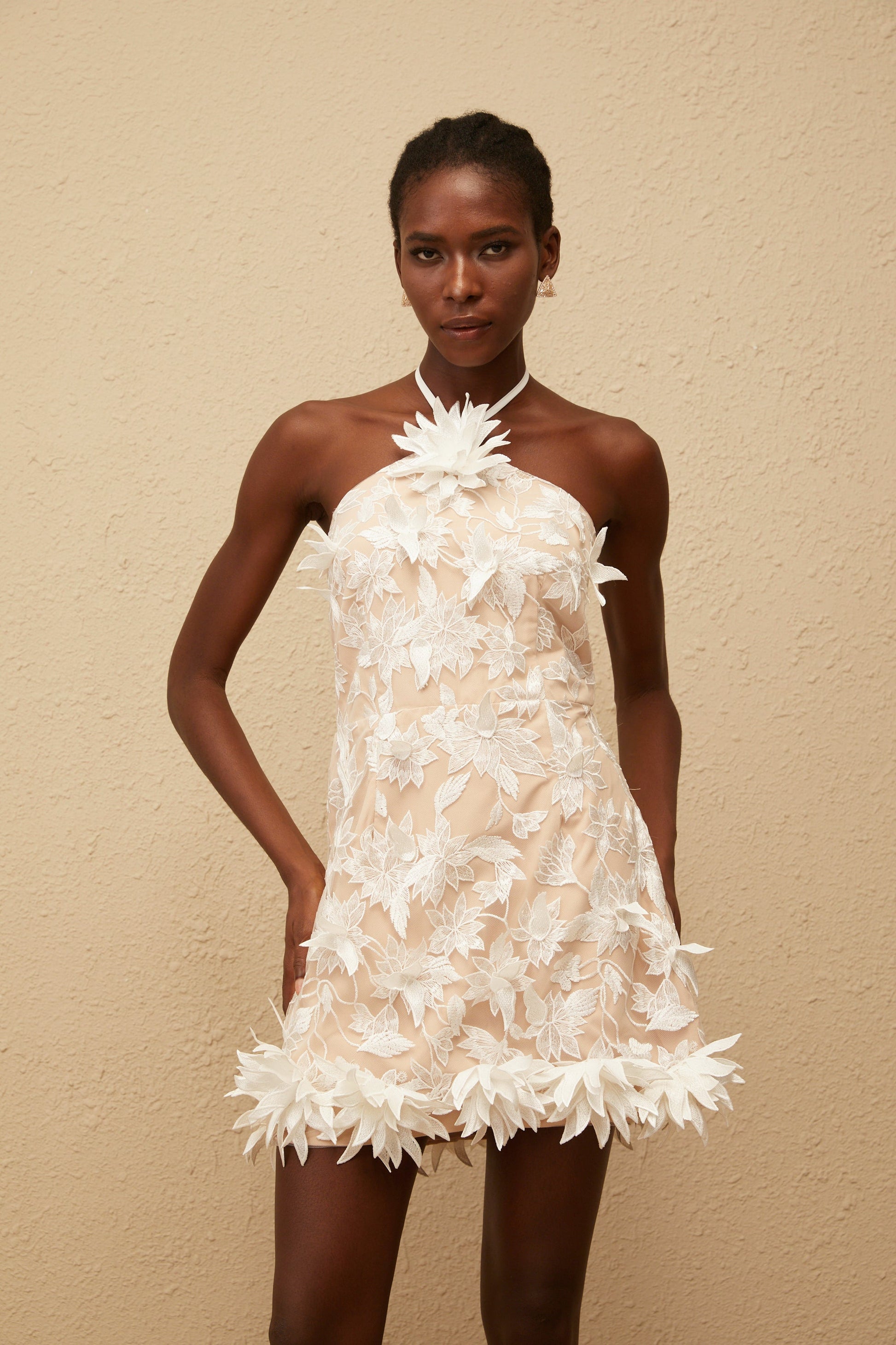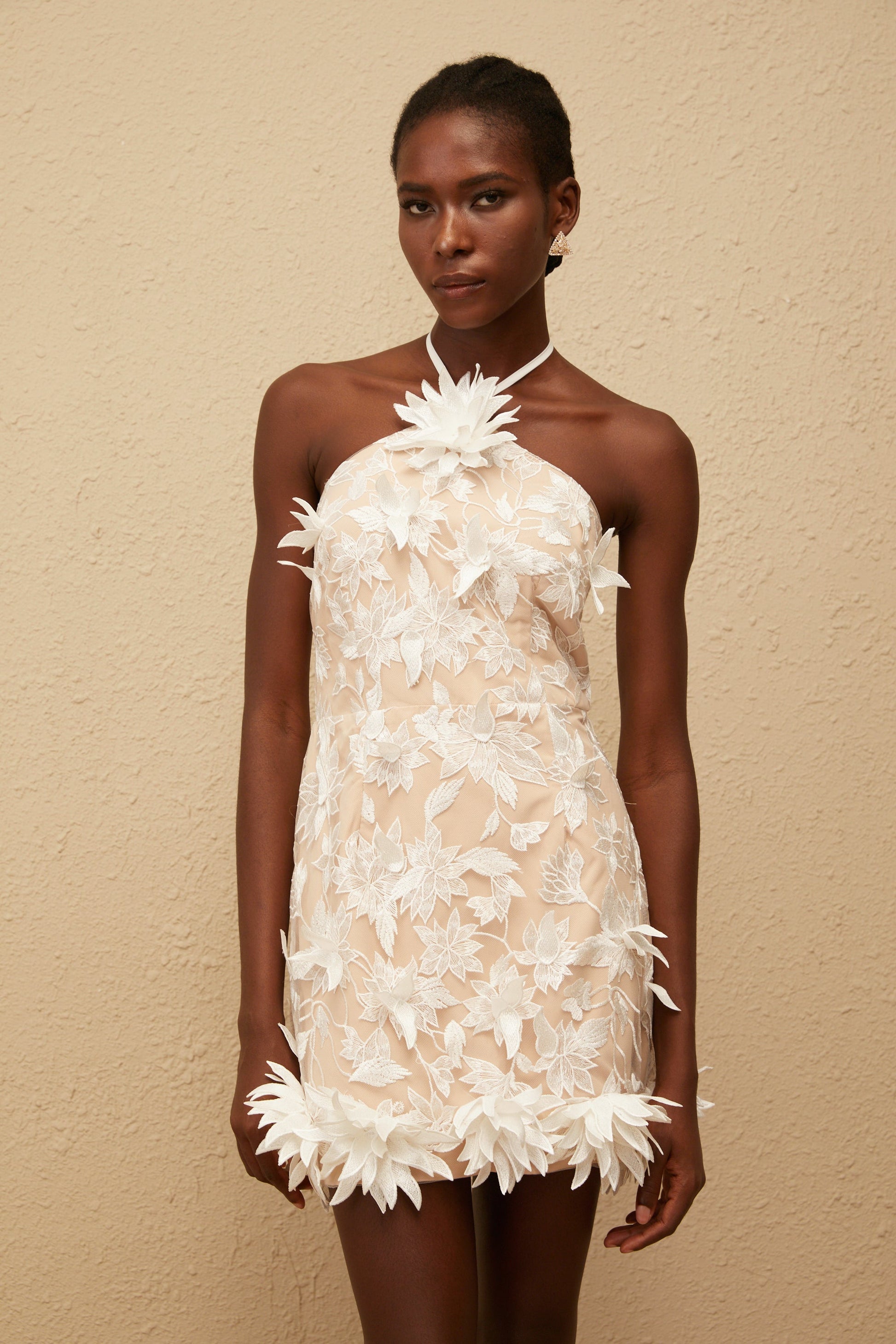 Doriane White Halterneck Floral Embroidered Mini Dress