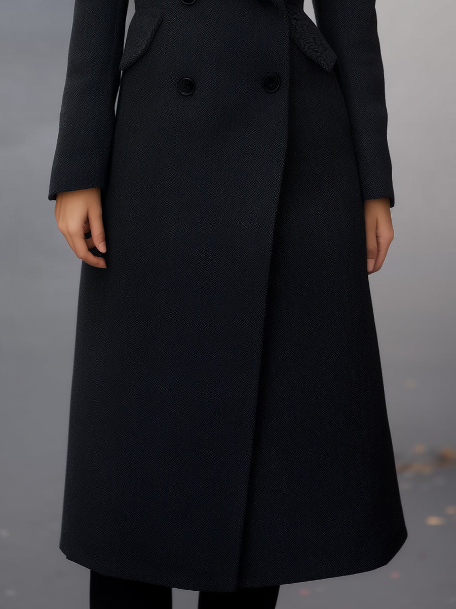 - Design: Longline cut with oversized shawl collar, double-breasted closure, flap waist pockets, and clean tailoring details