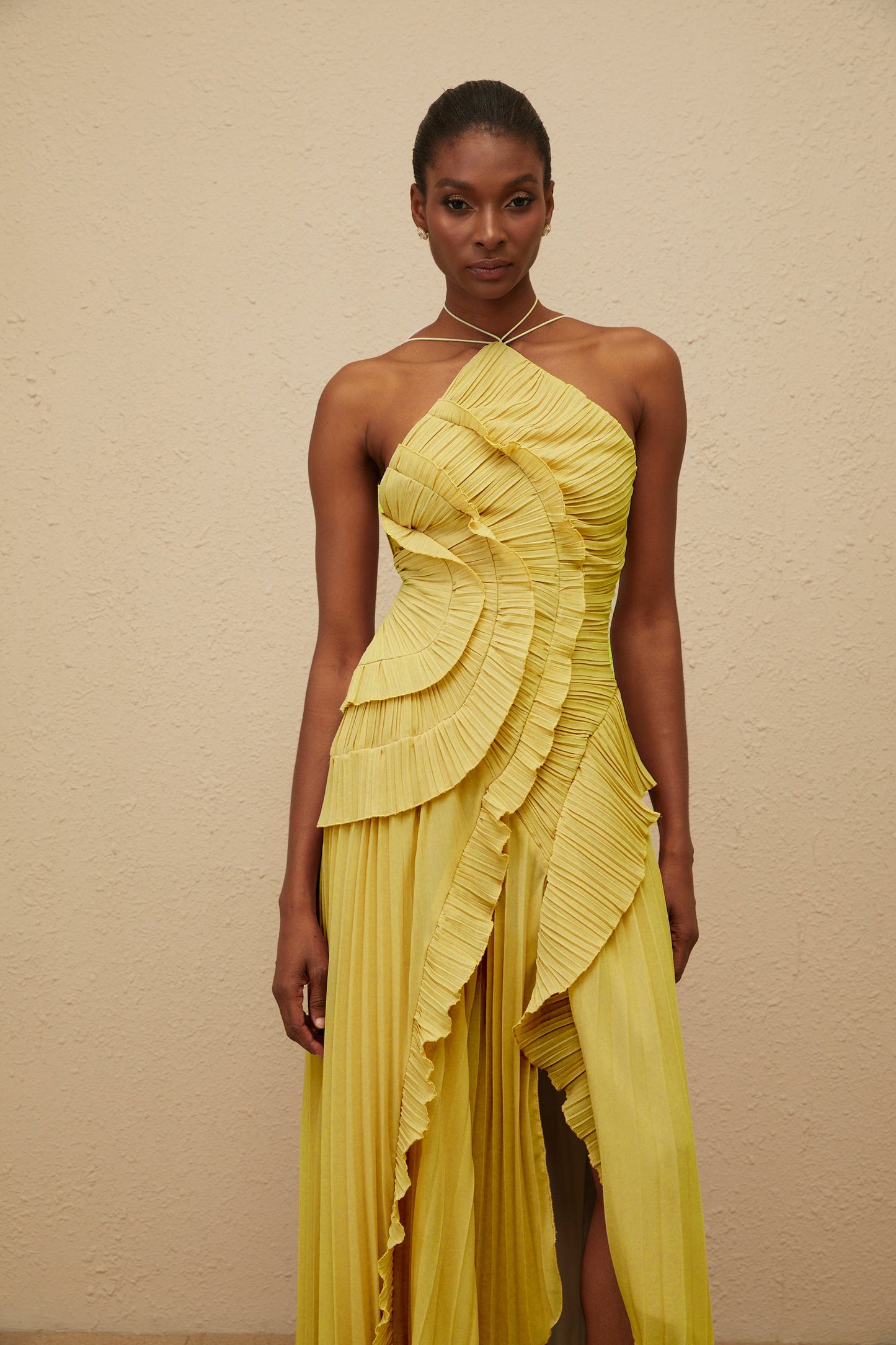 Doux Yellow Ruffled Trim Pleated Midi Dress
