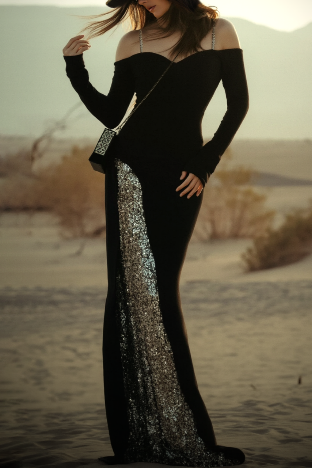 Shimmer with sophistication in this stunning black evening gown featuring a dramatic off-shoulder neckline and all-over sequin embellishments. The figure-skimming silhouette cascades into a flowing floor-length skirt, creating mesmerizing movement with every step. Perfect for galas or cocktail parties, this show-stopping dress pairs effortlessly with statement earrings and sleek heels for unforgettable glamour.