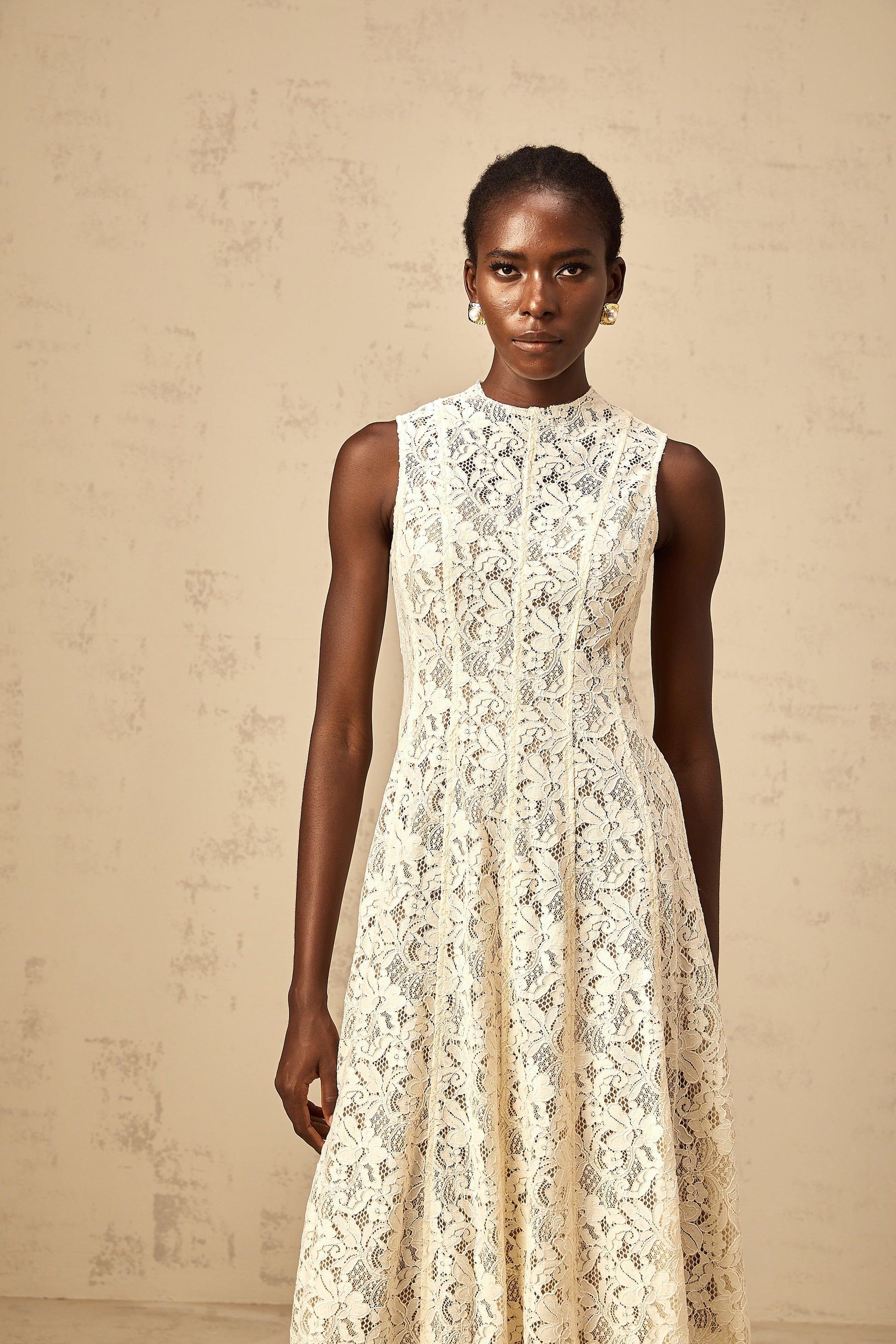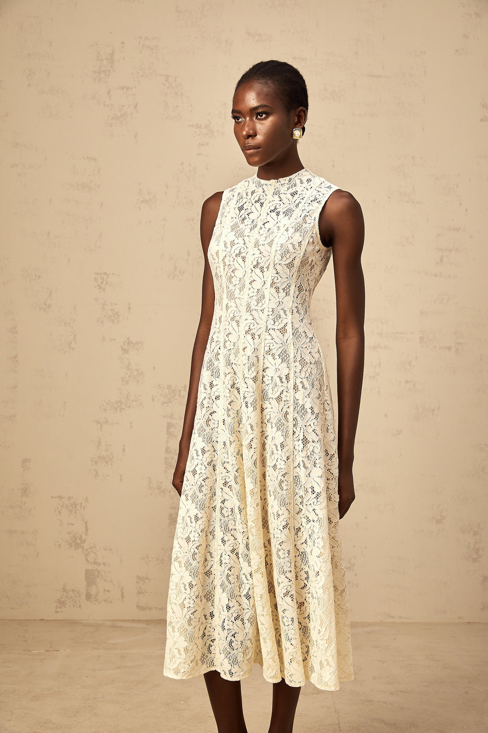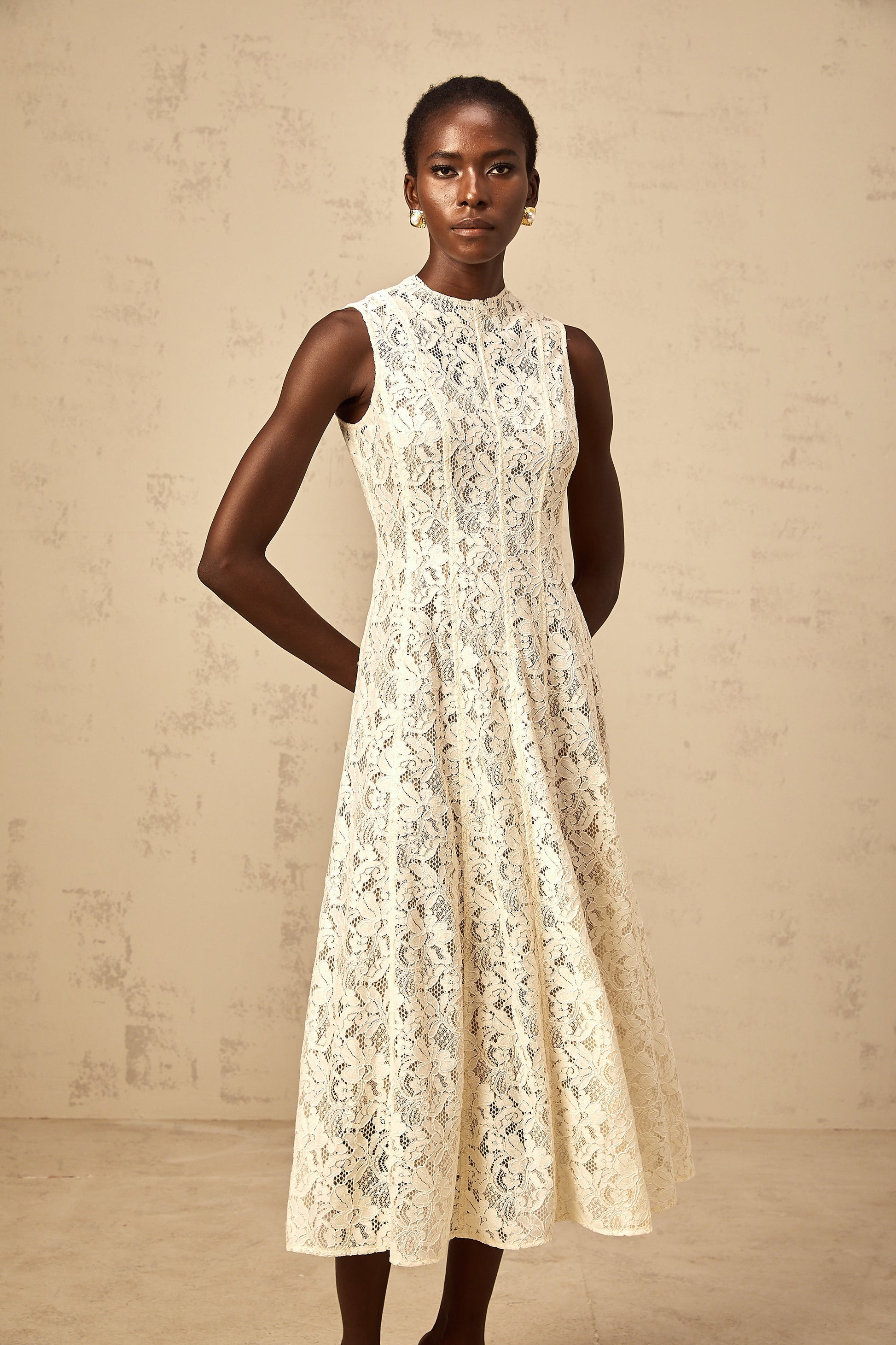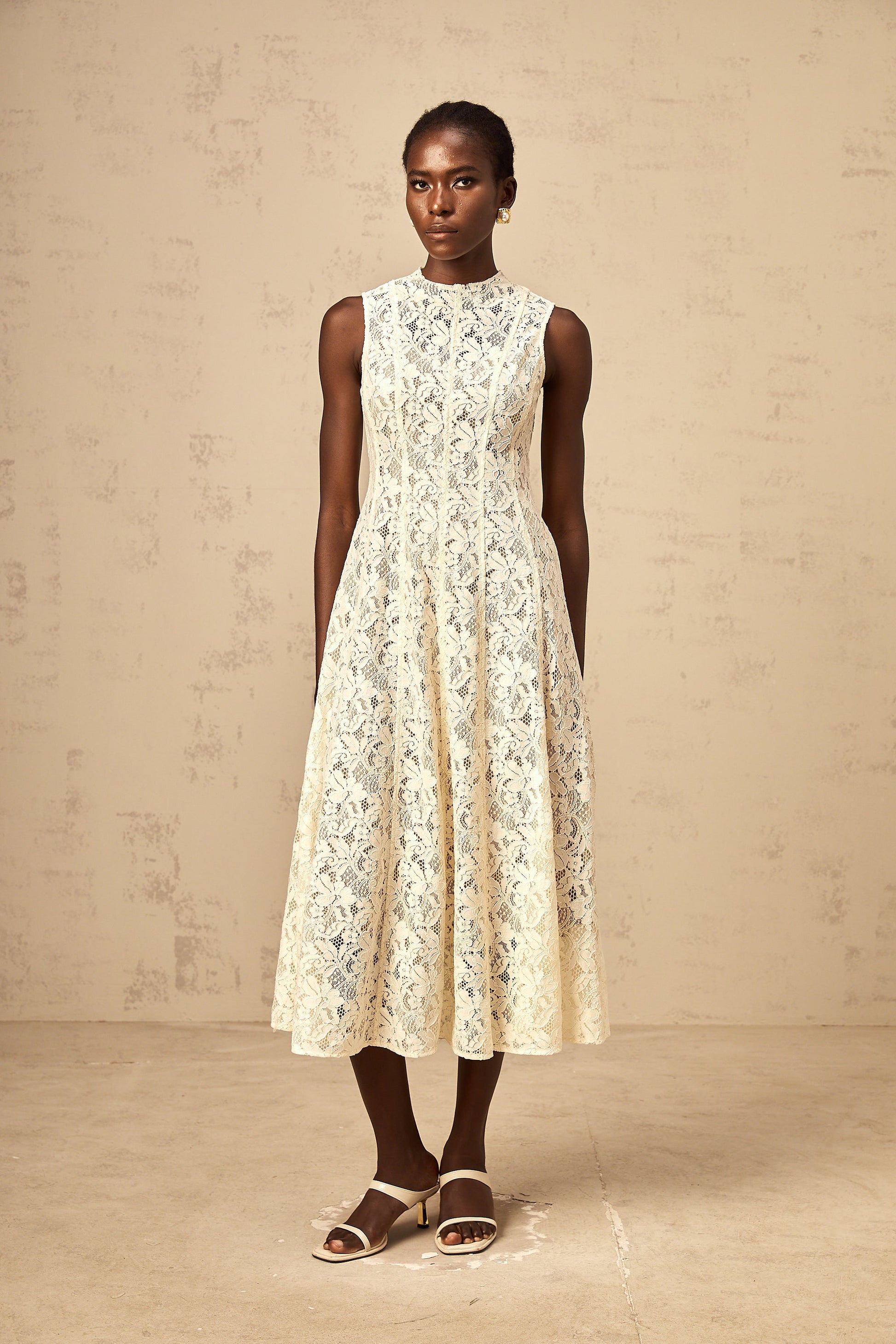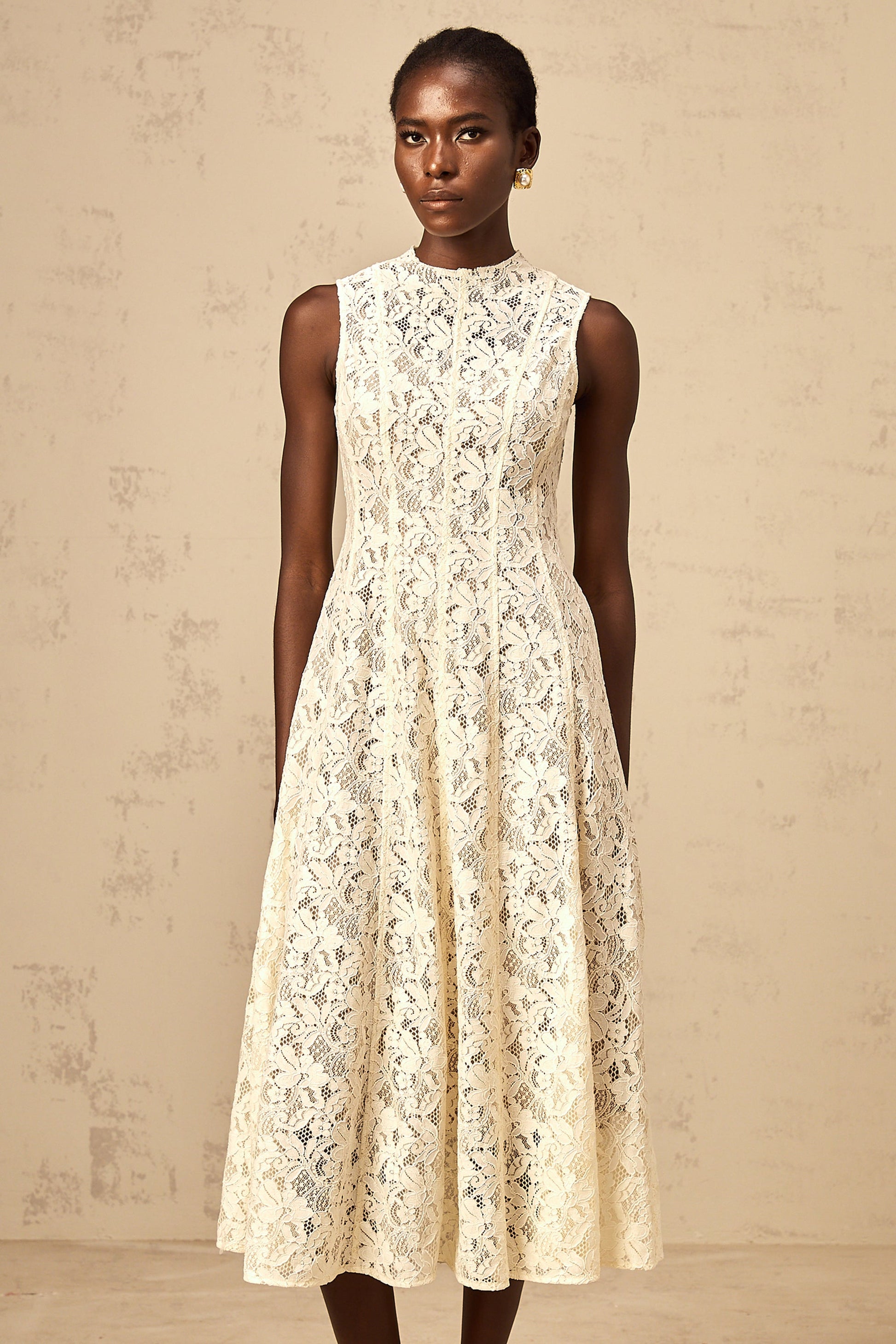 Edelie beige floral-lace flared midi dress