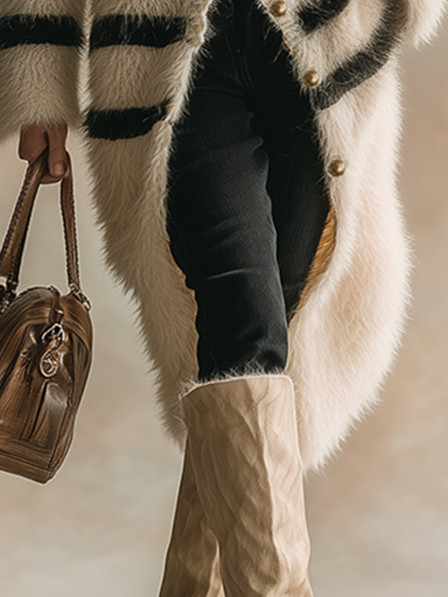 Elegant And Fashionable Off-white Striped Long-hair Knitted Dress Cardigan