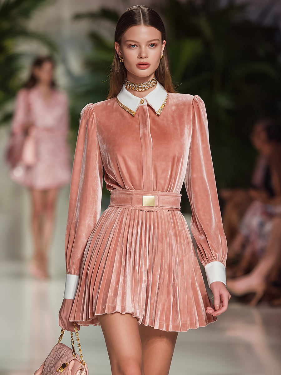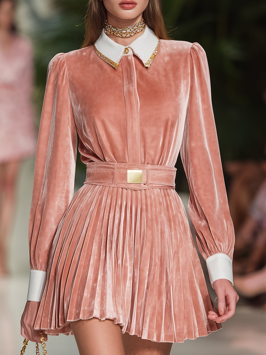 Elegant And Fashionable Pink Velvet Lapel Pleated Mini Dress