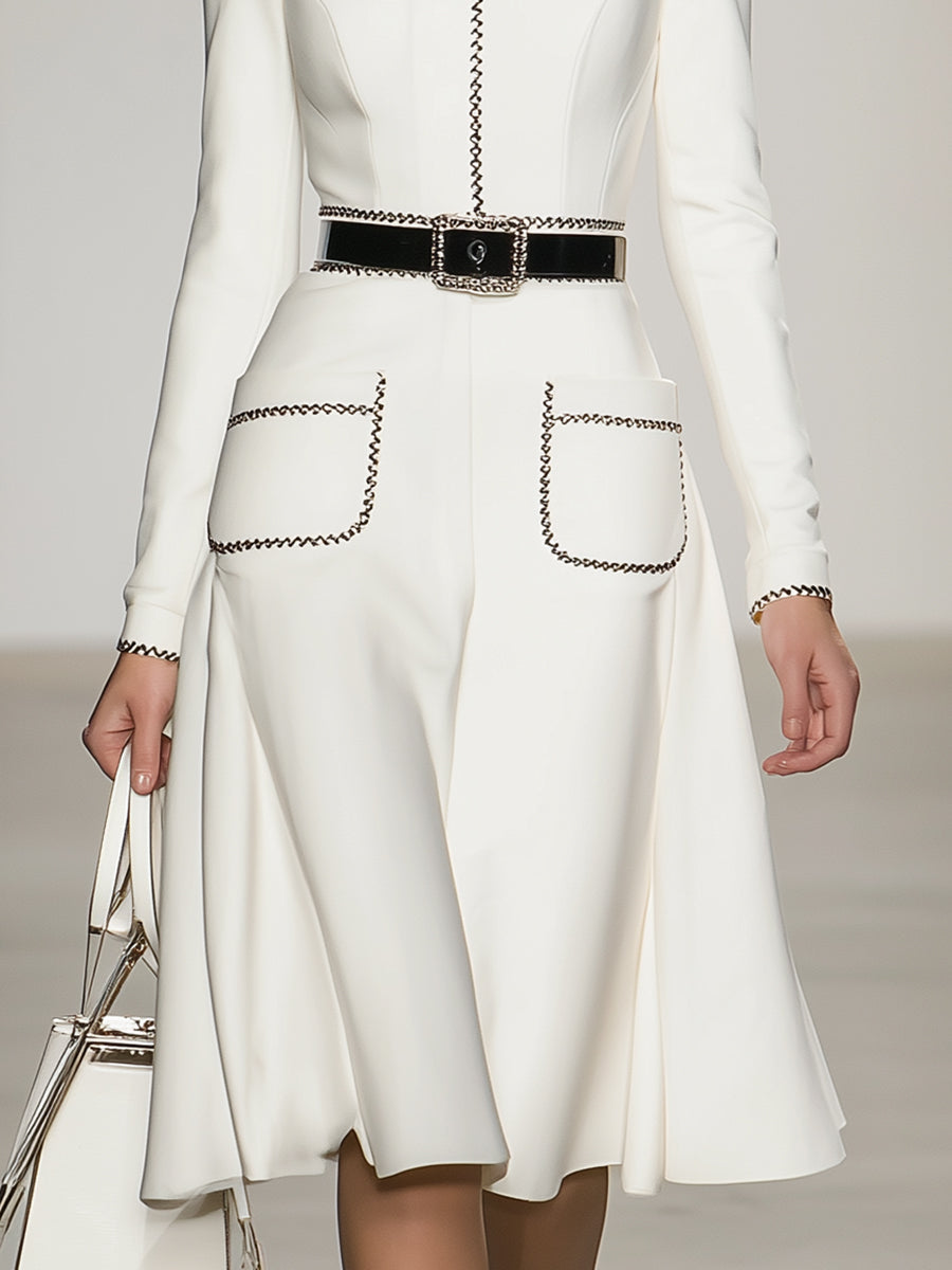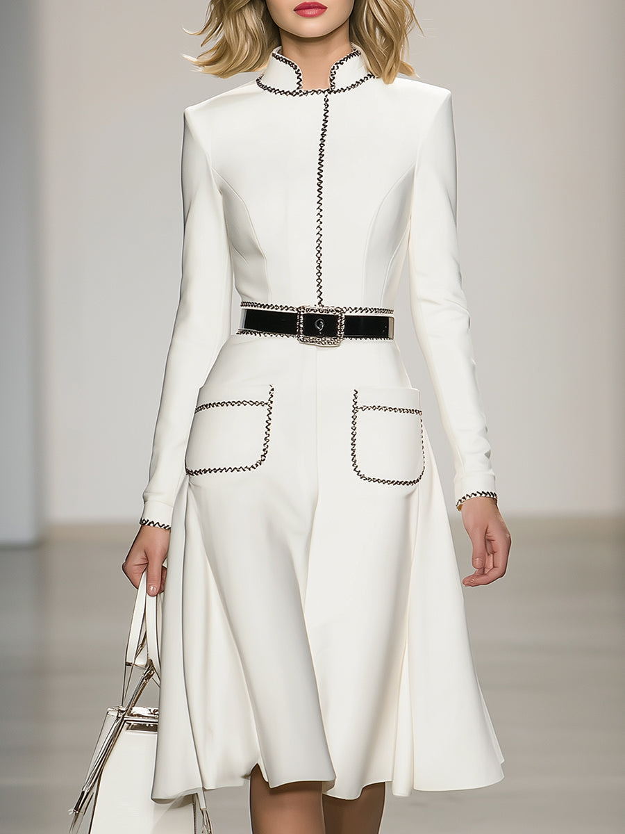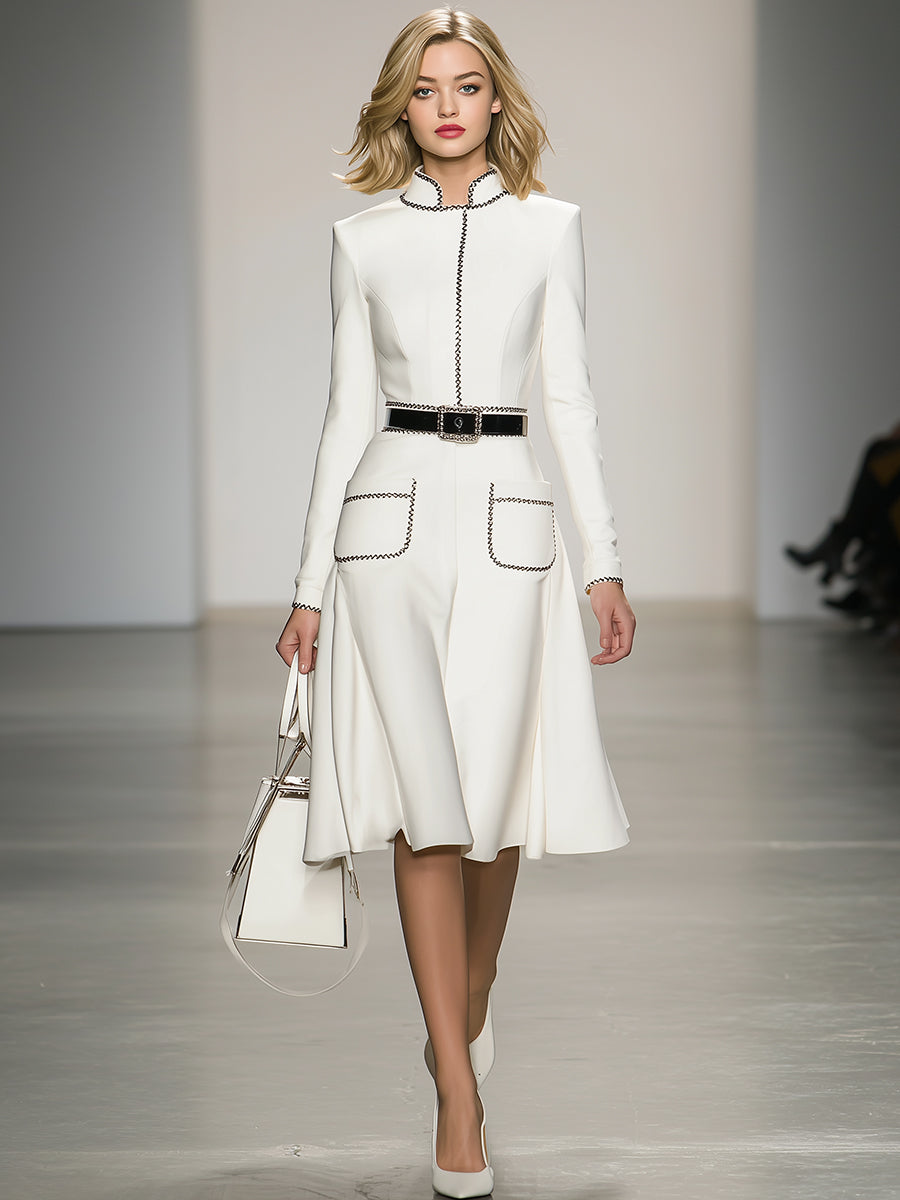 Elegant And Fashionable Stand-up Collar Black Stitching White Midi Dress