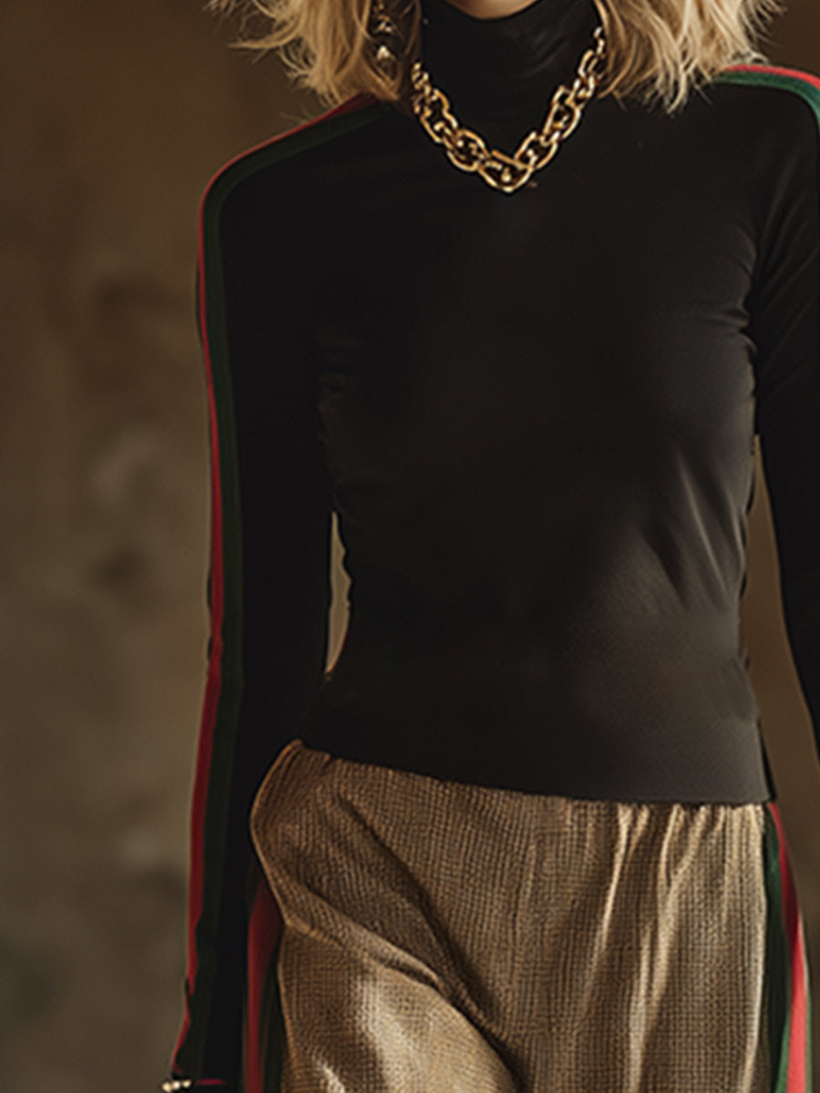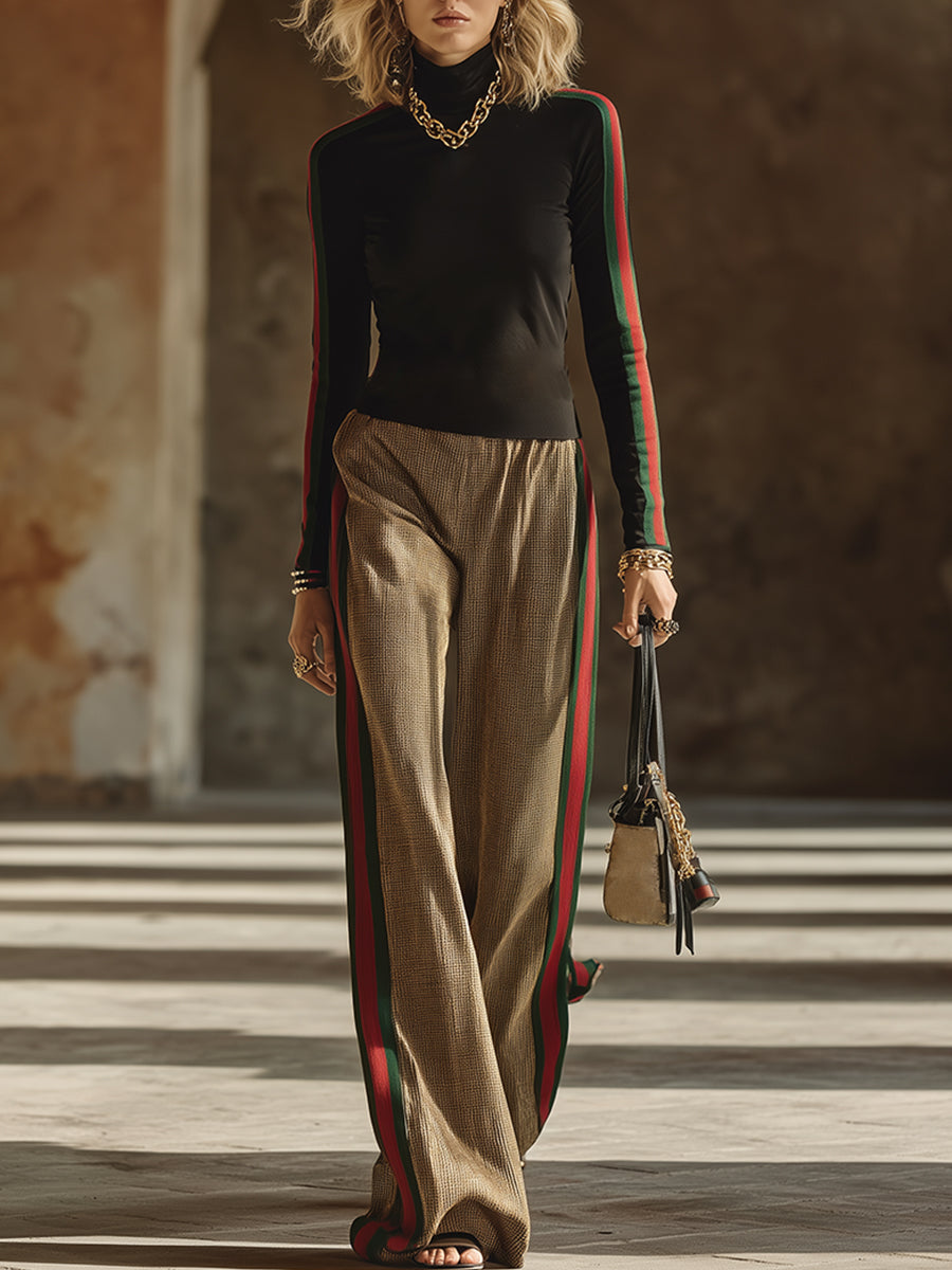 Elegant And Fashionable Striped Trim Black Stand-up Collar T-shirt And Trousers Set