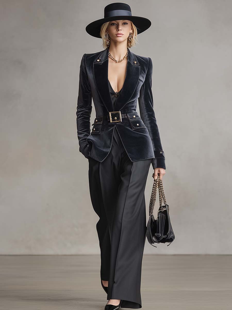 This Elegant and Stylish Peaked Lapel Blazer is a statement piece that stands out with its dark blue velvet fabric and unique X-shaped design. The luxurious feel of velvet combined with the sophisticated peaked lapel gives this blazer an unparalleled elegance. The belt buckle decor adds a fashionable touch, making it more than just a standard blazer.